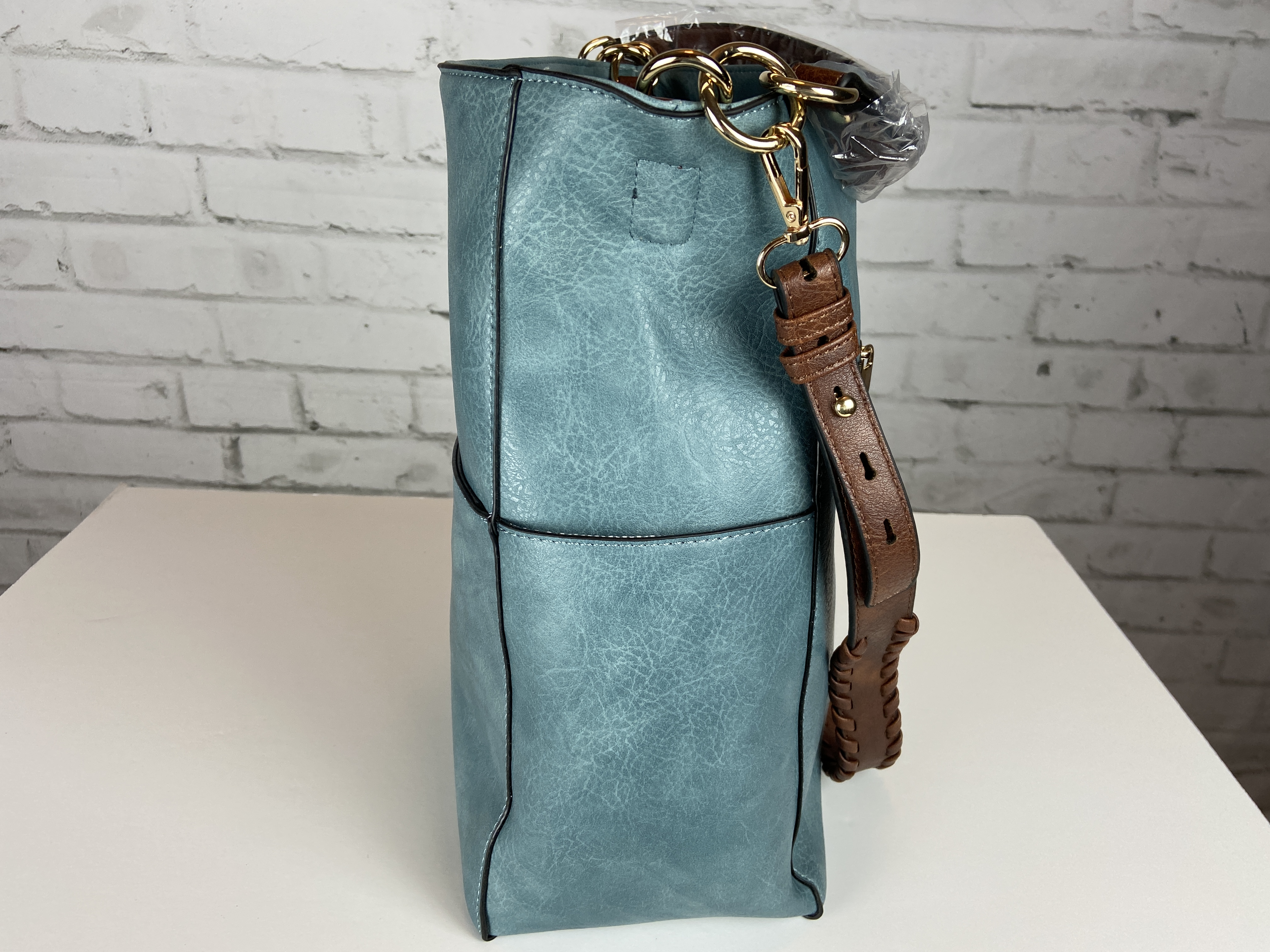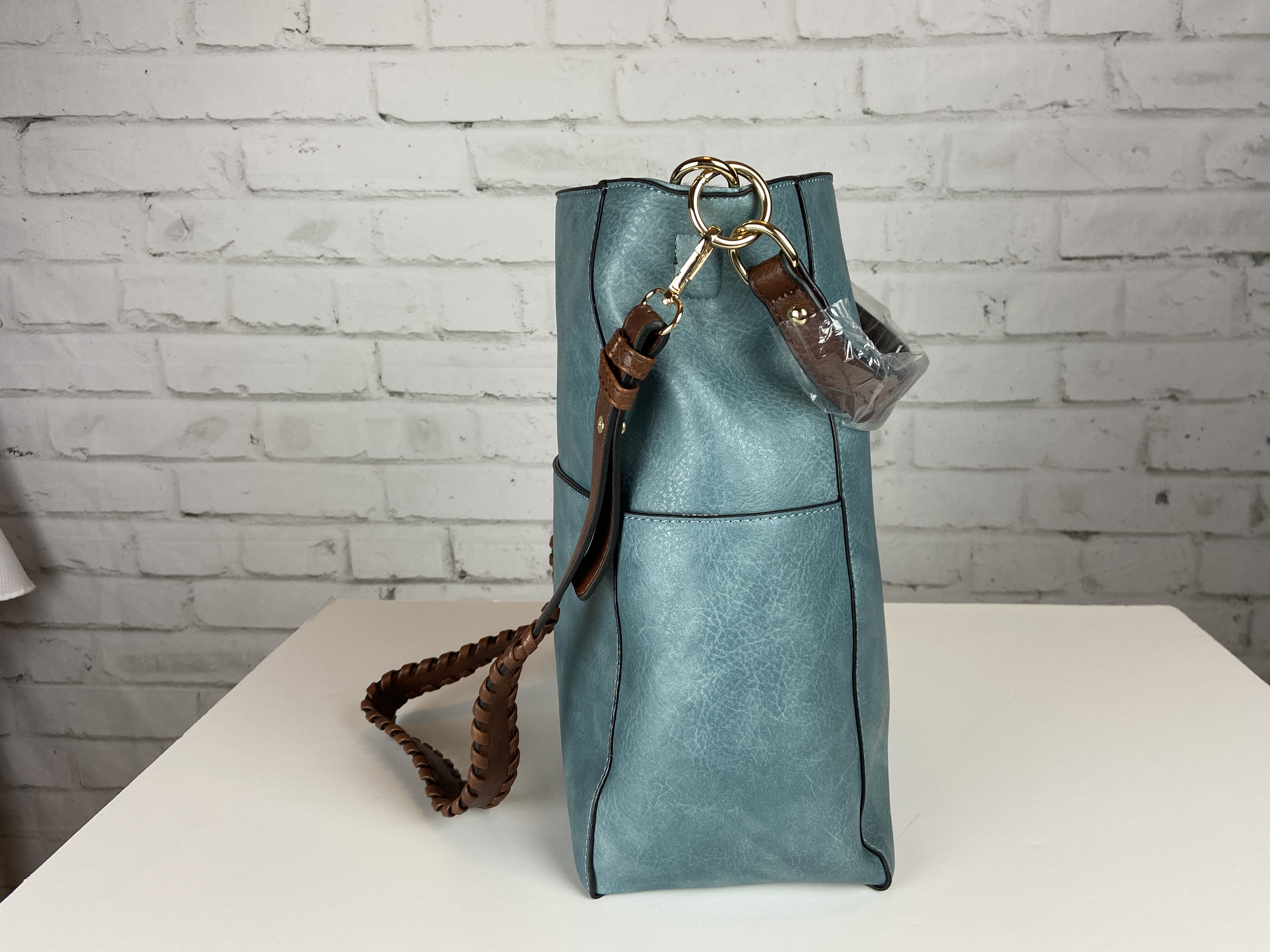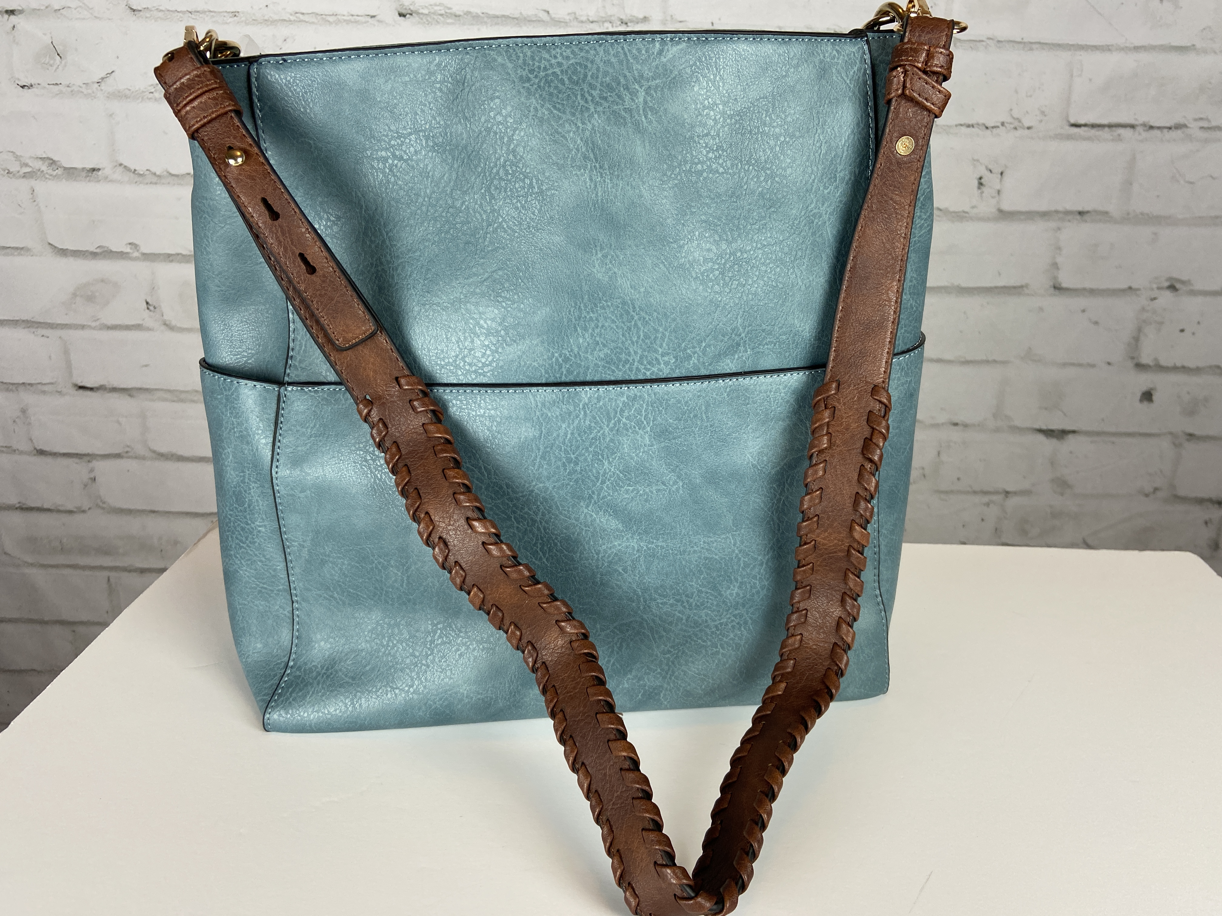 Blue Hobo handbag, brown braided adjustable extra strap, large front pocket, zipper back pocket and two side pockets on the outside. Secure with zipper entry, multiple storage on the inside compartment. Heavy gold hardware premium feel soft faux leather. This is a great size purse, color is a rich lighter blue perfect for year round use. Blue is a color for all seasons. 16.9 x 5.7 x 13 comes with dust cover.