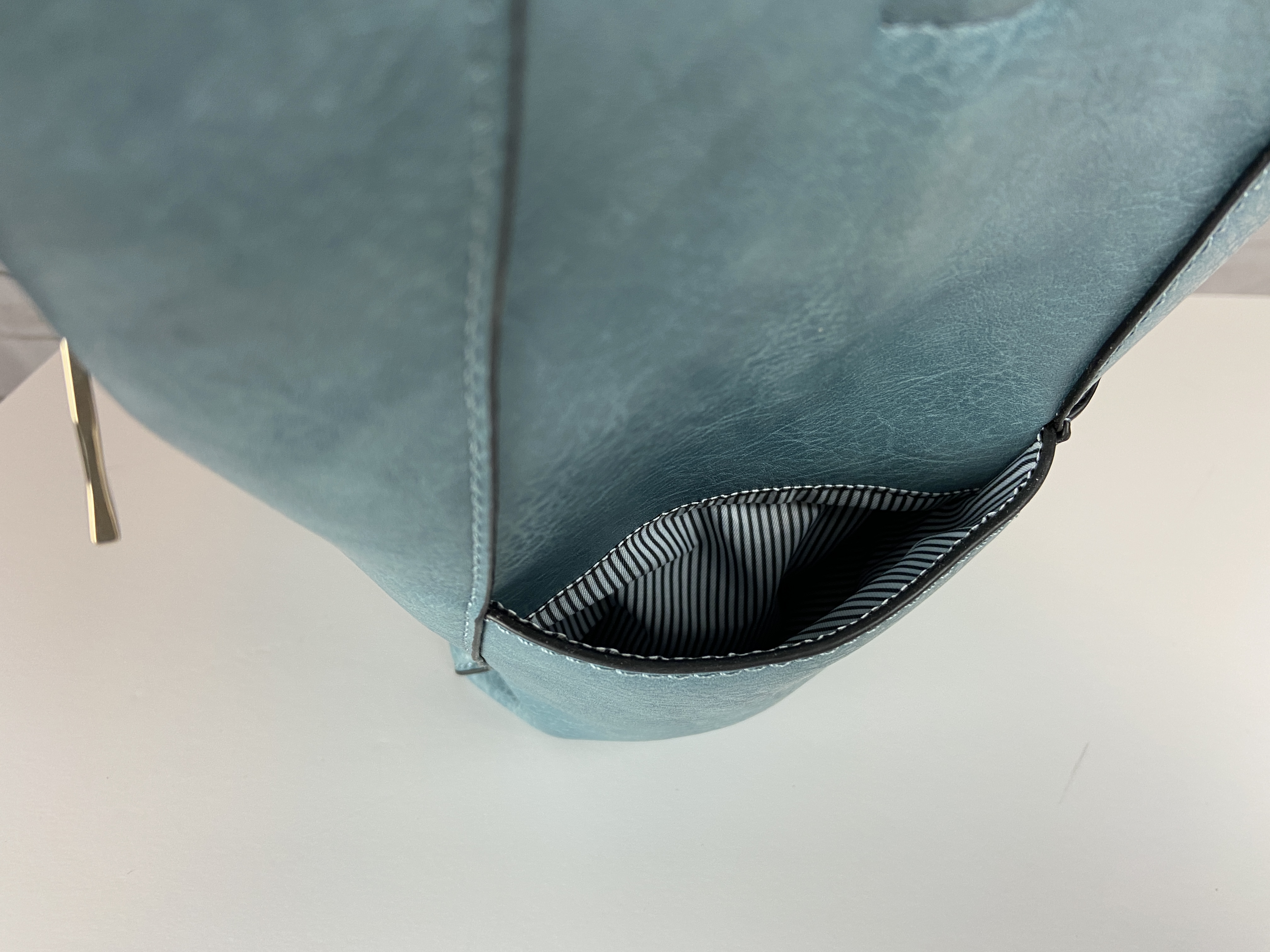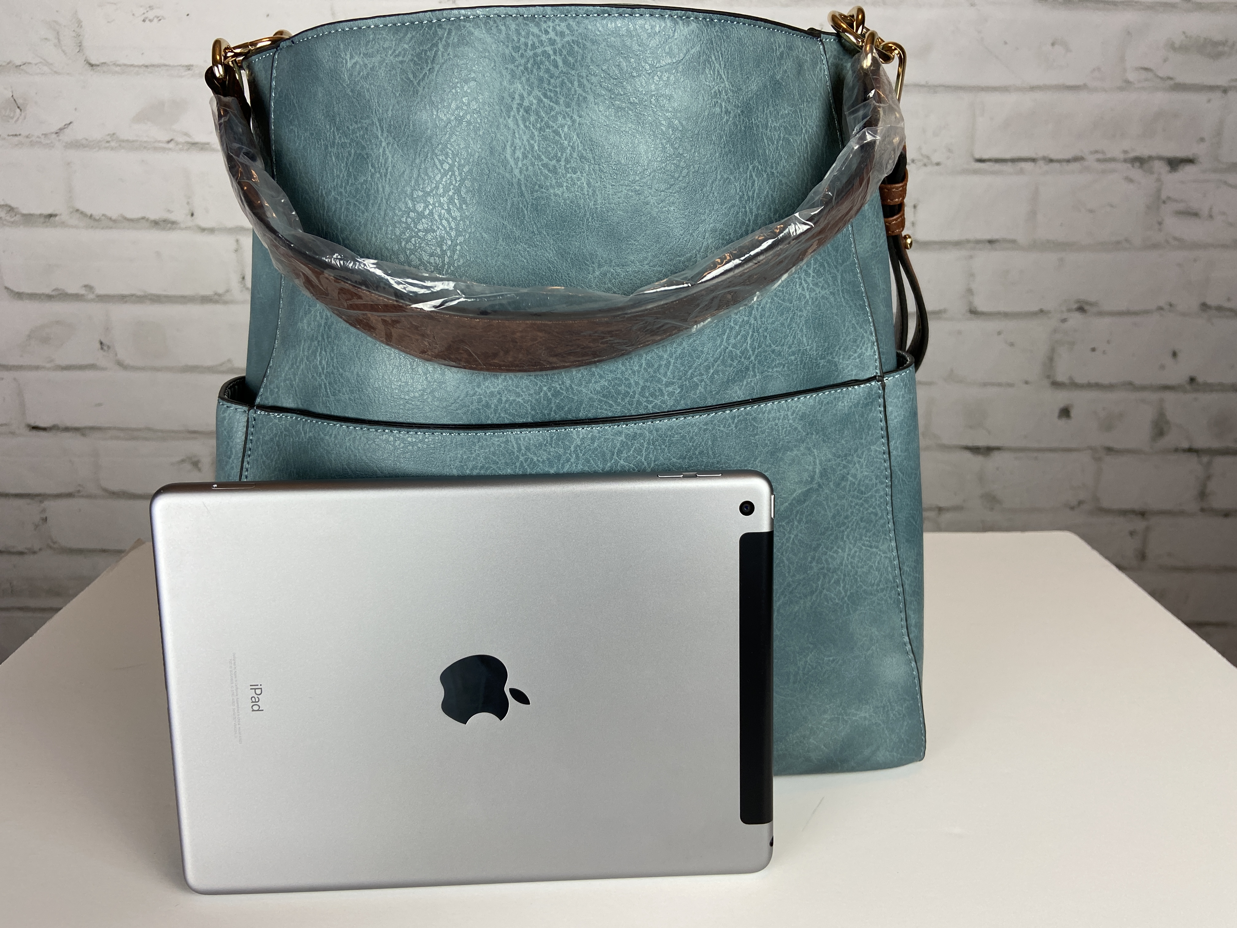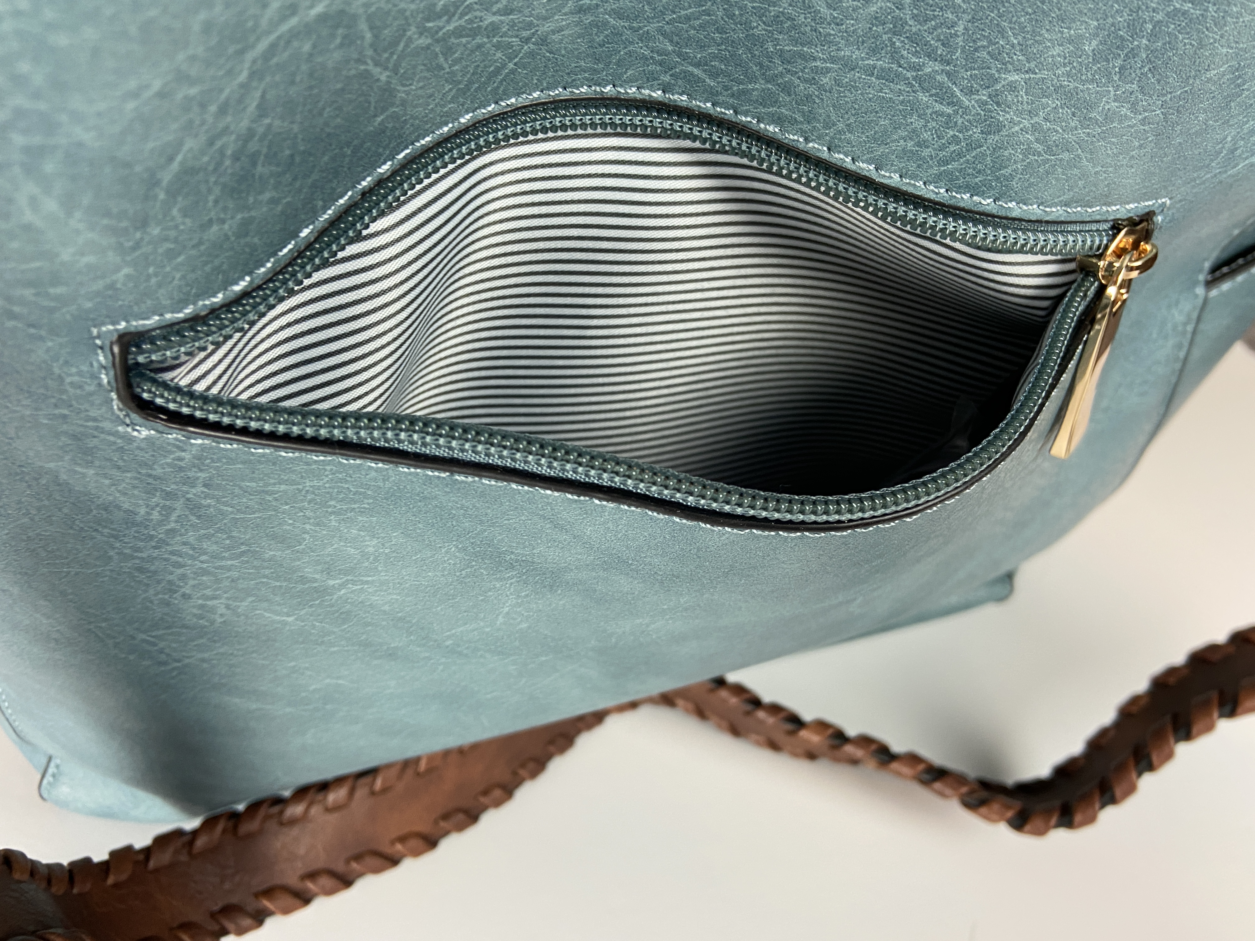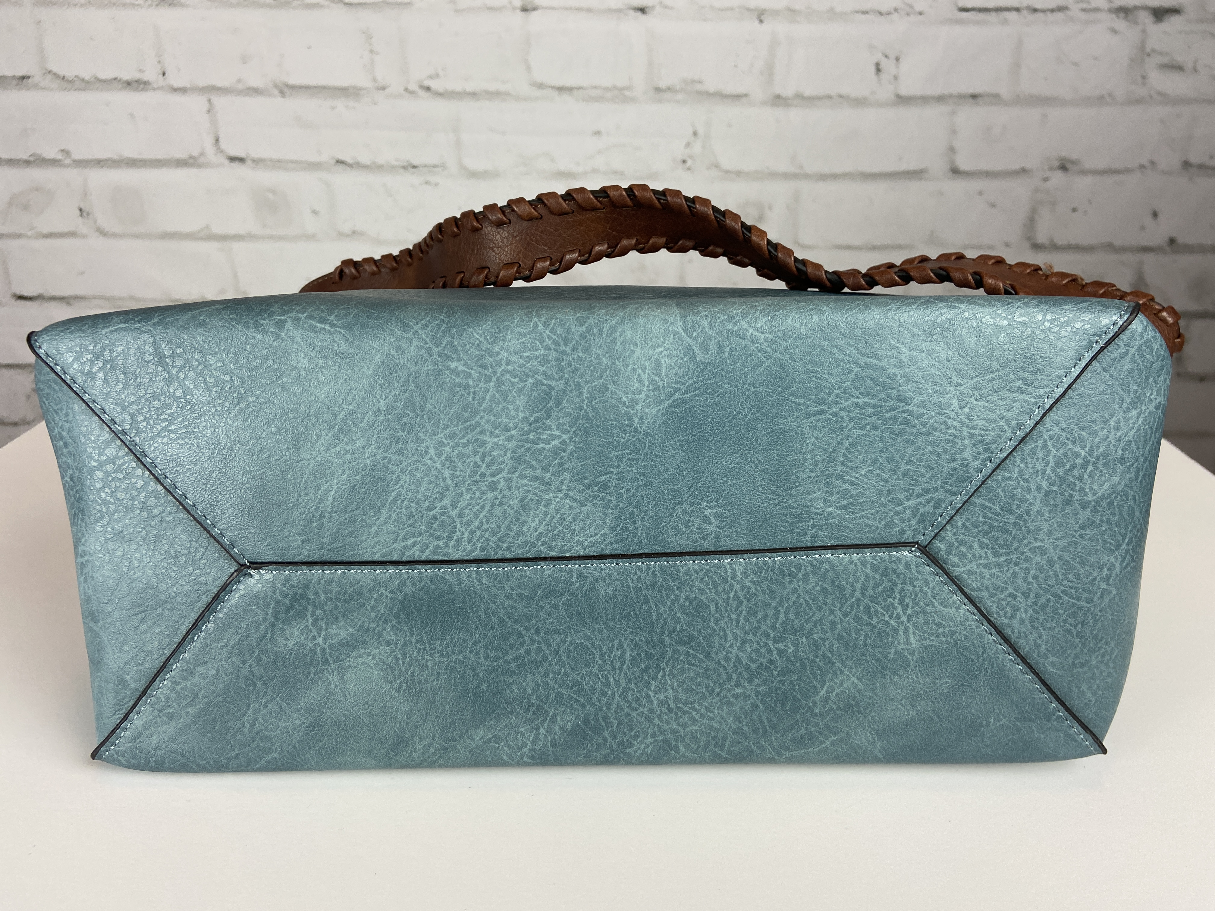 Blue Hobo handbag, brown braided adjustable extra strap, large front pocket, zipper back pocket and two side pockets on the outside. Secure with zipper entry, multiple storage on the inside compartment. Heavy gold hardware premium feel soft faux leather. This is a great size purse, color is a rich lighter blue perfect for year round use. Blue is a color for all seasons. 16.9 x 5.7 x 13 comes with dust cover.