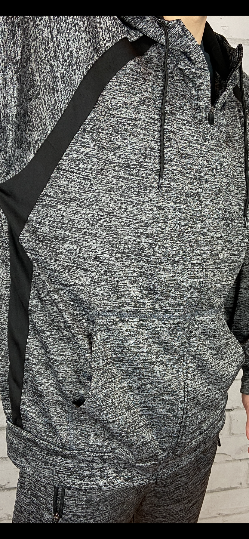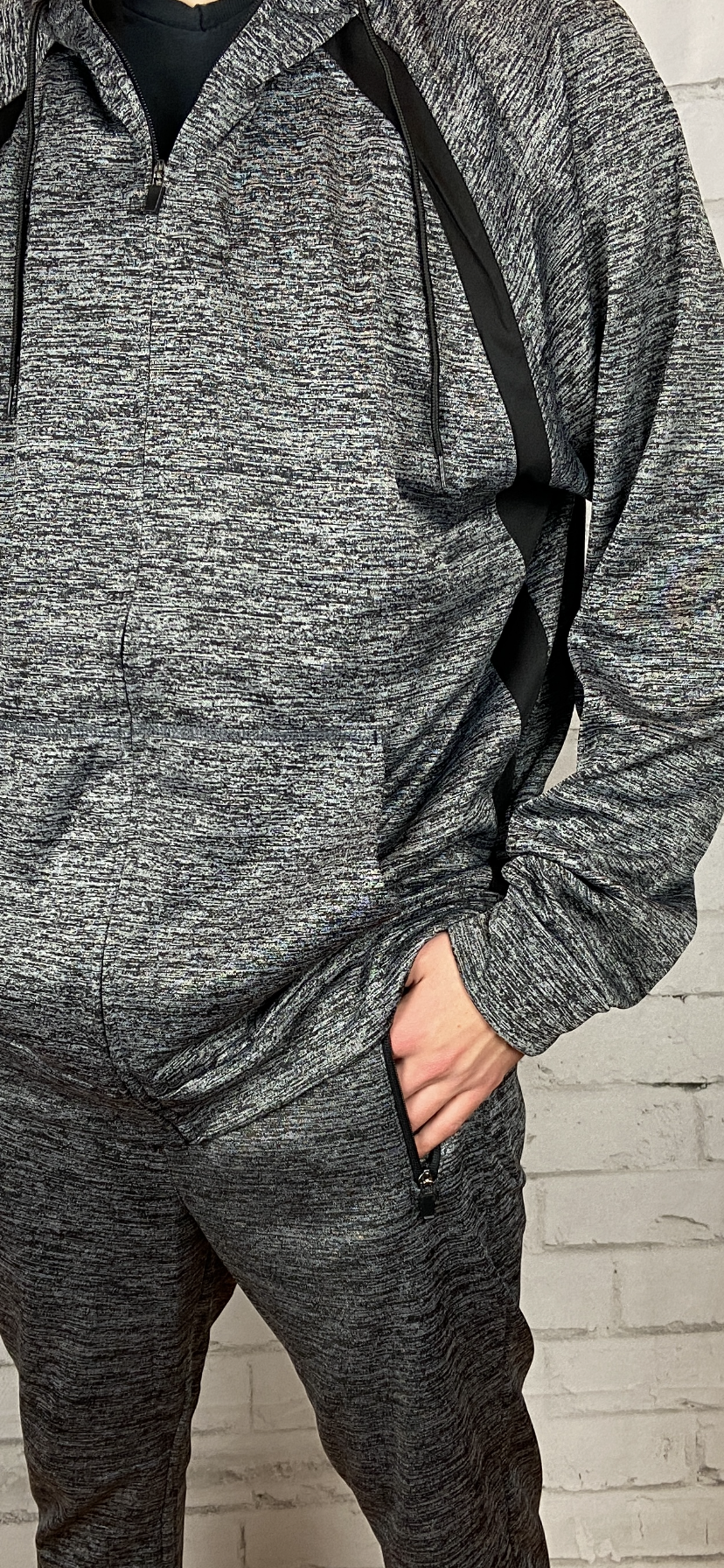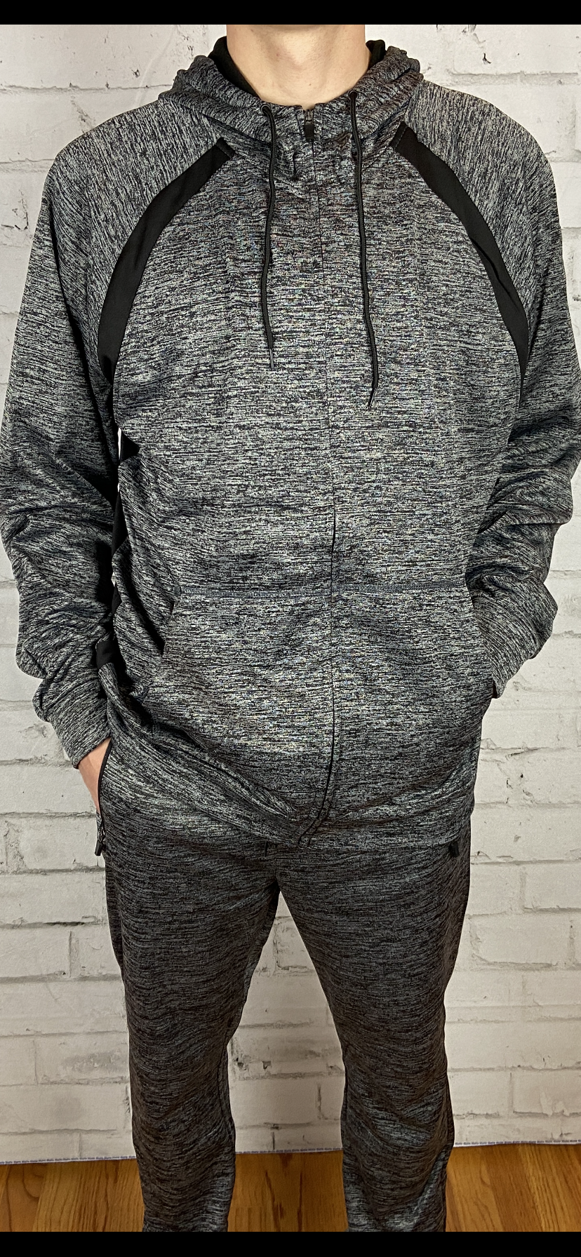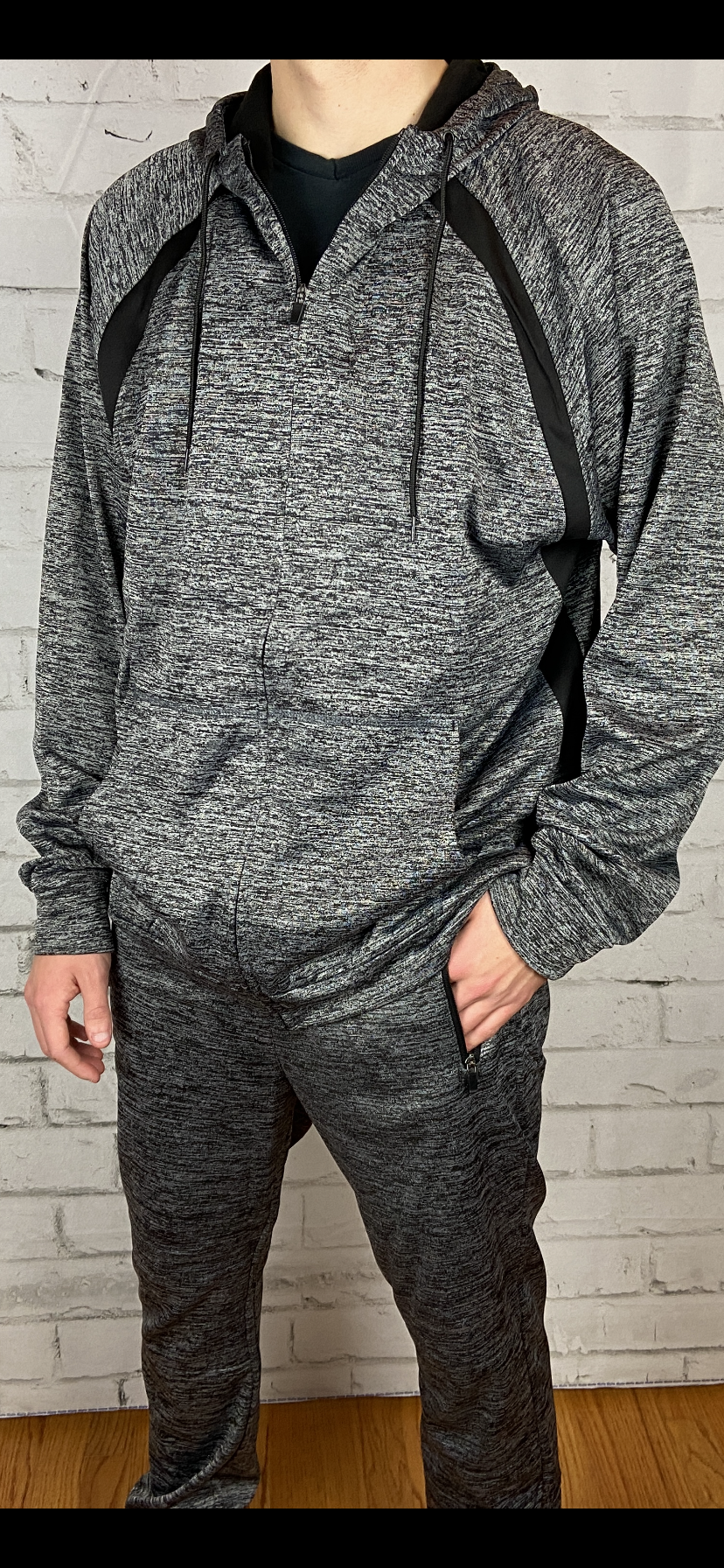Men's gray and black premium quality hooded track suit/jogger set. Silky feel on the outside and fleece lined on the inside. Sleek design premium hardware slight sheen to the fabric soft and warm without the bulk excellent quality. Machine wash cold with like colors nonchlorine bleach when needed tumble dry low remove promptly warm iron if needed imported. Fitted cut size up for comfort.