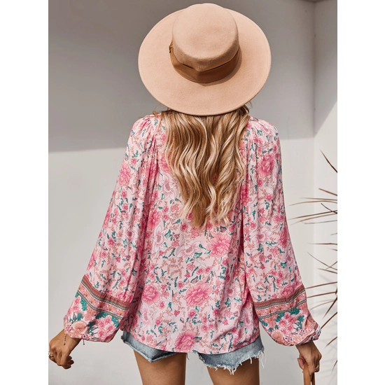 Floral BoHo V-neck loose long sleeve elastic cuff sleeves tunic blouse summer gypsy hippie bohemian flower shirt, special design