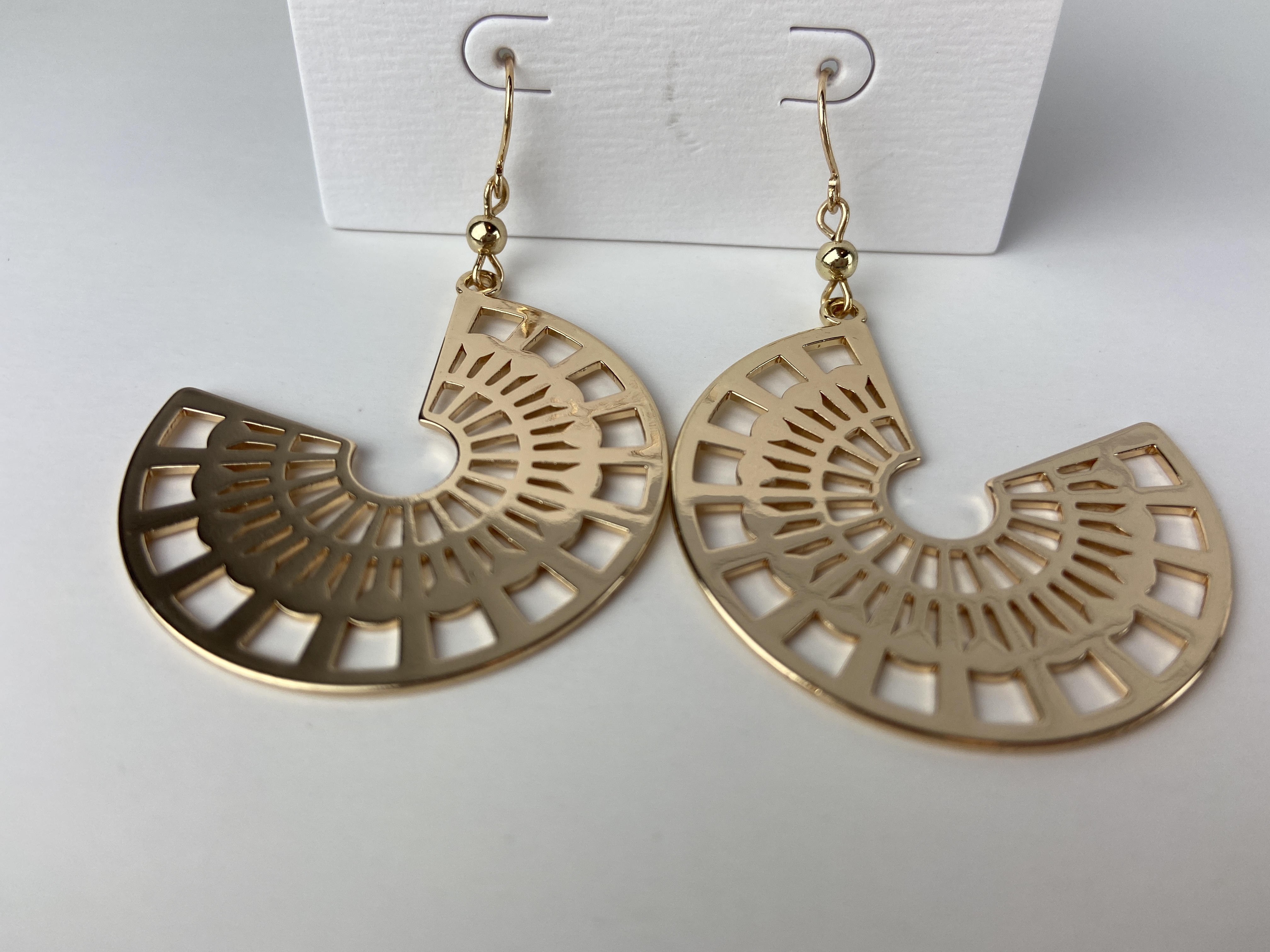 Gold plated fan design earrings. DIMENSION length: 2.5" width: 1.5" earring back: fishhook metal finish: Gold Plating product: Lead & Nickel Compliant anti-tarnish: Double E-coatin