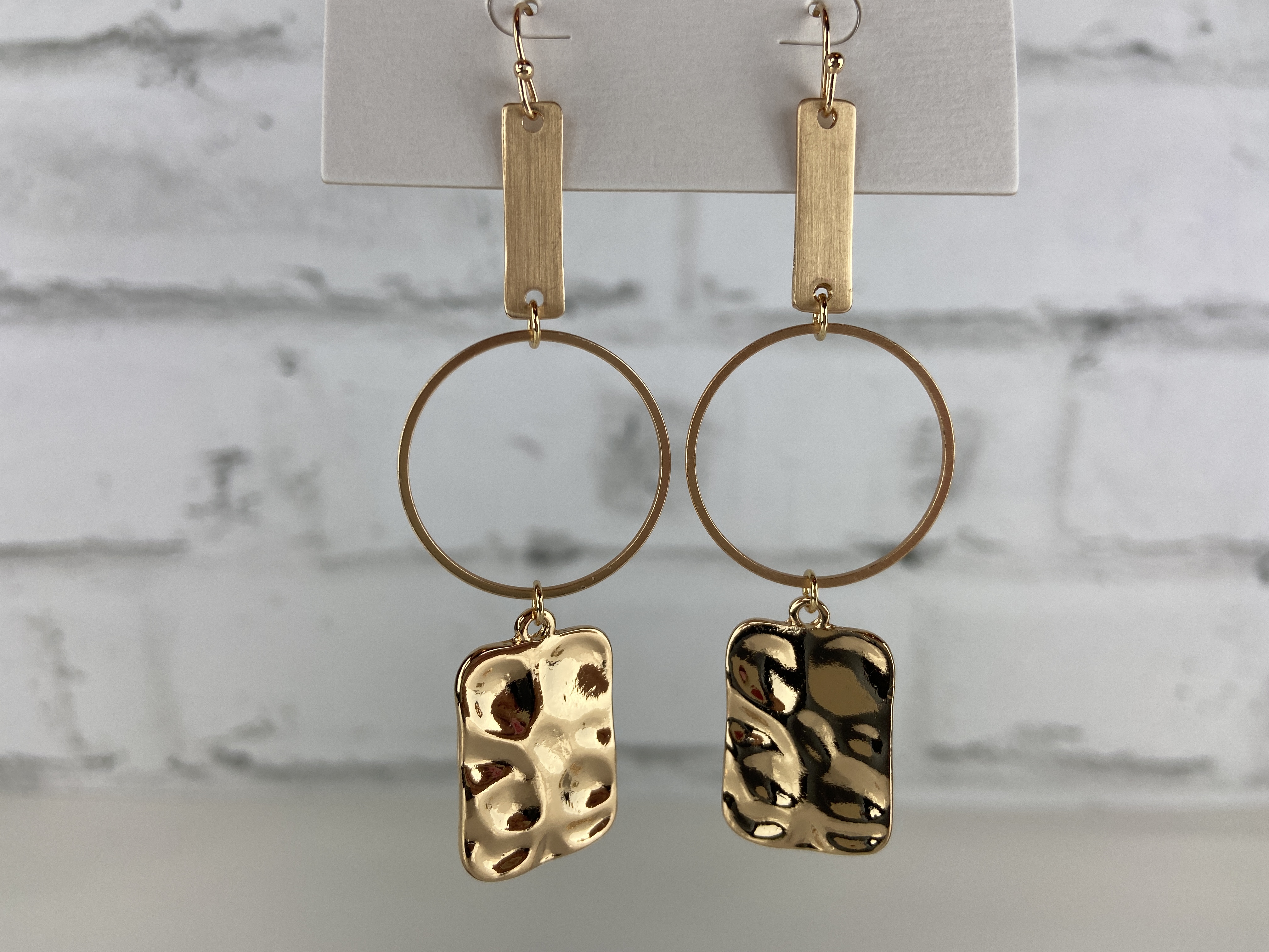 A higher-end statement for women who need jewelry that is interesting, unique and functional. It is in style and minimalist sophistication are sure to be a conversation starter among your friends. DIMENSION length: 3" width: 1" circle, .75" hammered rectangle earring back: Fish Hook metal finish: Gold Plating product: Lead & Nickel Compliant anti-tarnish: Double E-coating quality earrings.