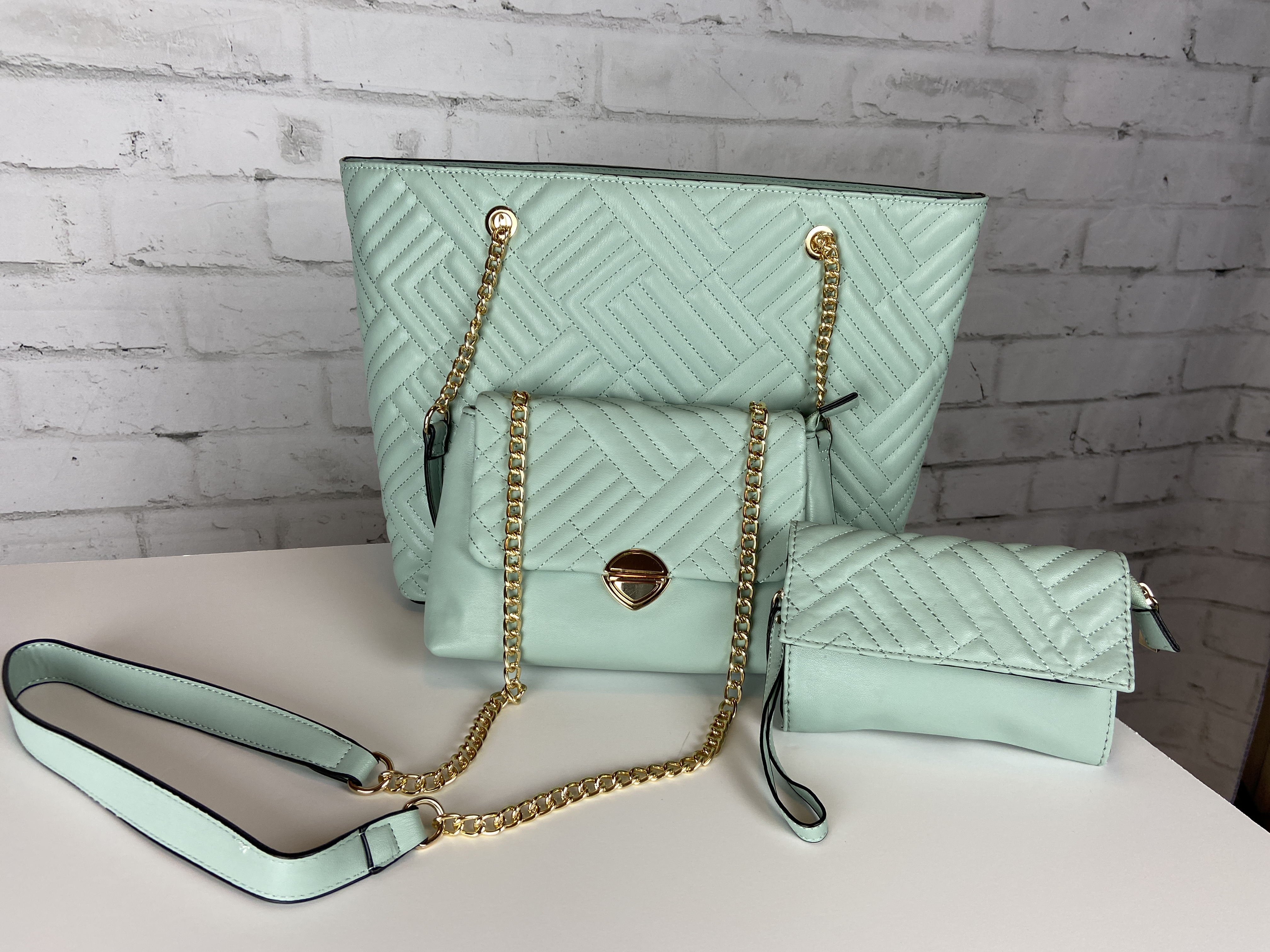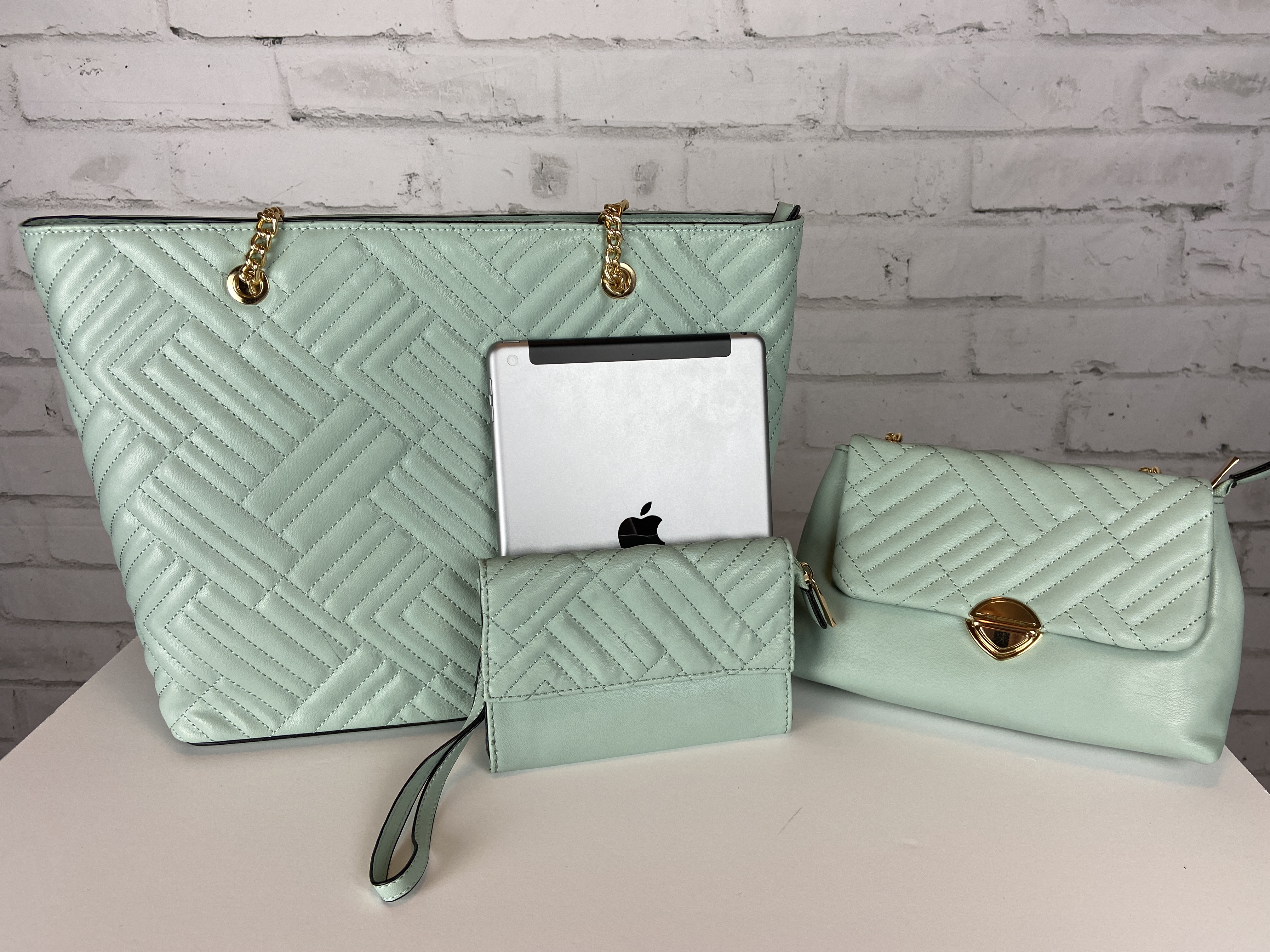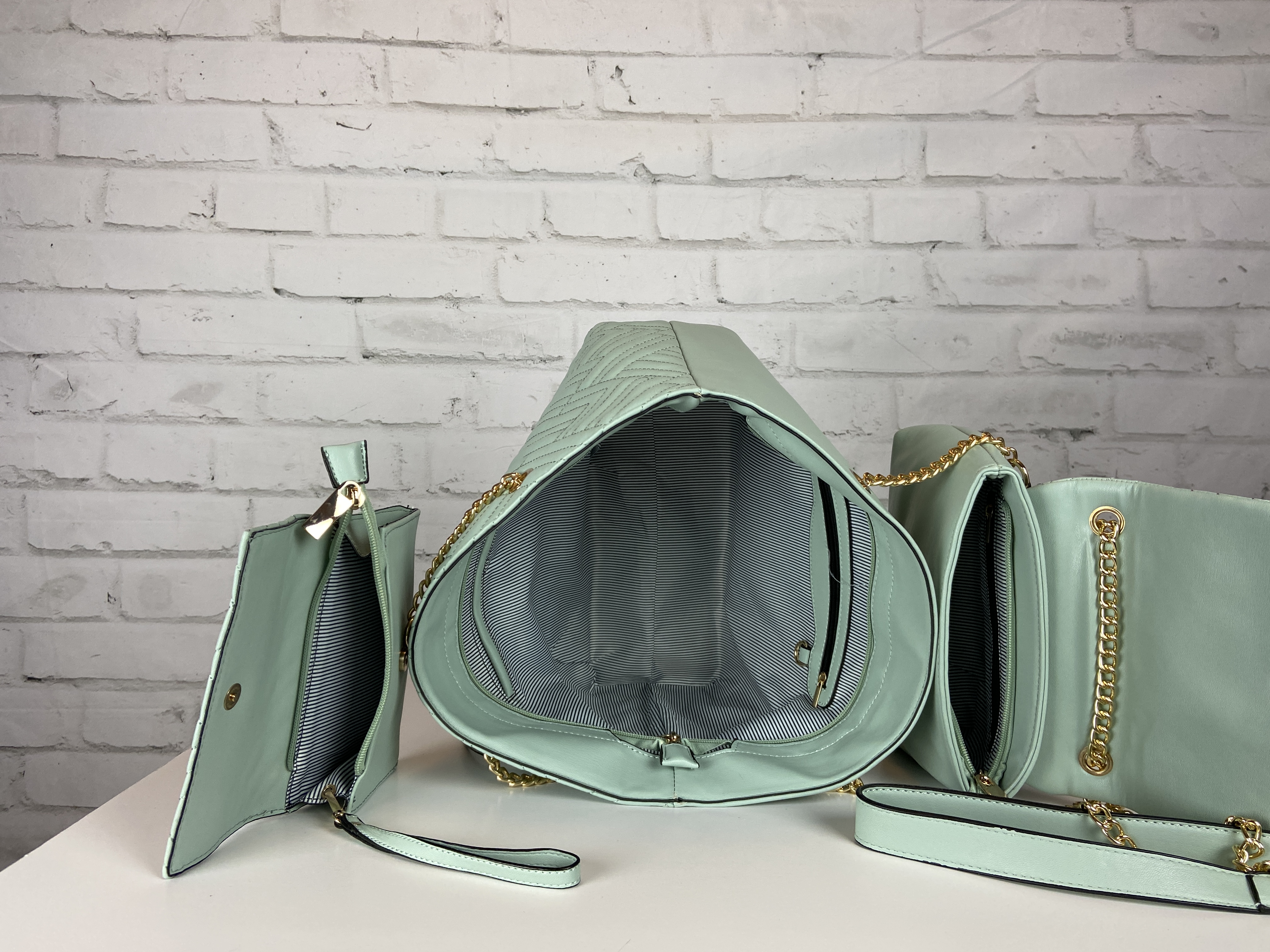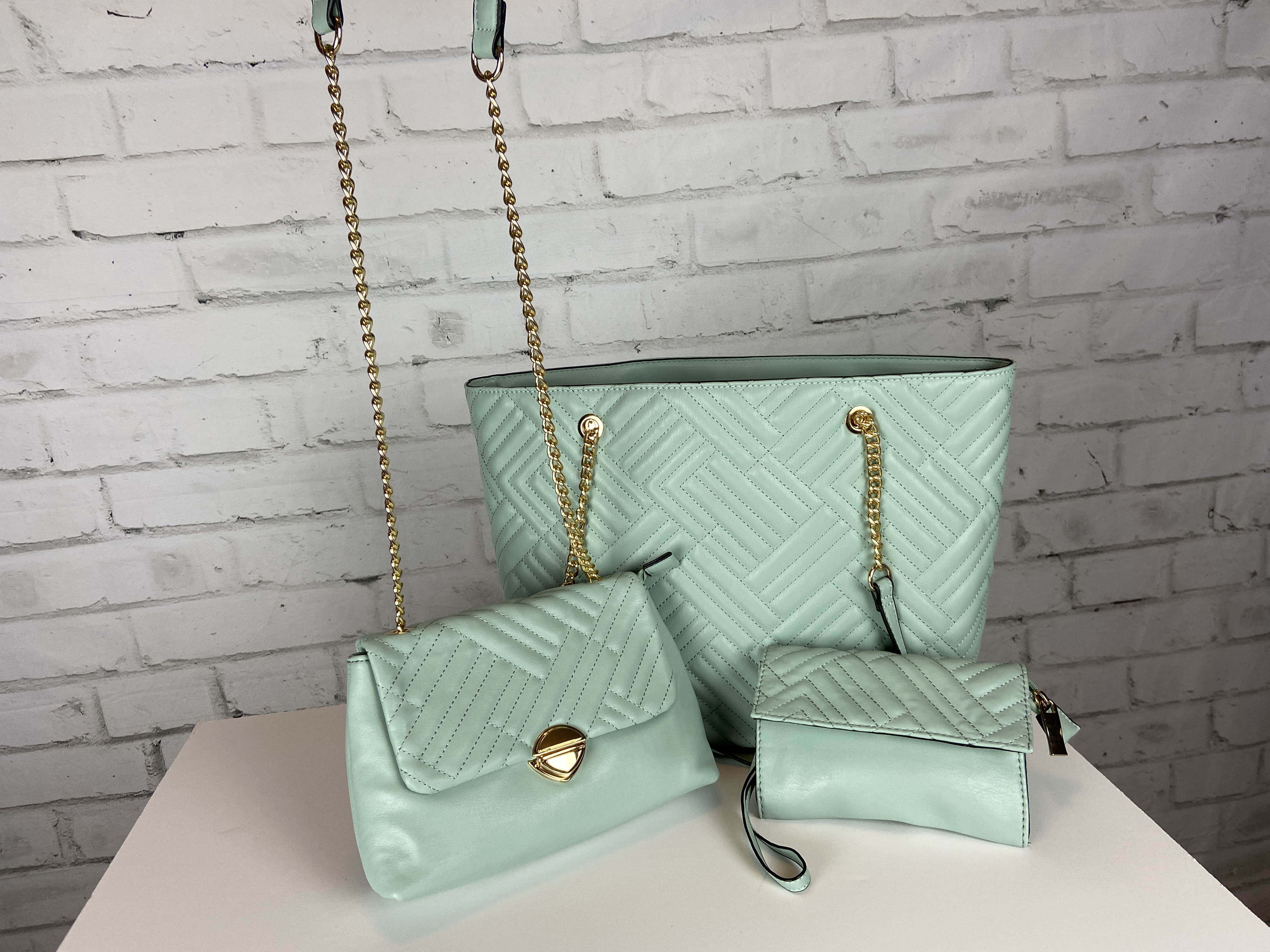 Light sage large quilted tote, cross body clutch, & wristlet 3-in-1 set. Fashion shopper bag set faux leather. Tote zipper top open secure with zipper entry. Premium feel soft faux leather. body clutch slide in clasp closure 16.25 w x 5 d x 13 h comes with dust cover. Gold tone hardware, quality stiching, the look and feel of this bag is so luxurious. Gold feet. Inside is a fun stripe lining, media compartment and a inside zipper pocket. The mint color is so fresh and can be used year round and all seasons.