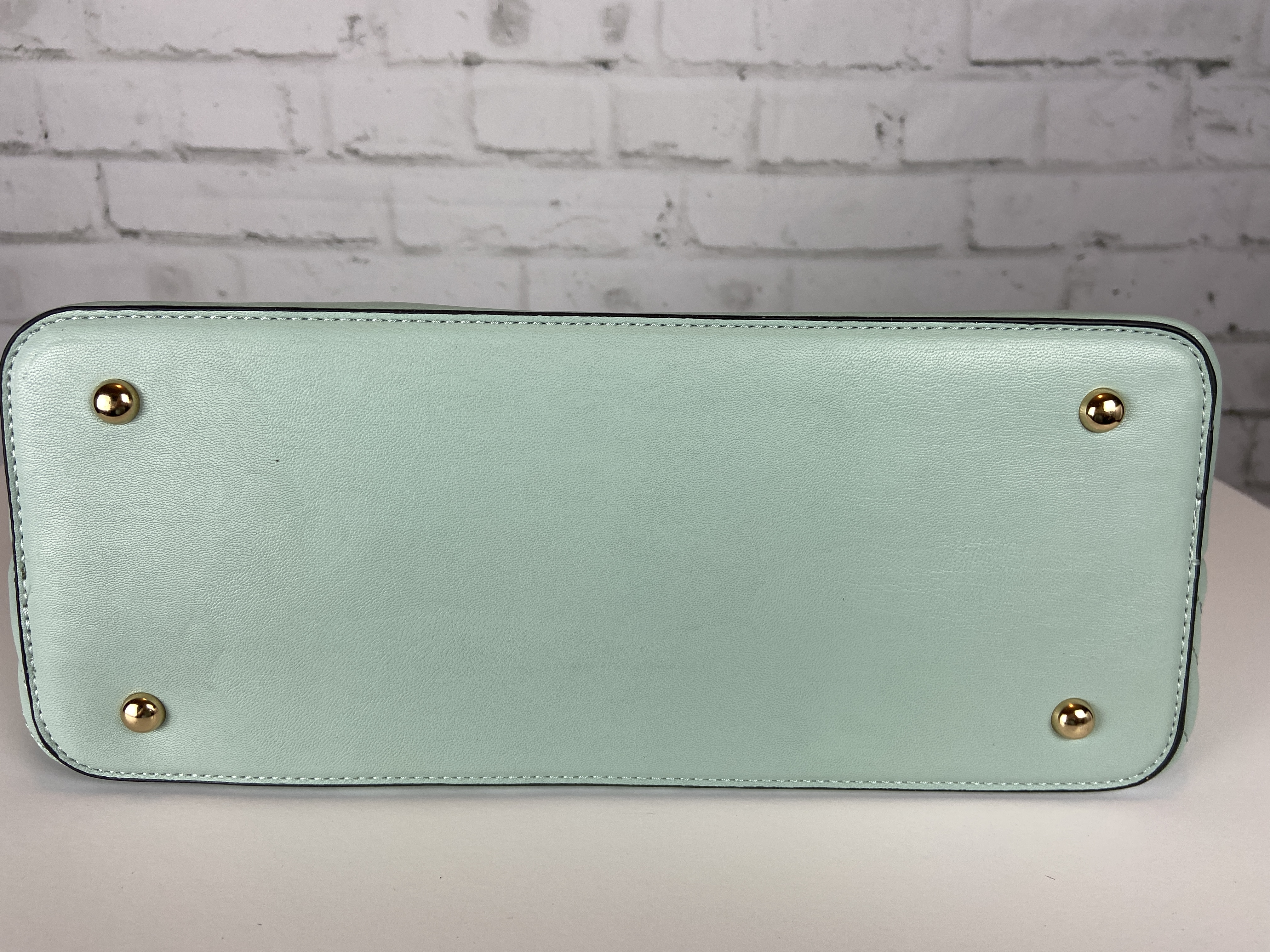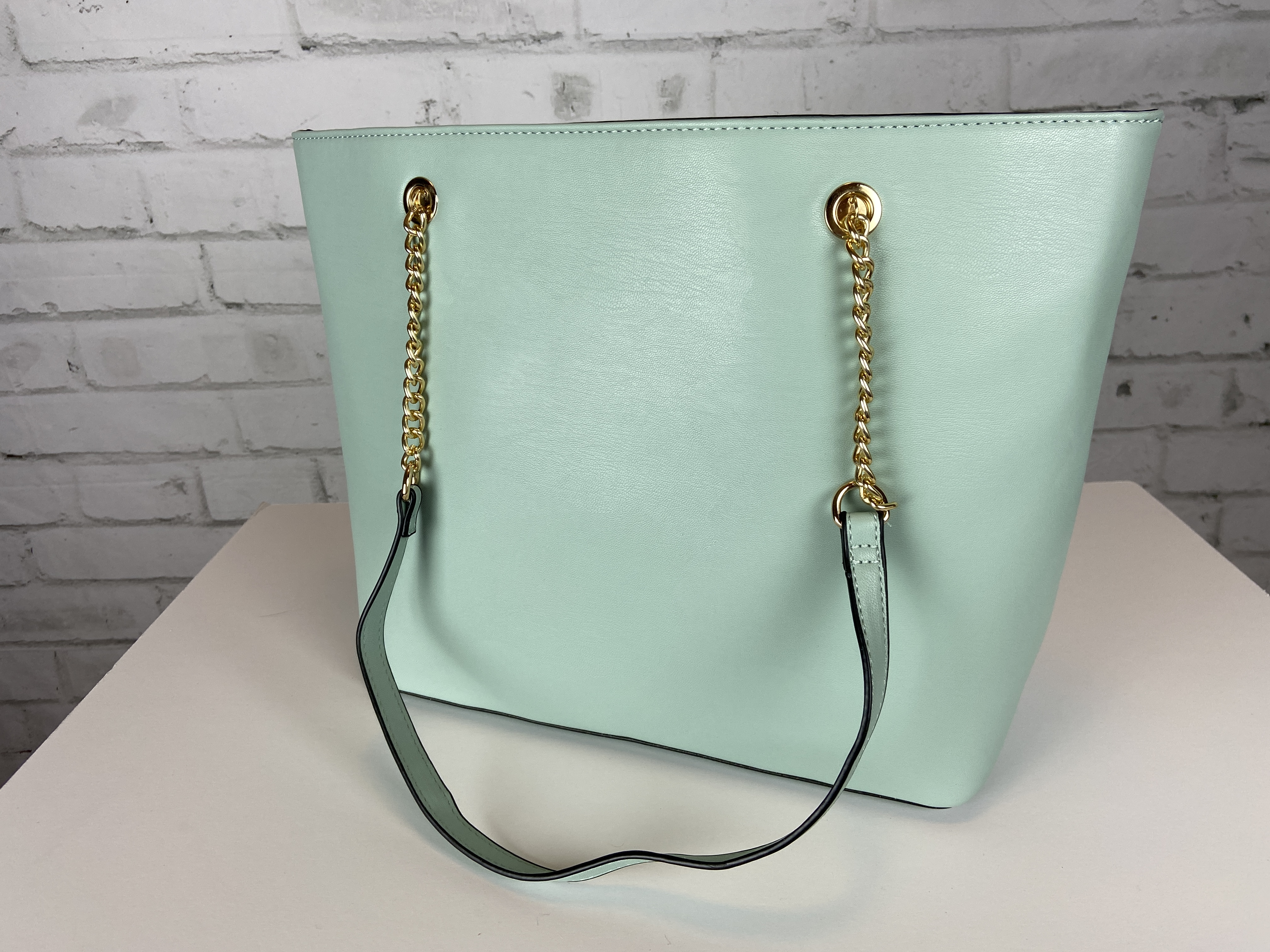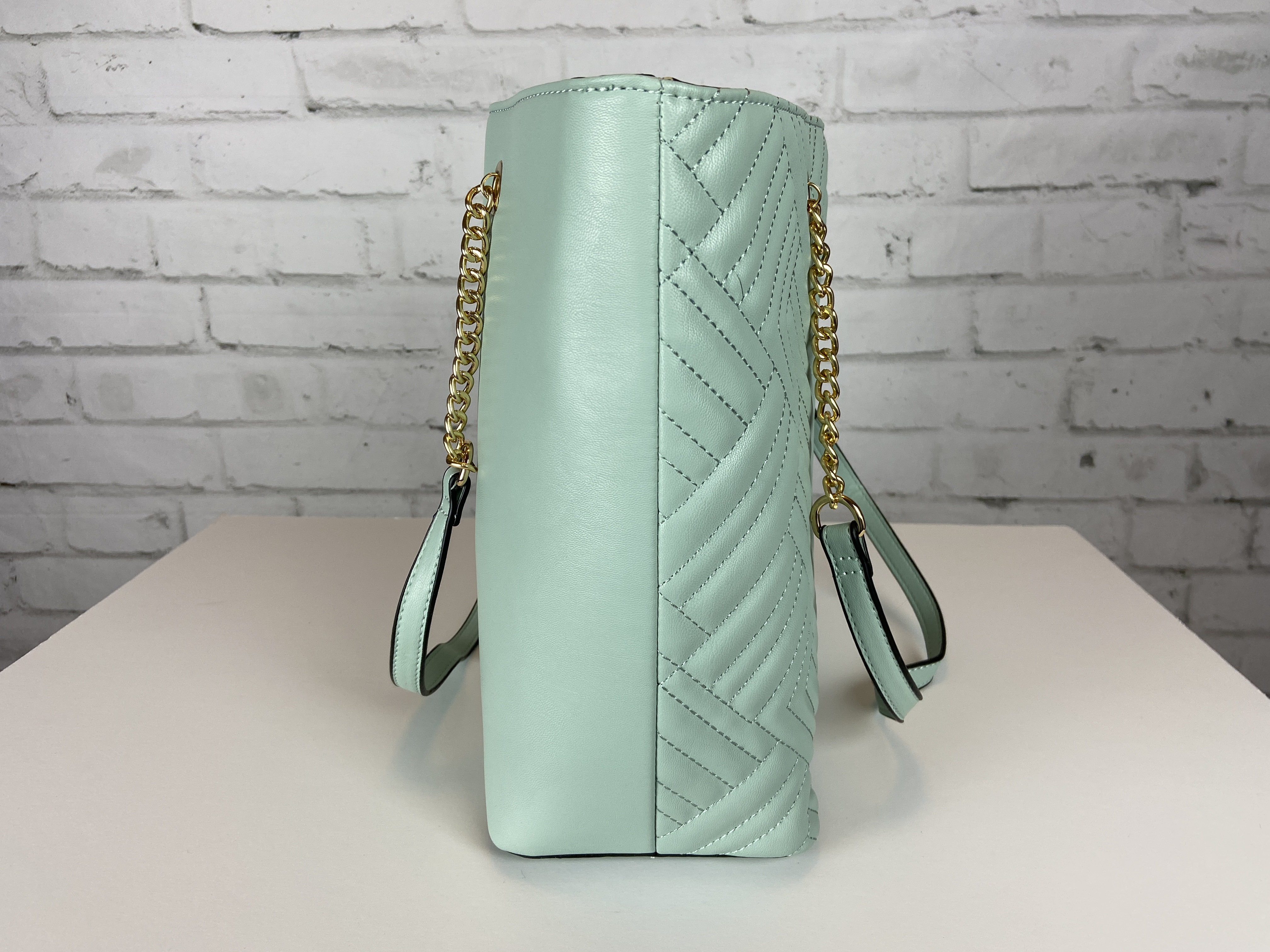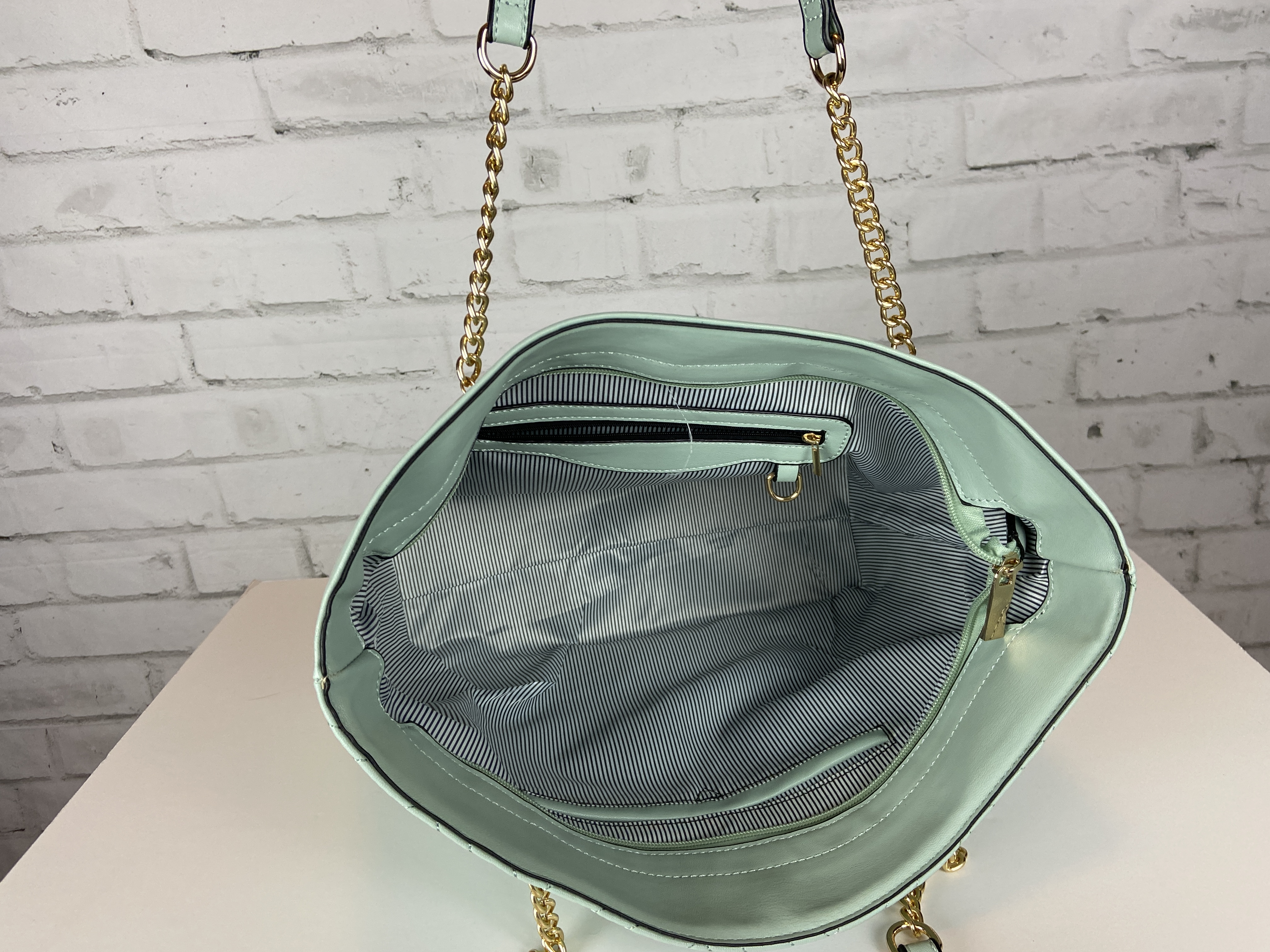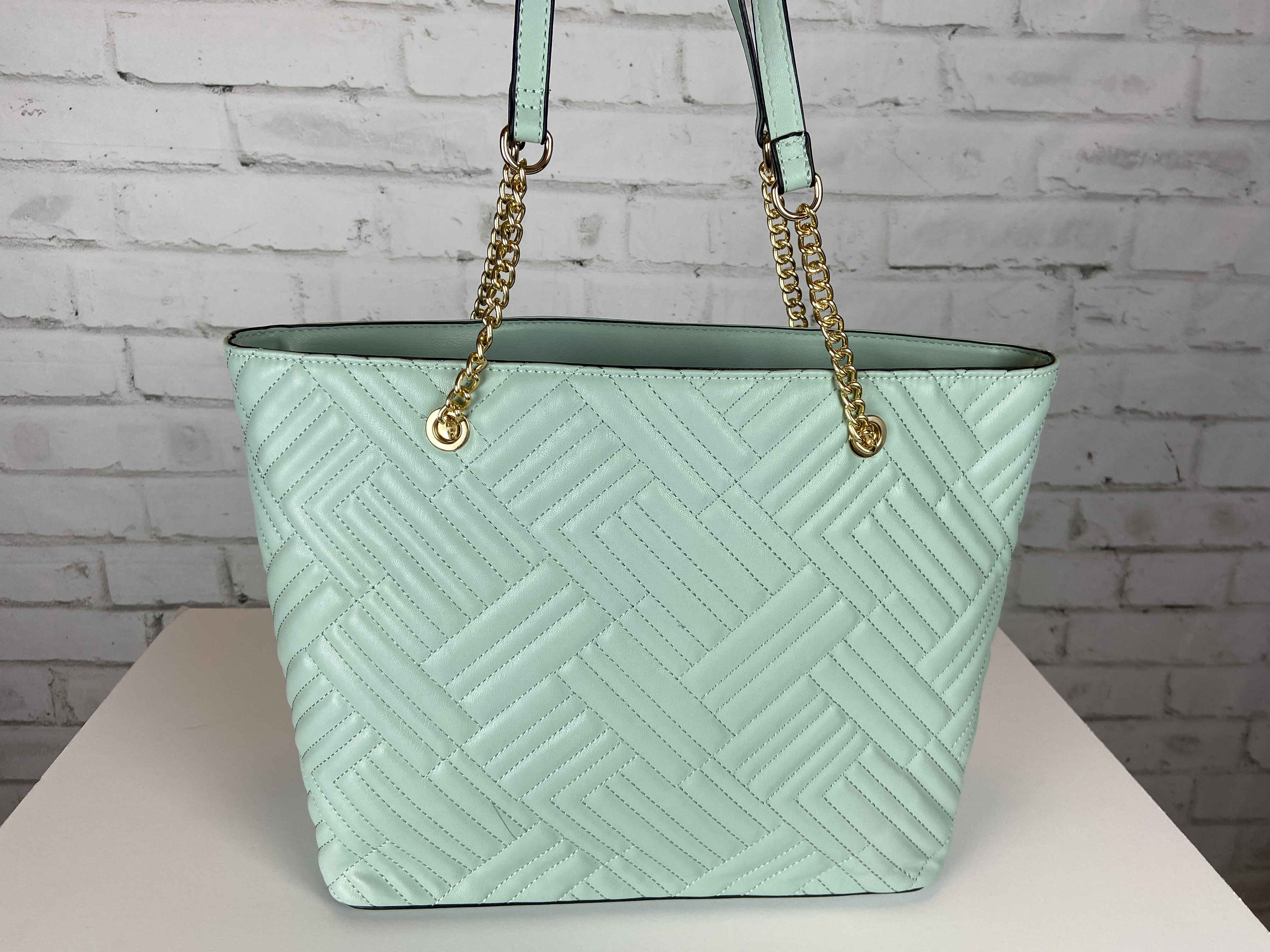 Light sage large quilted tote, cross body clutch, & wristlet 3-in-1 set. Fashion shopper bag set faux leather. Tote zipper top open secure with zipper entry. Premium feel soft faux leather. body clutch slide in clasp closure 16.25 w x 5 d x 13 h comes with dust cover. Gold tone hardware, quality stiching, the look and feel of this bag is so luxurious. Gold feet. Inside is a fun stripe lining, media compartment and a inside zipper pocket. The mint color is so fresh and can be used year round and all seasons.