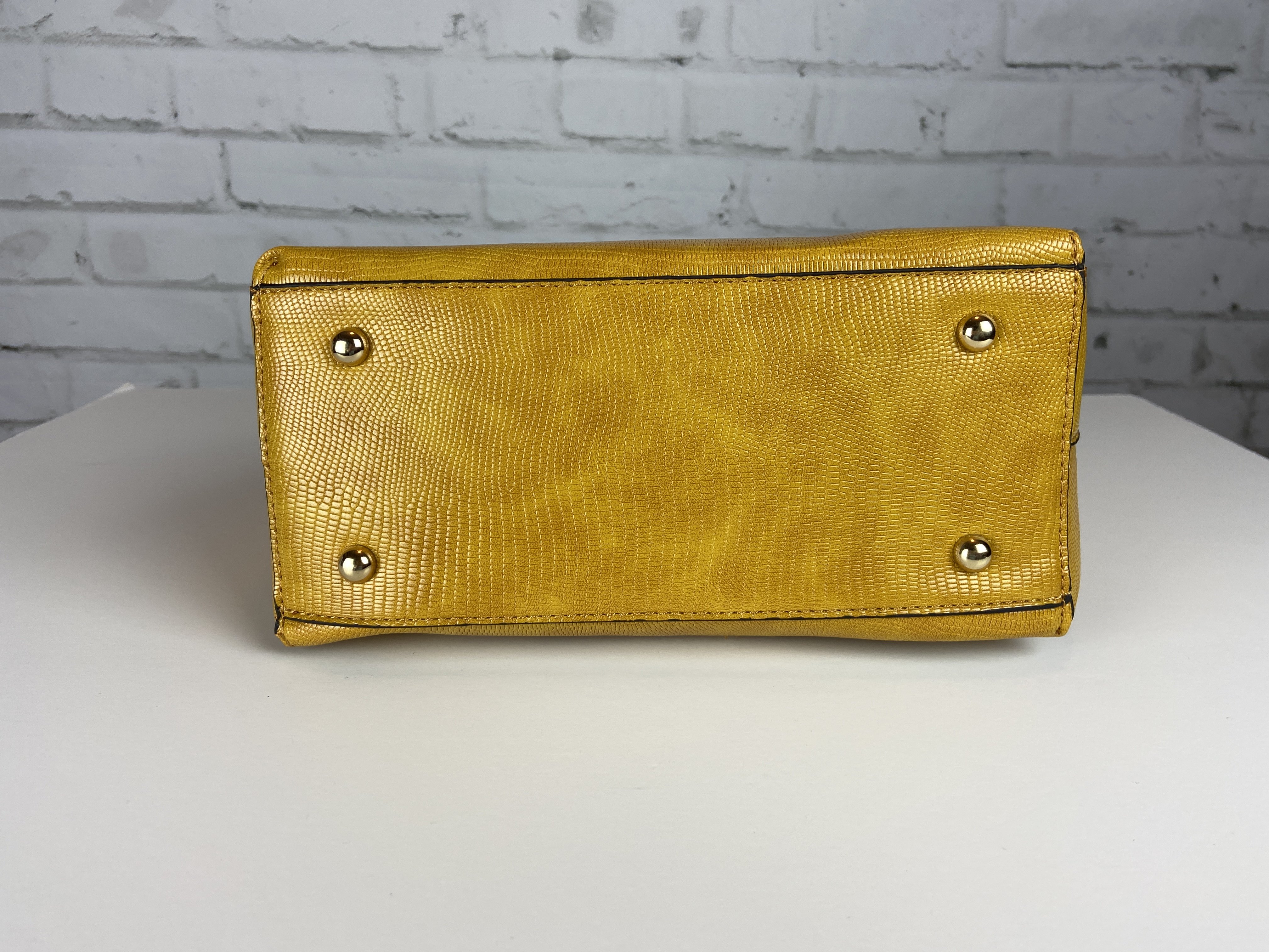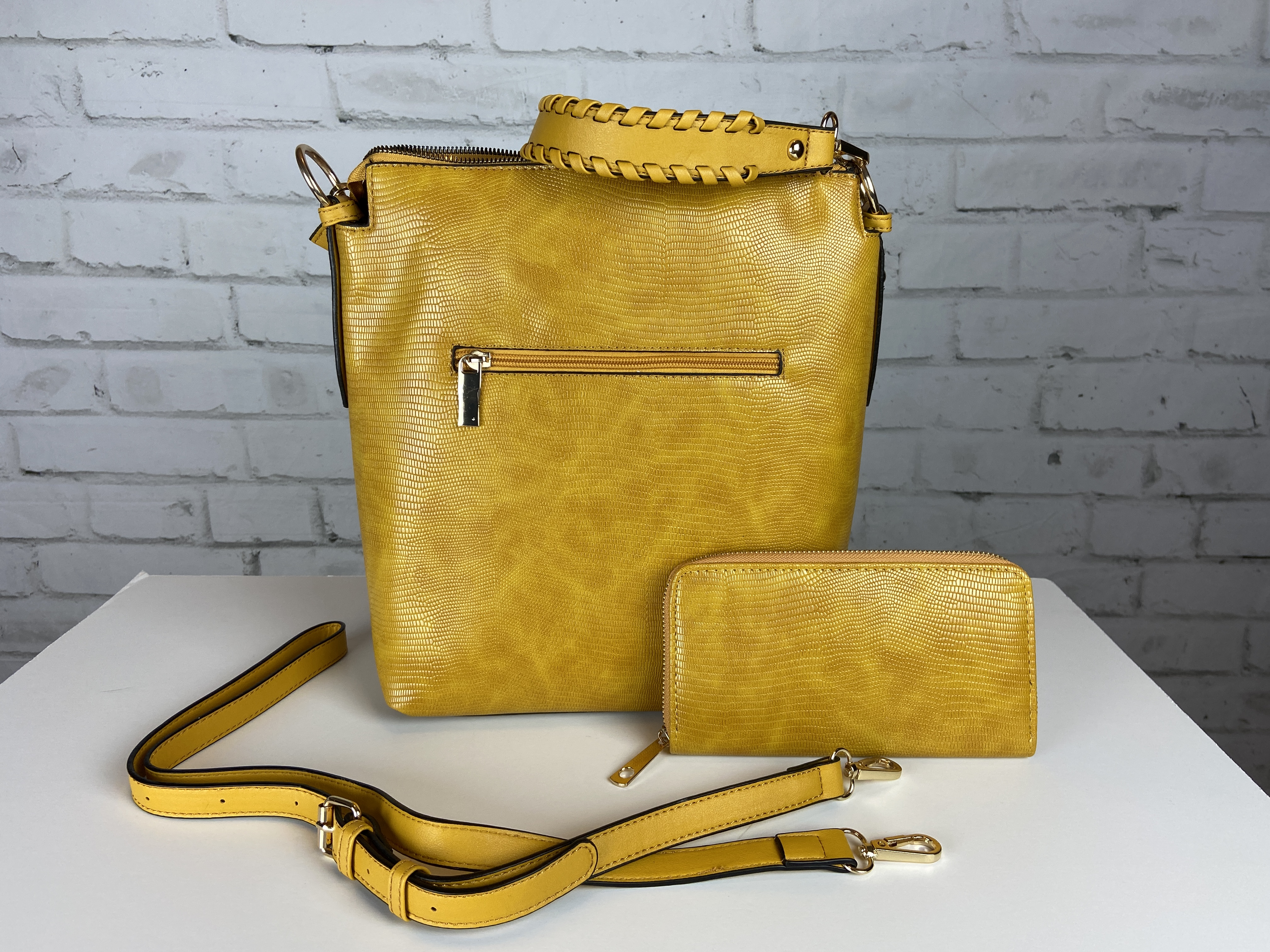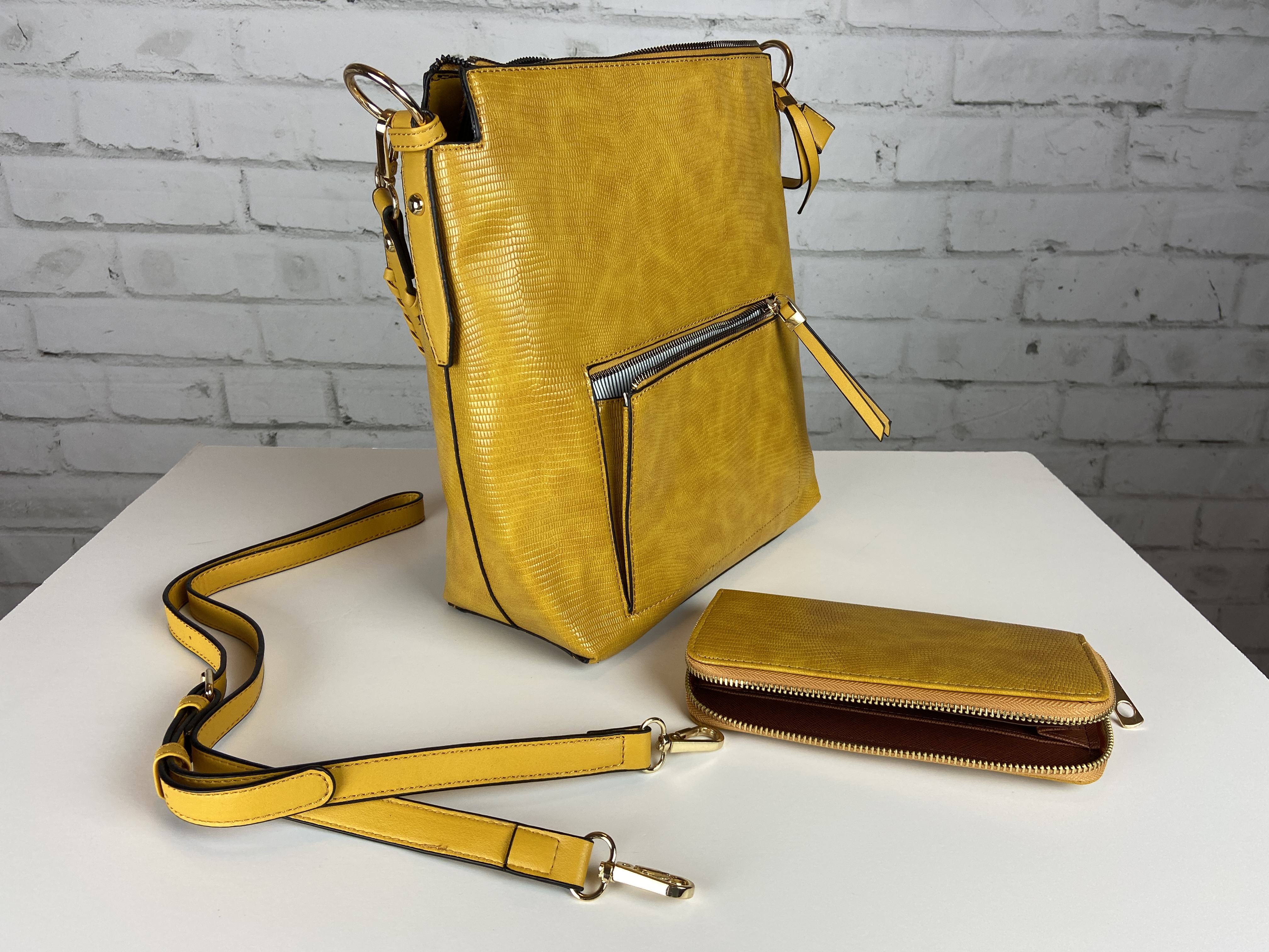 Mustard yellow deep shoulder bag with wallet set, snake PU leather, whip stitch wallet, included cross body strap and shoulder strap with silver hardware and feet. 12 x 5 x 11 comes with dust cover. This is a perfect color zoom in to see the snake print design lots of zipper pockets outside and inside. Fun stripped lining inside. Mustard color can be worn year round. You are sure to get compliments on this rich color.