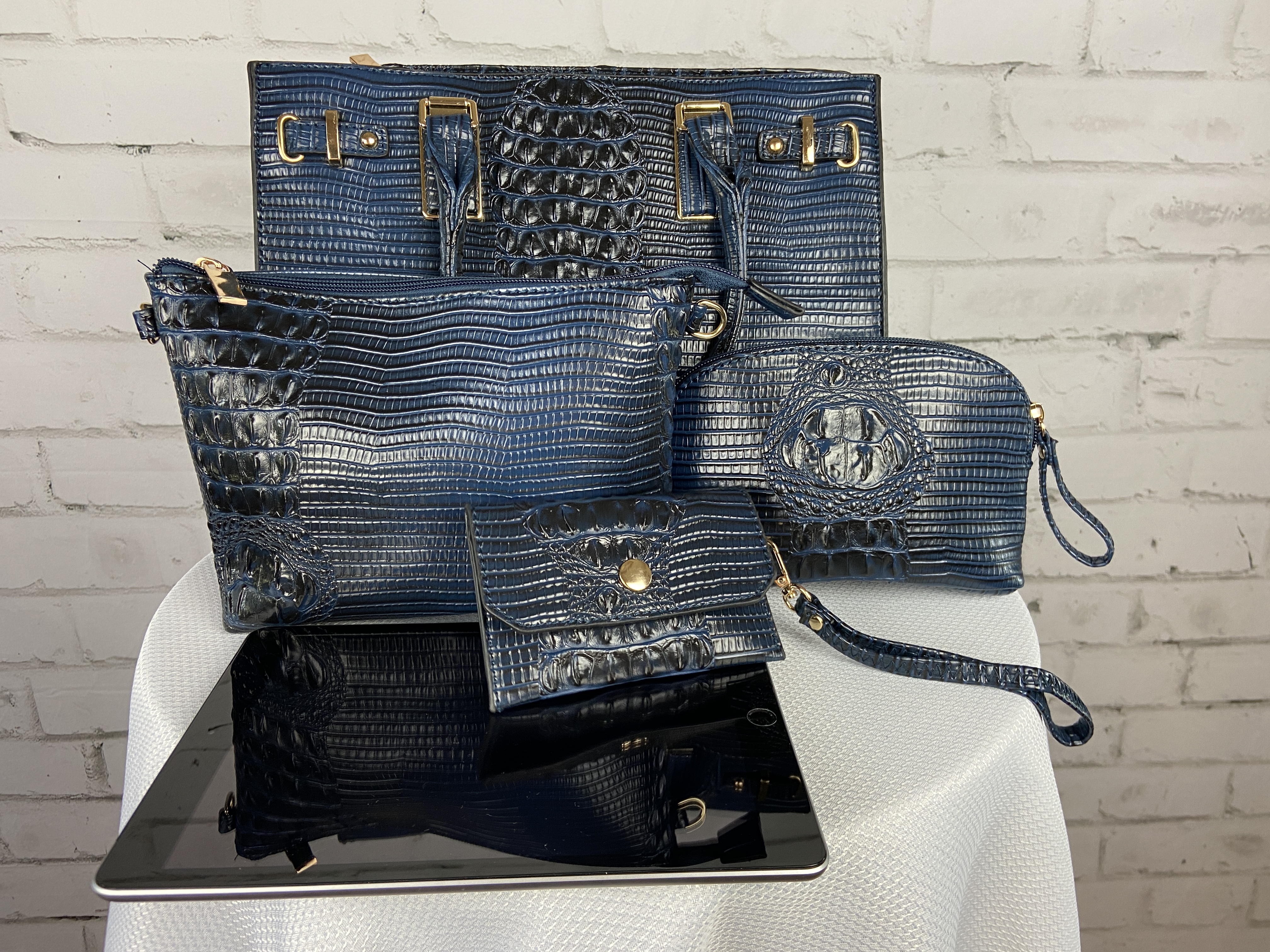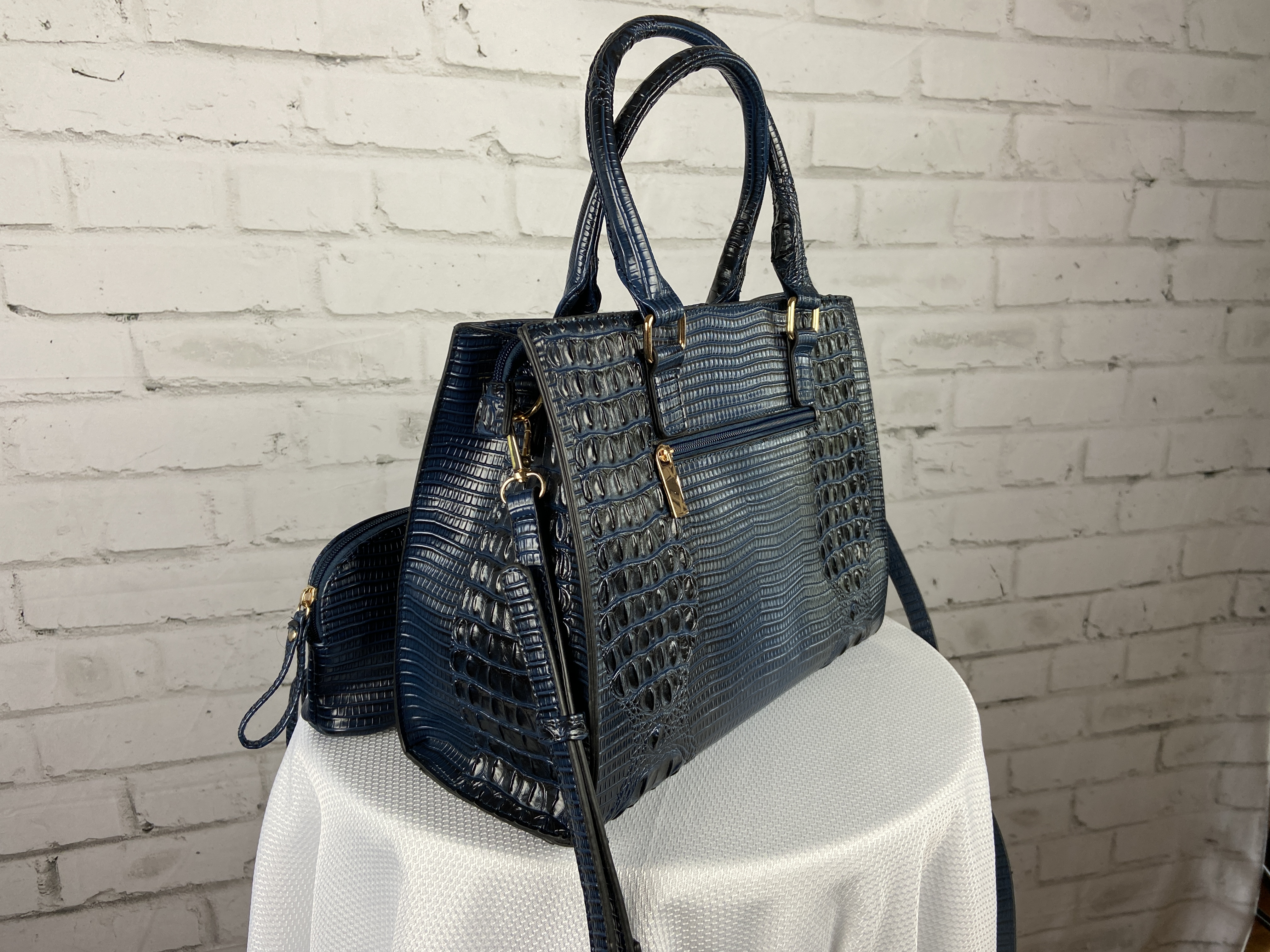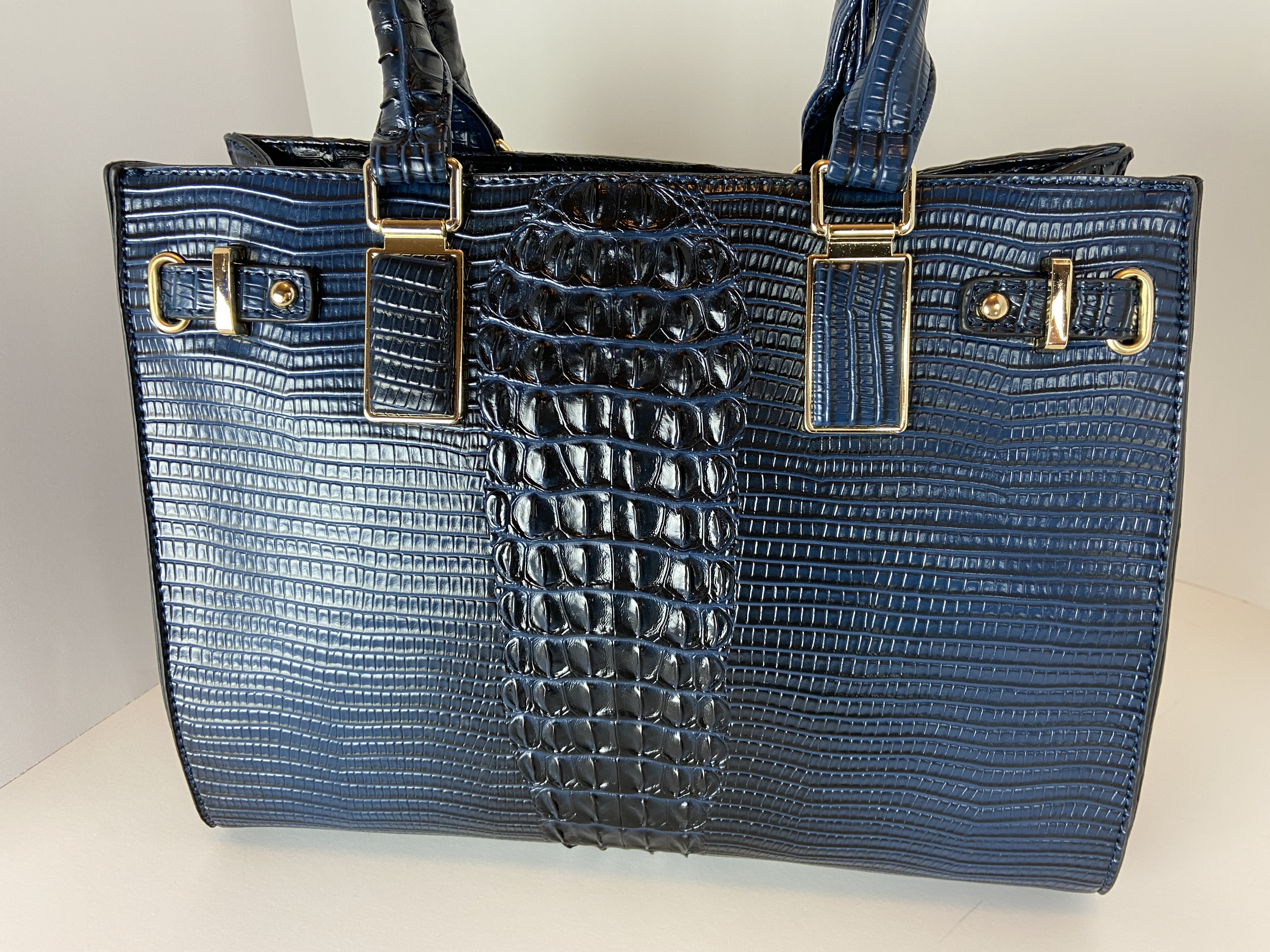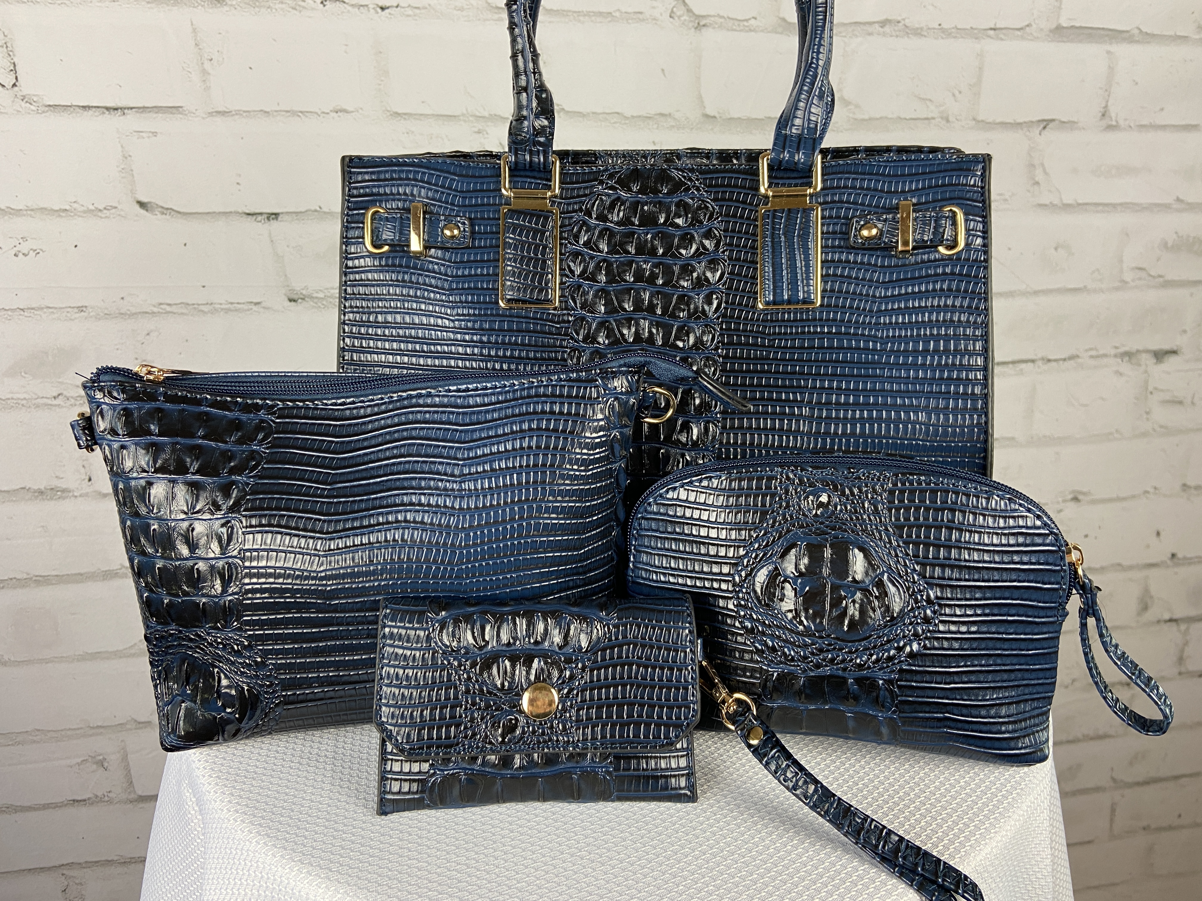 Navy Blue 4-in-1 large boxy satchel faux leather with elegant details. Large capacity bags multiple uses durable materials very sturdy design elegant details well made and stylish. Store all your essentials simply classic and stylish. Excellent quality, ajustable shoulder strap interchangable with second purse for a cross body, wristlet strap also interchanable. (Satchel, Crossbody, Clutch & Coin purse) Gold feet. Detachable shoulder strap L 13.5 * H 10.5 * W 5 (7 D) L 9.5 * H 6.5 * W 3 L 7.5 * H 5 * W 2 L 5.25 * H 3.5 * W 0.5 comes with dust cover.