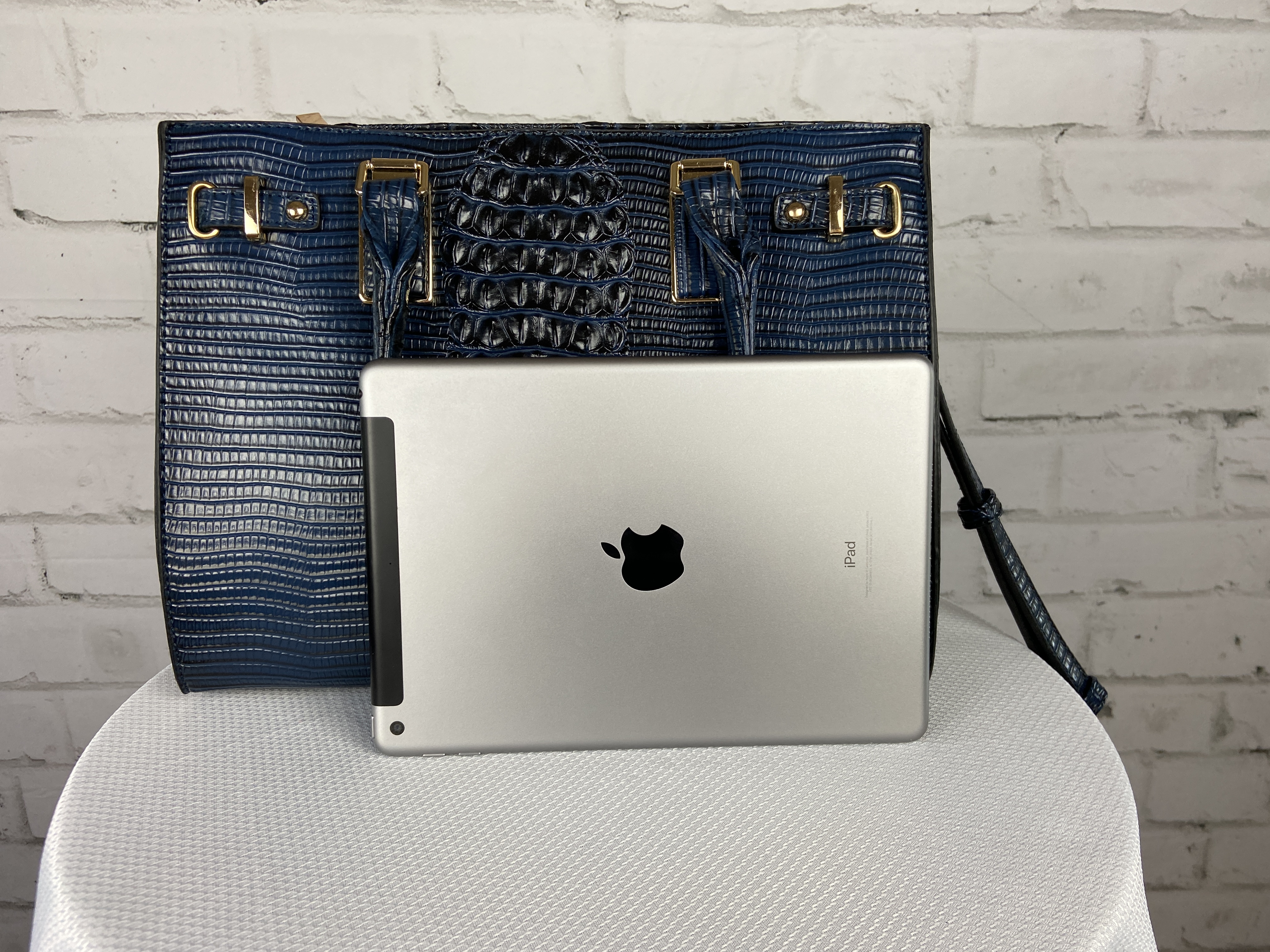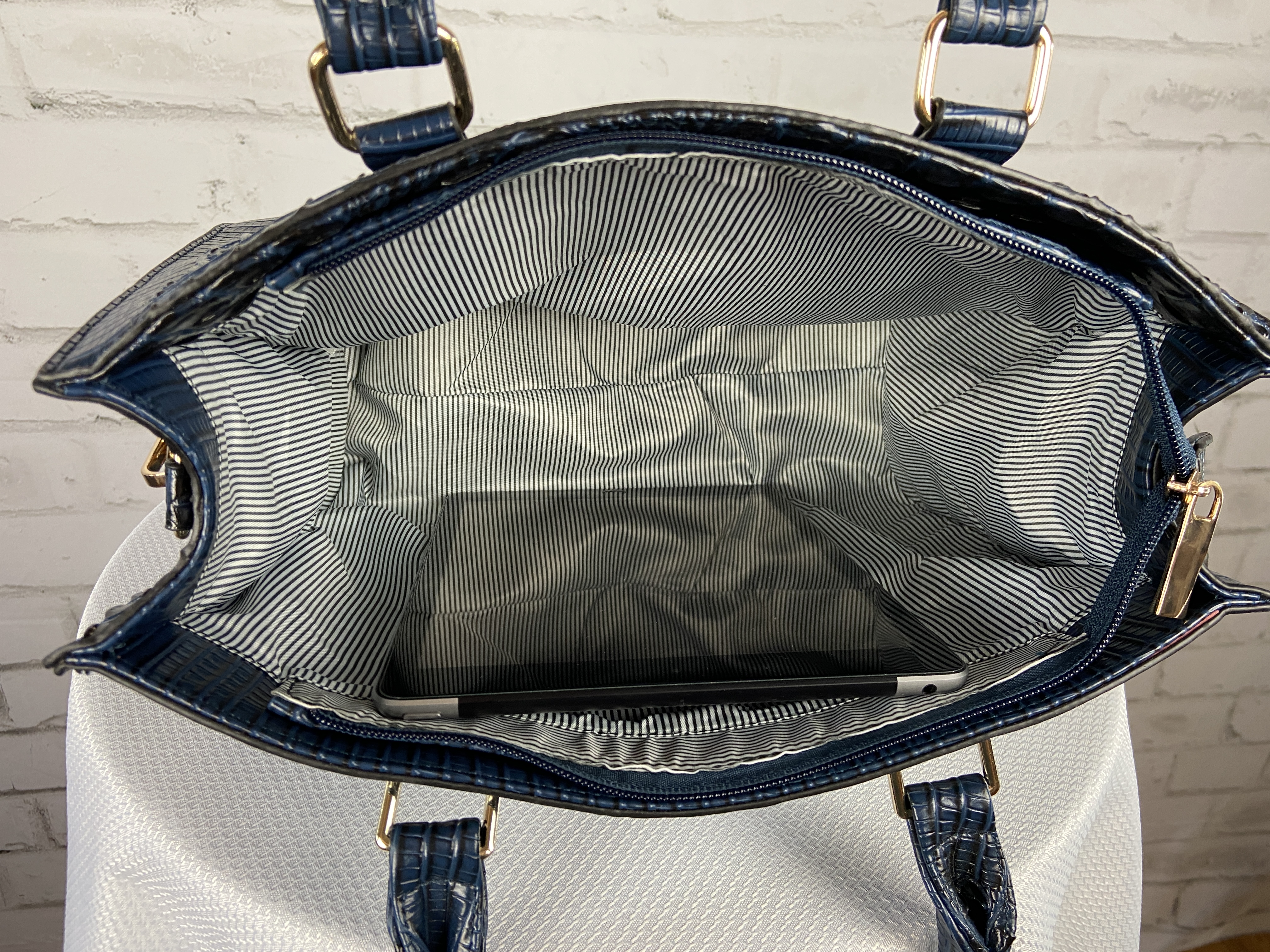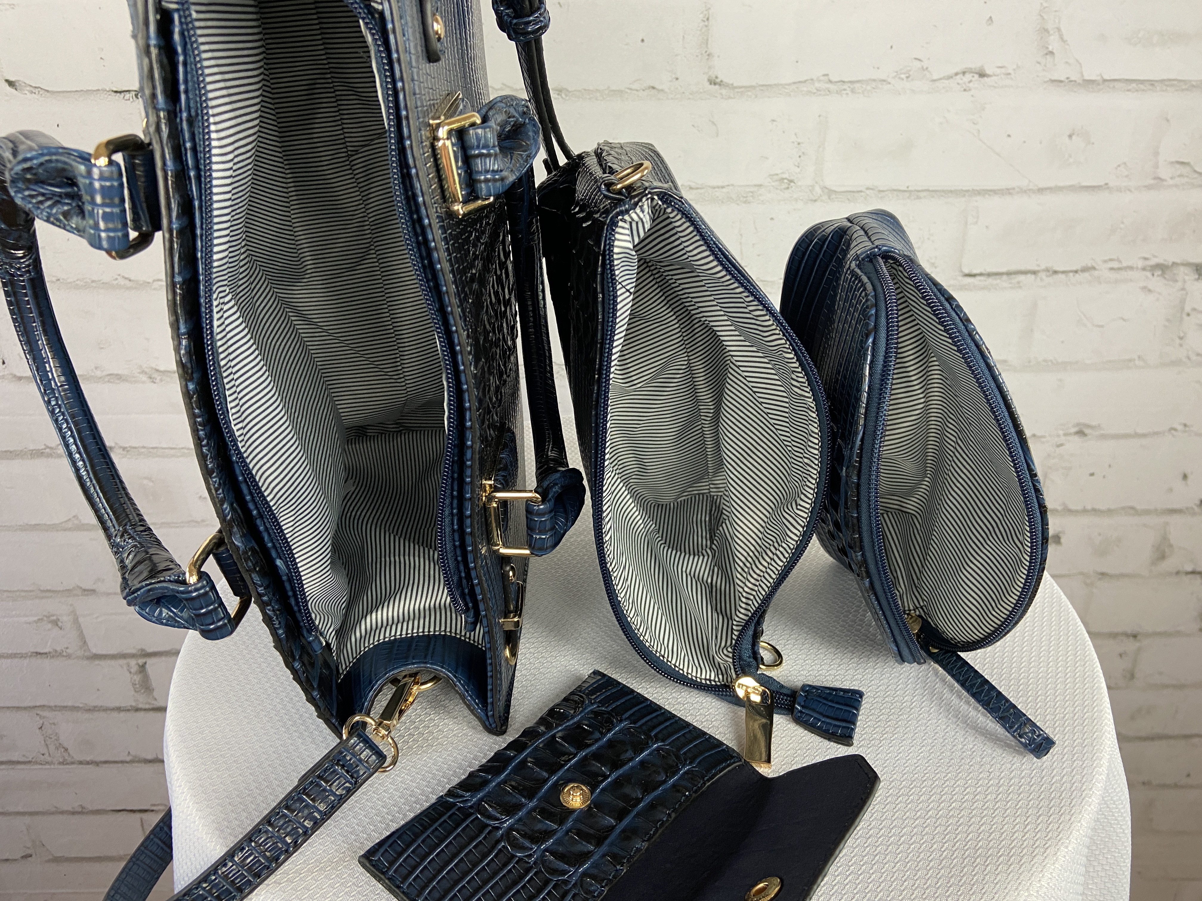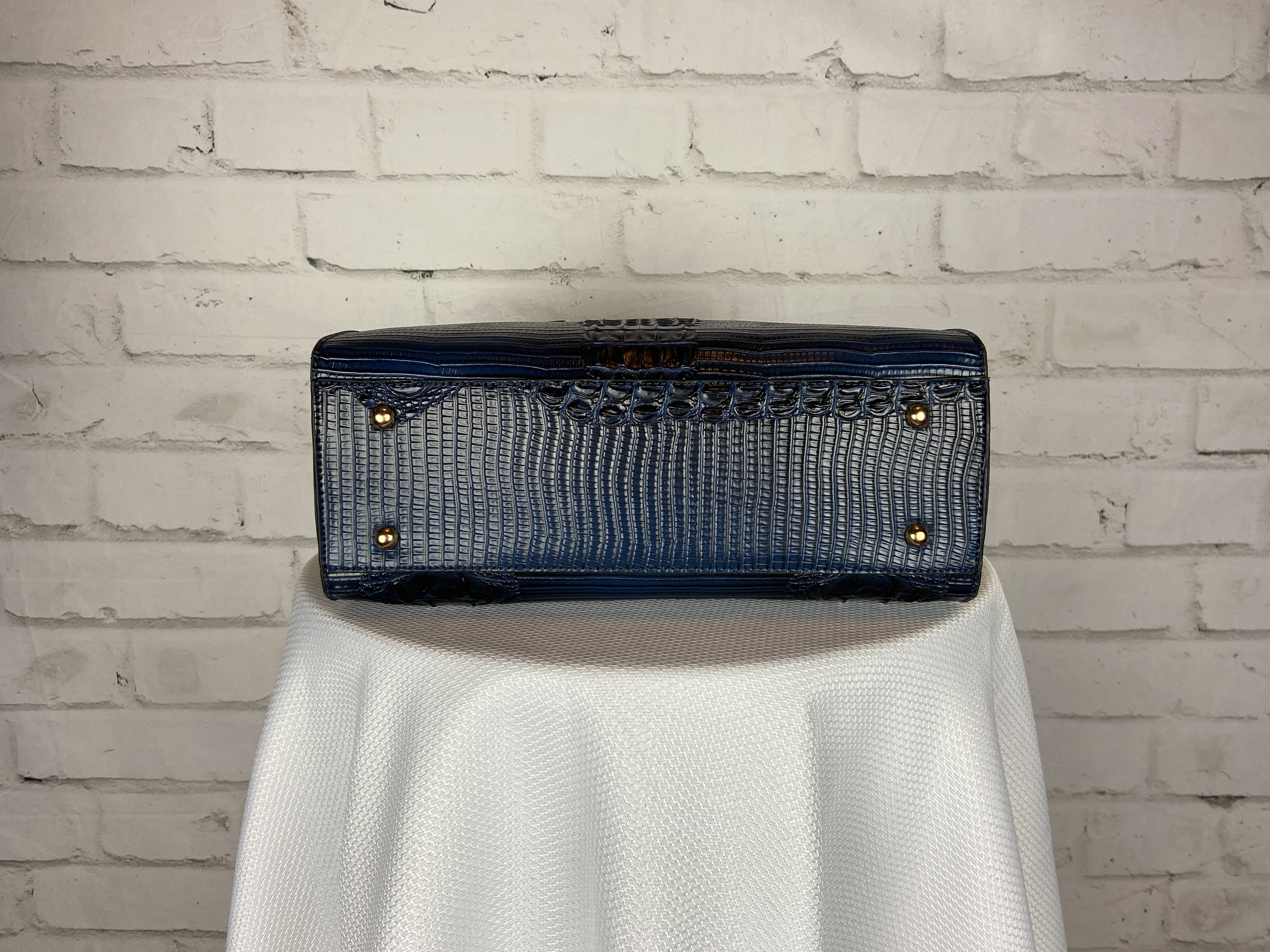 Navy Blue 4-in-1 large boxy satchel faux leather with elegant details. Large capacity bags multiple uses durable materials very sturdy design elegant details well made and stylish. Store all your essentials simply classic and stylish. Excellent quality, ajustable shoulder strap interchangable with second purse for a cross body, wristlet strap also interchanable. (Satchel, Crossbody, Clutch & Coin purse) Gold feet. Detachable shoulder strap L 13.5 * H 10.5 * W 5 (7 D) L 9.5 * H 6.5 * W 3 L 7.5 * H 5 * W 2 L 5.25 * H 3.5 * W 0.5 comes with dust cover.