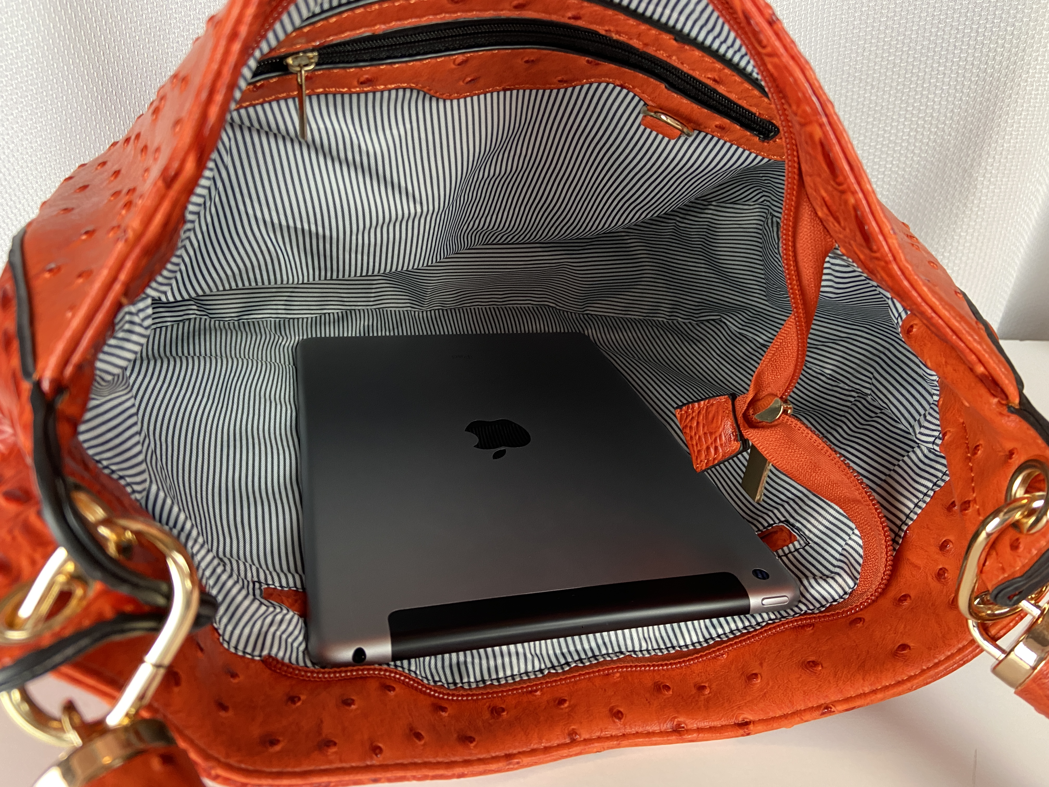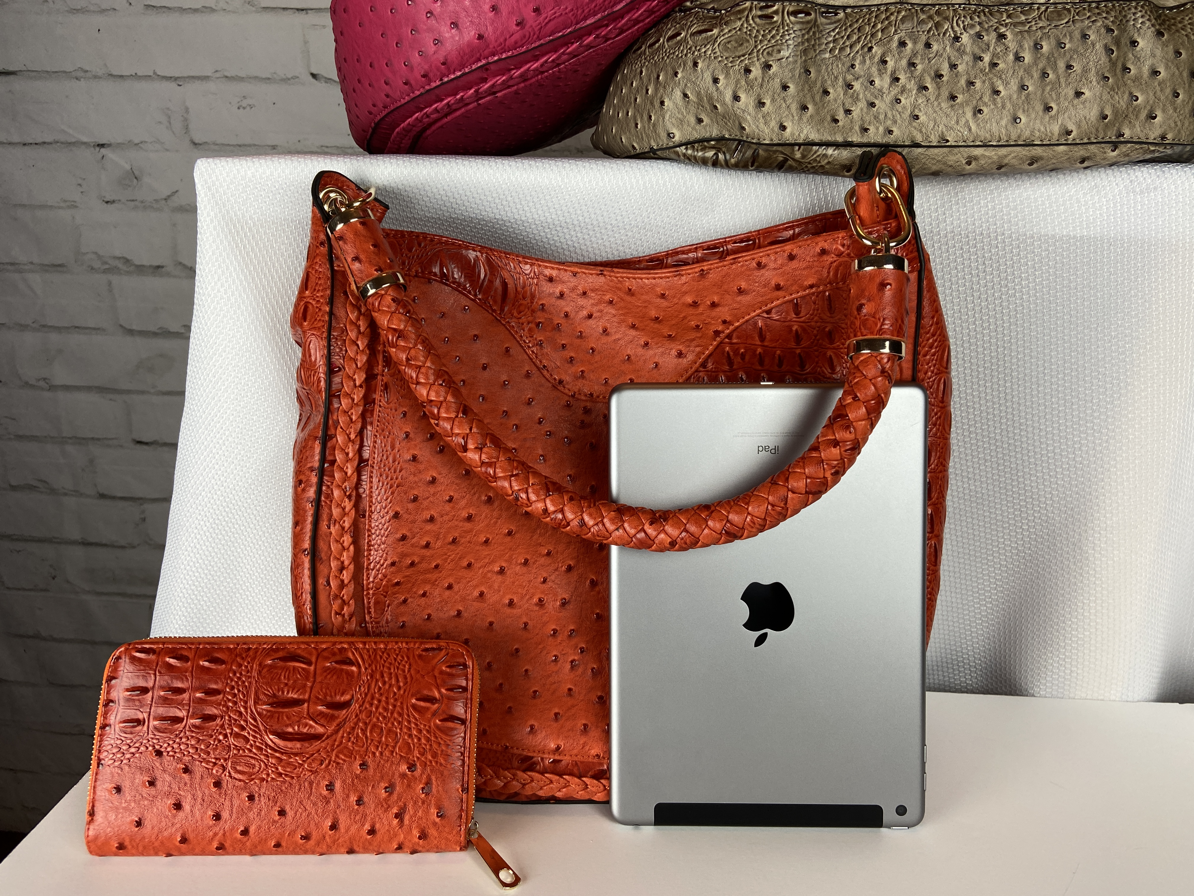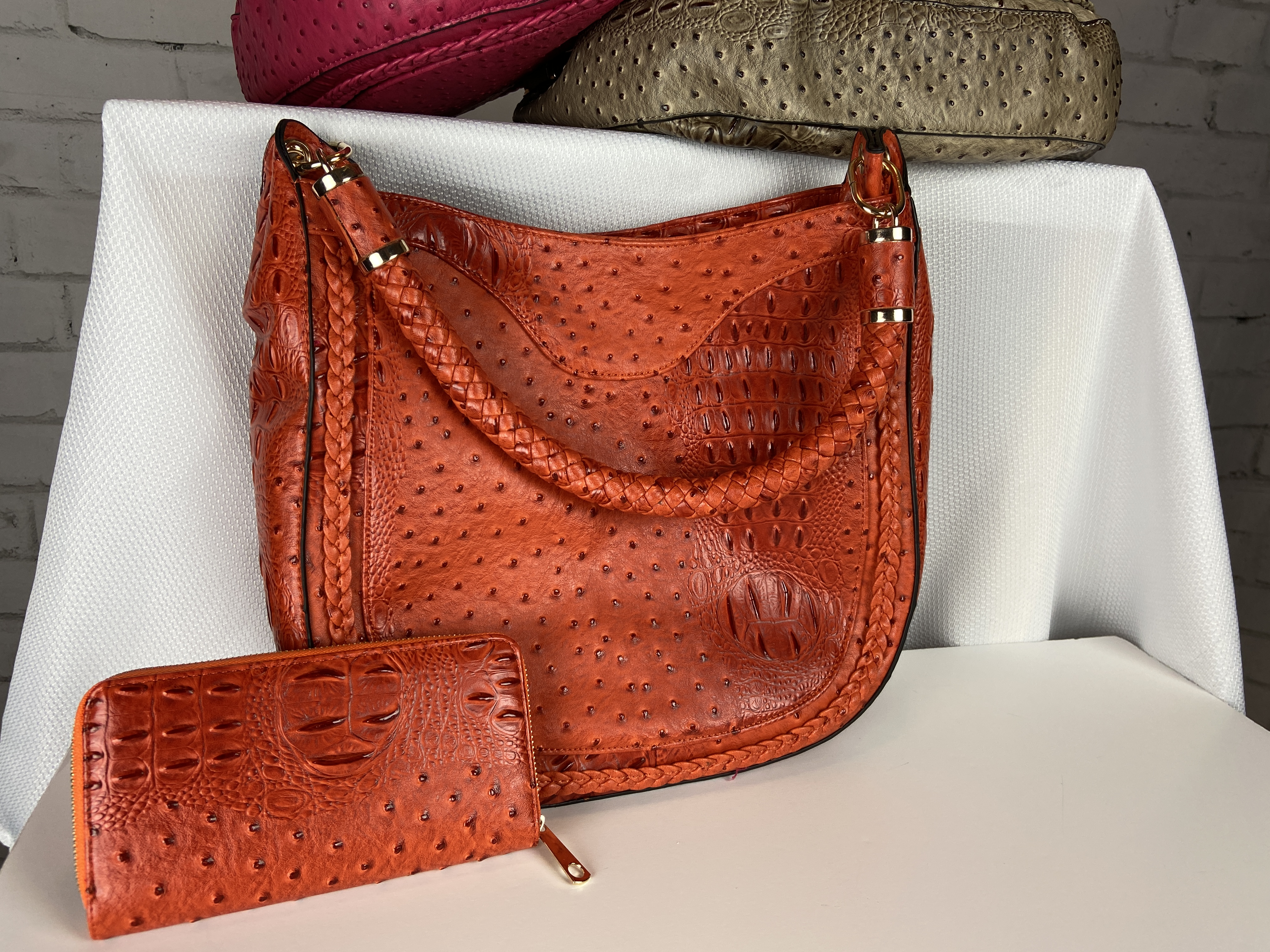 Orange color tone 2 in 1 ostrich hobo handbag and wallet set, gold hardware, multi zip 13.5 X 3 X 13 comes with dust cover. This is a very rich texted shoulder bag with a rounded strap so comfortable on your shoulder.