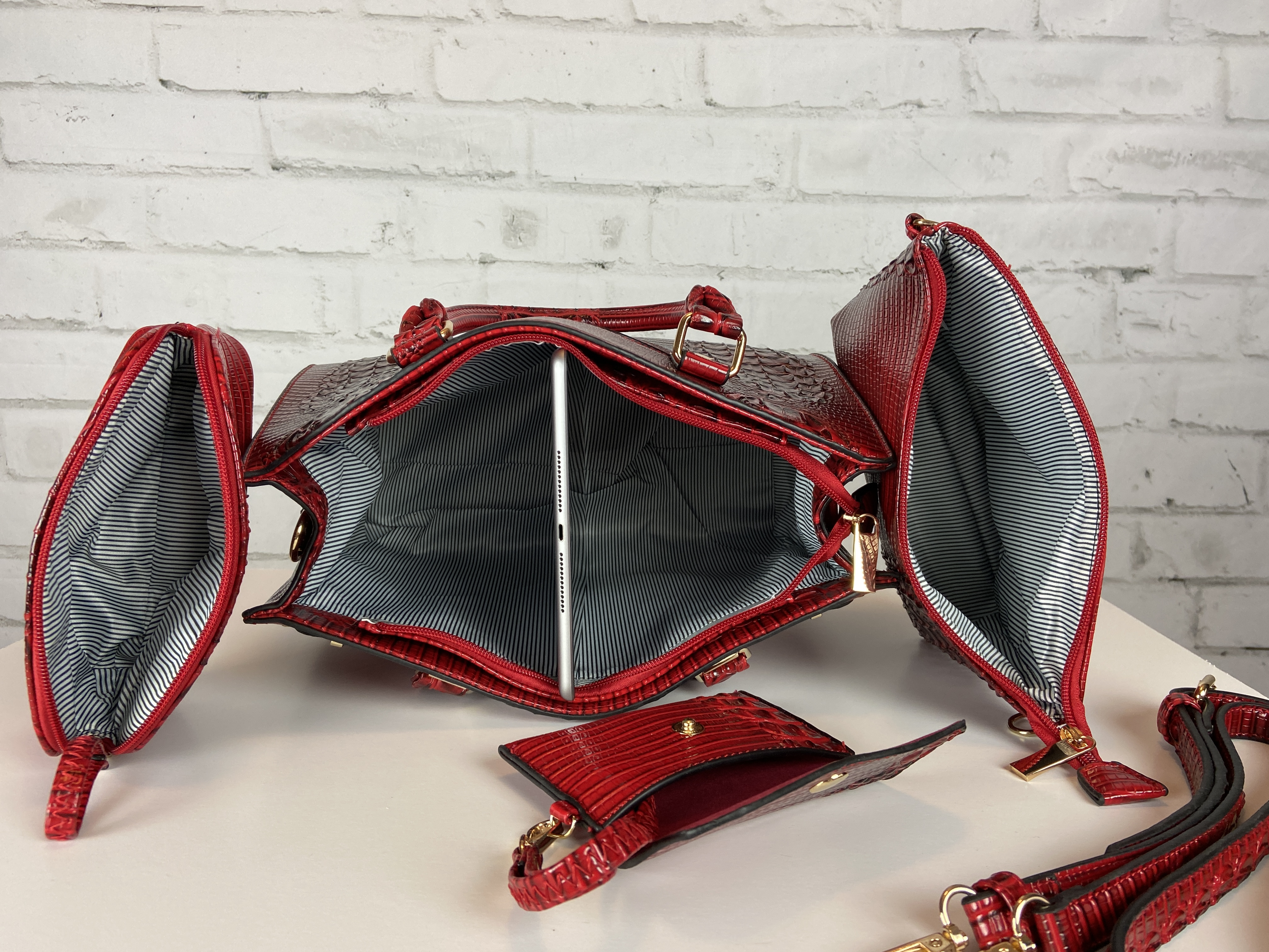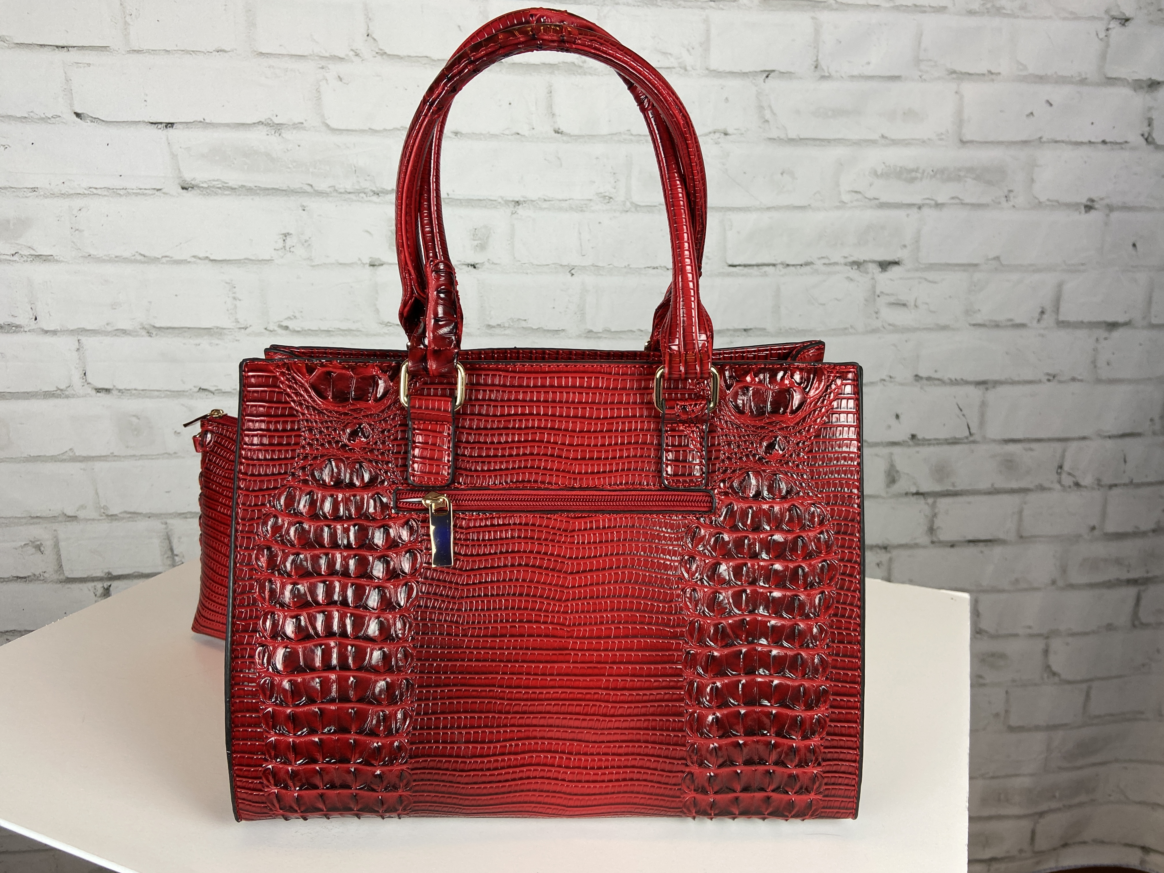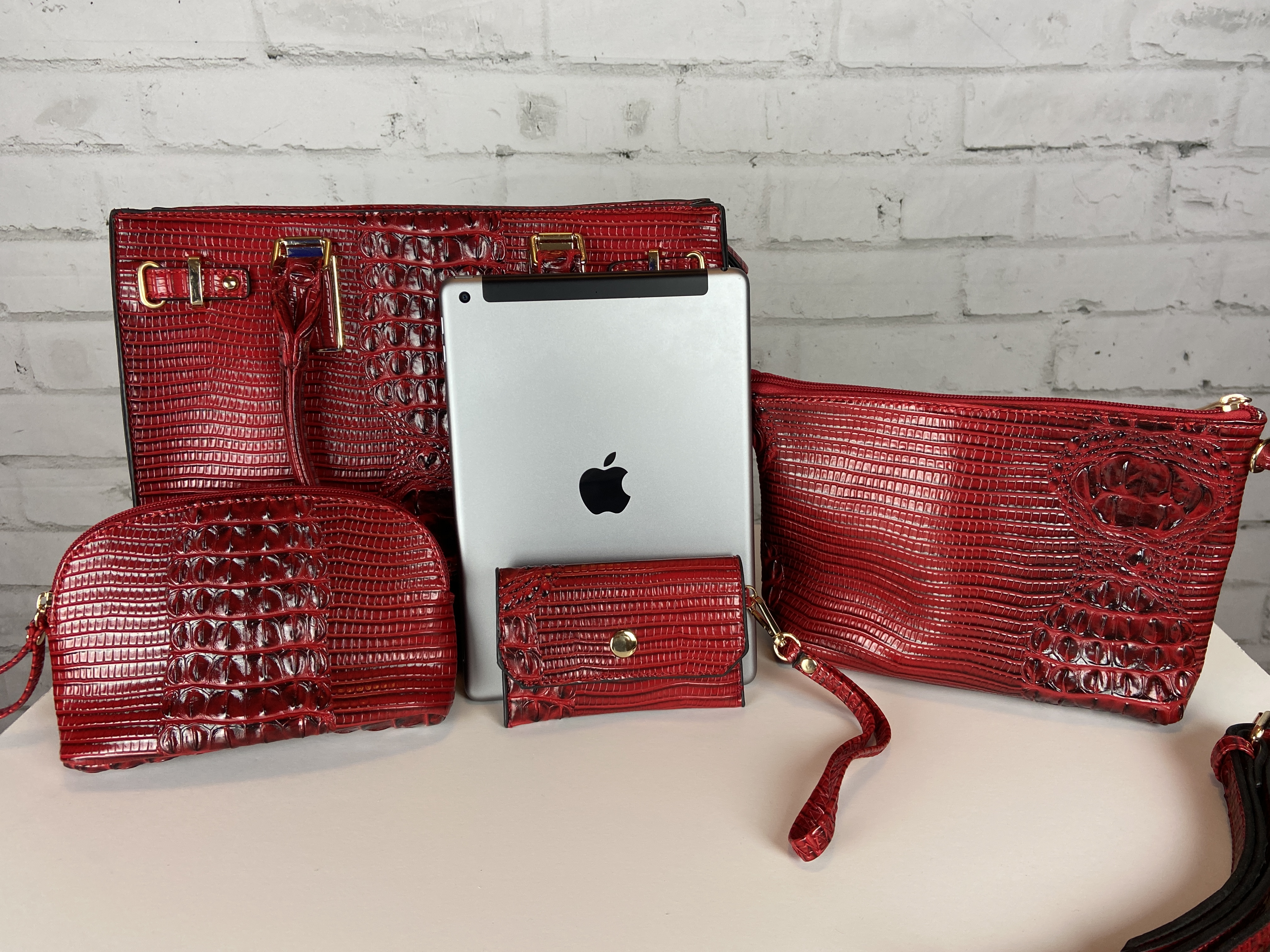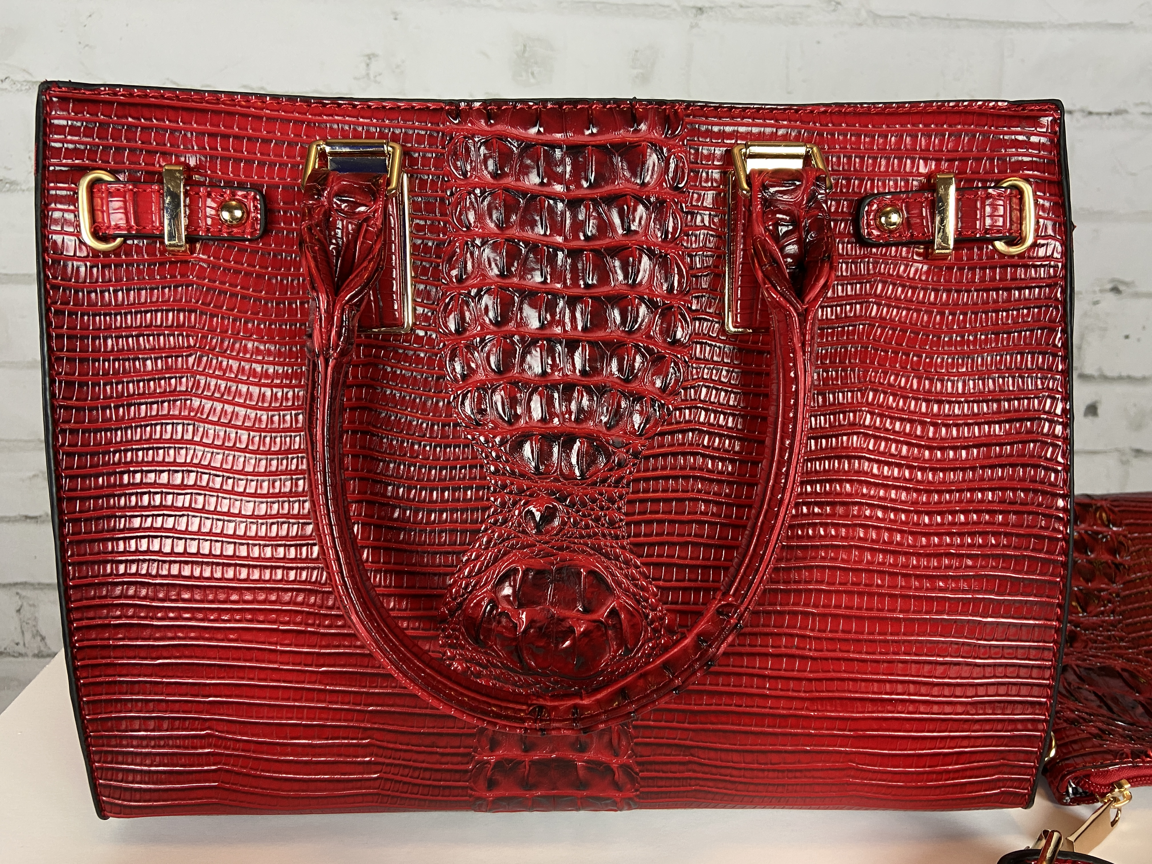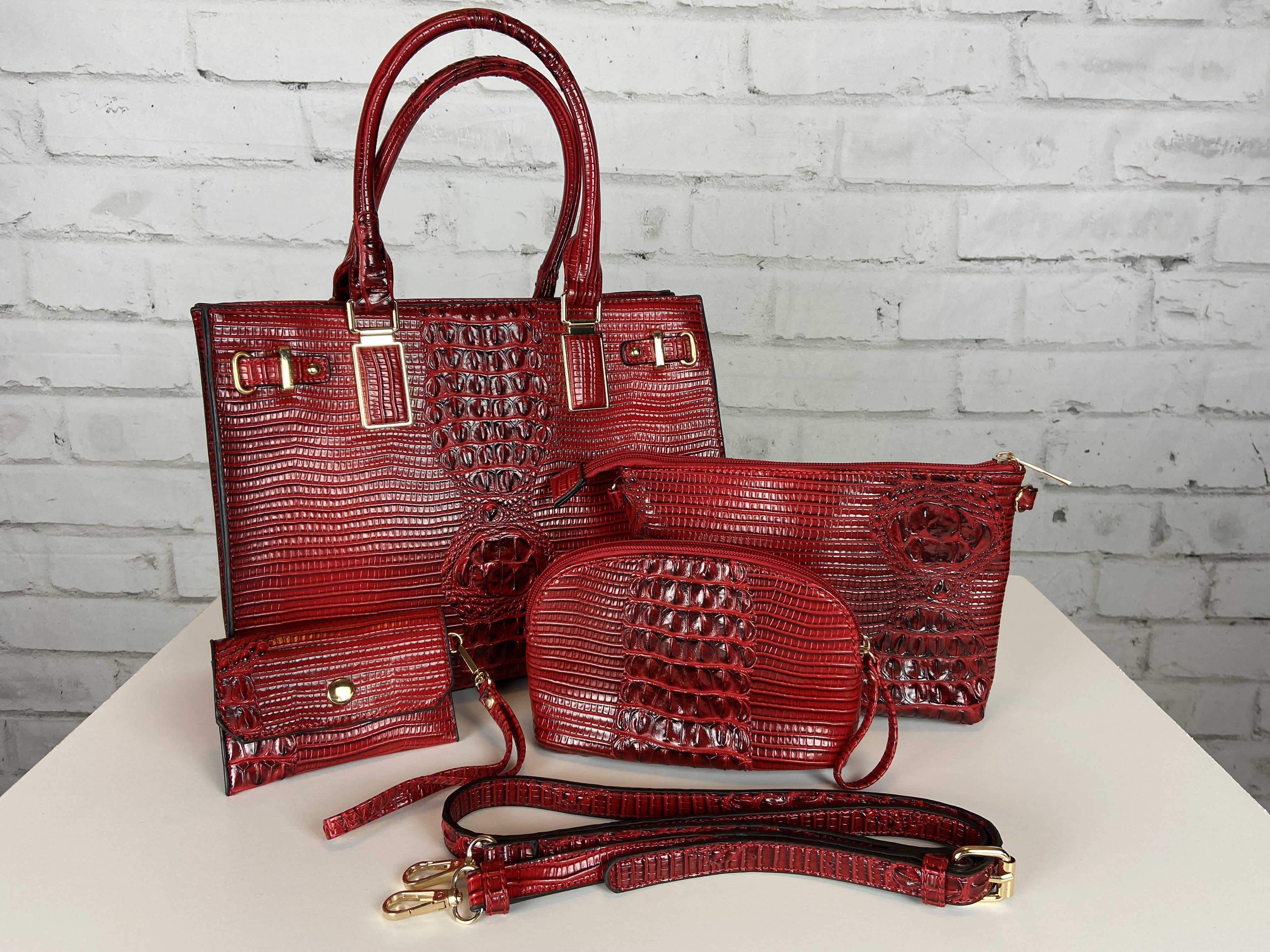 Red 4-in-1 boxy satchel faux leather with heavy gold hardware. Excellent quality, ajustable shoulder strap interchangable with second purse for a cross body too. Wristlet strap interchanable also. Rich beutiful red color excellent quality fashion Croc 4-in-1 Boxy Satchel Faux leather 4-in-1 Bag (Satchel, Crossbody, Clutch & Coin purse) Gold feet. Detachable shoulder strap L 13.5 * H 10.5 * W 5 (7 D) L 9.5 * H 6.5 * W 3 L 7.5 * H 5 * W 2 L 5.25 * H 3.5 * W 0.5 comes with dust cover. OMG this is a hot handbag set, extremely great quality, you are sure to get noticed with this handbag.