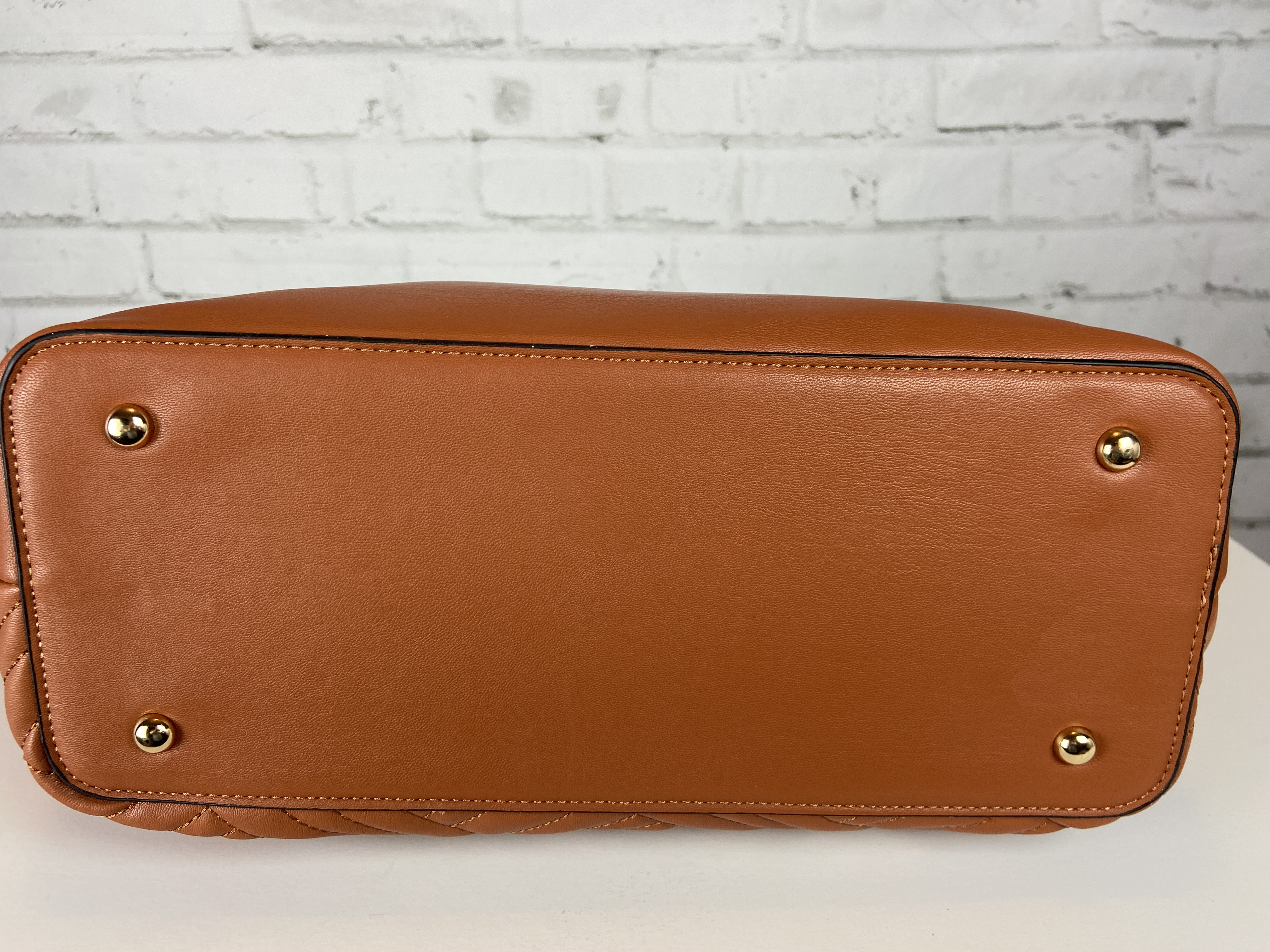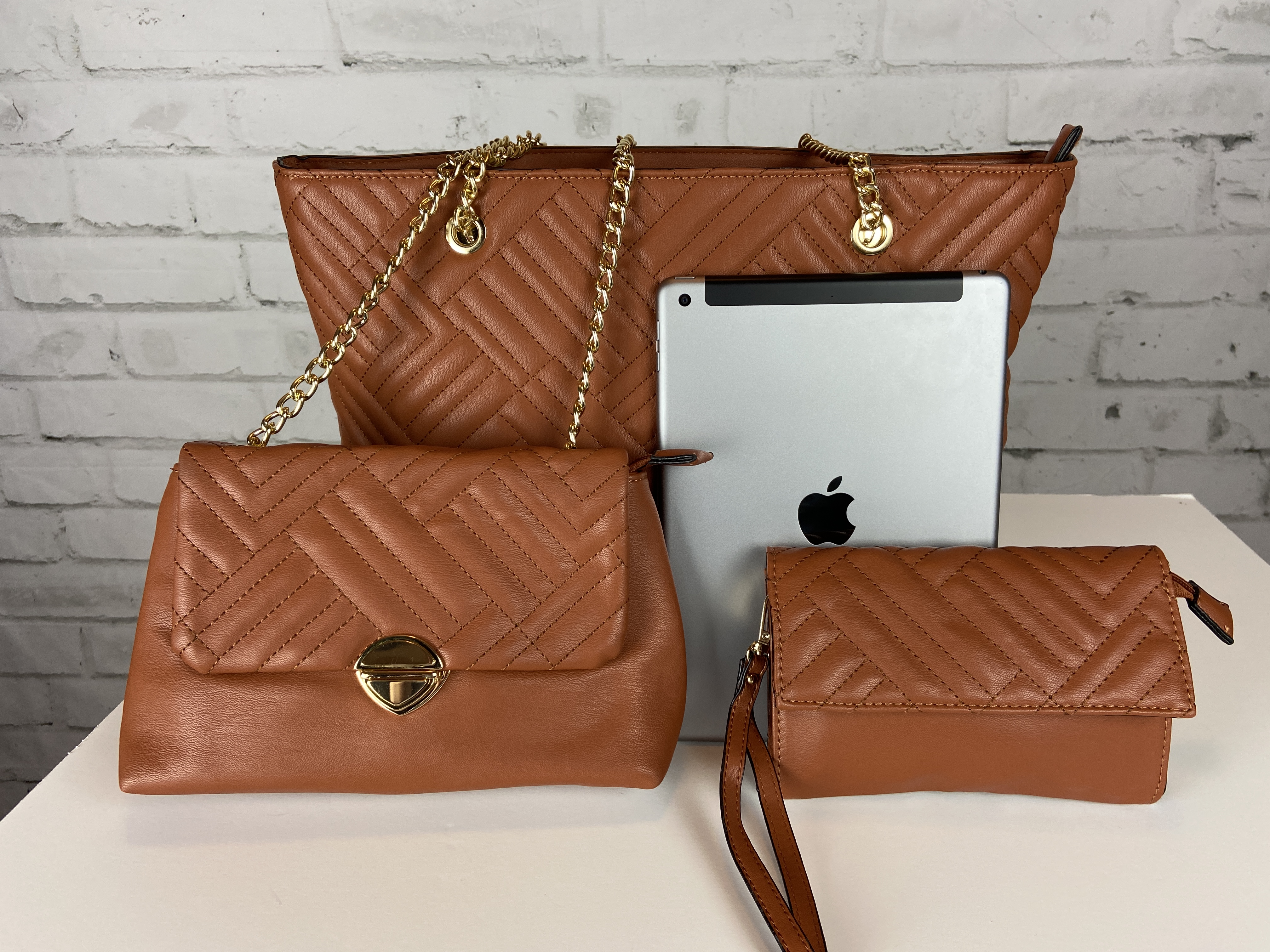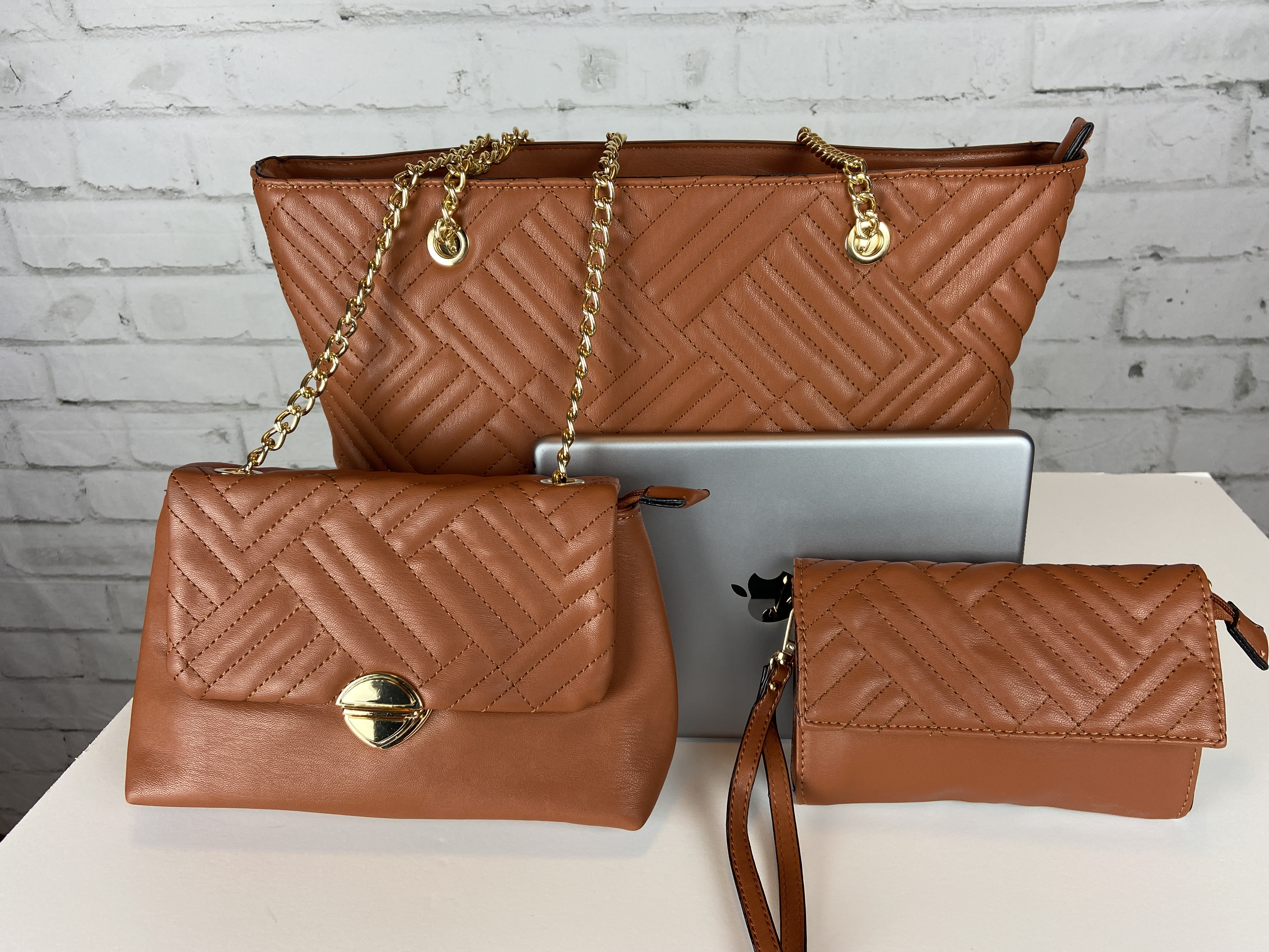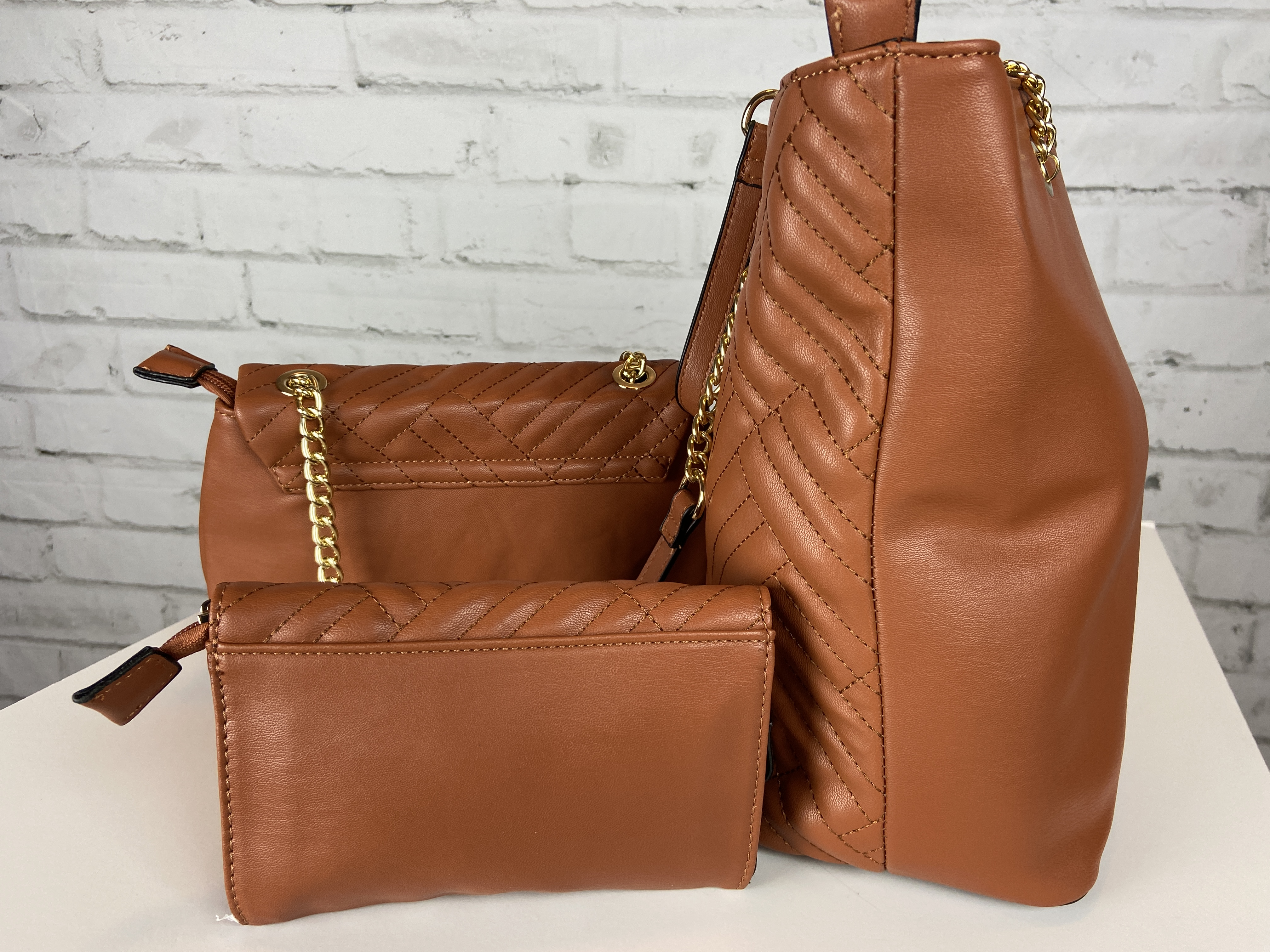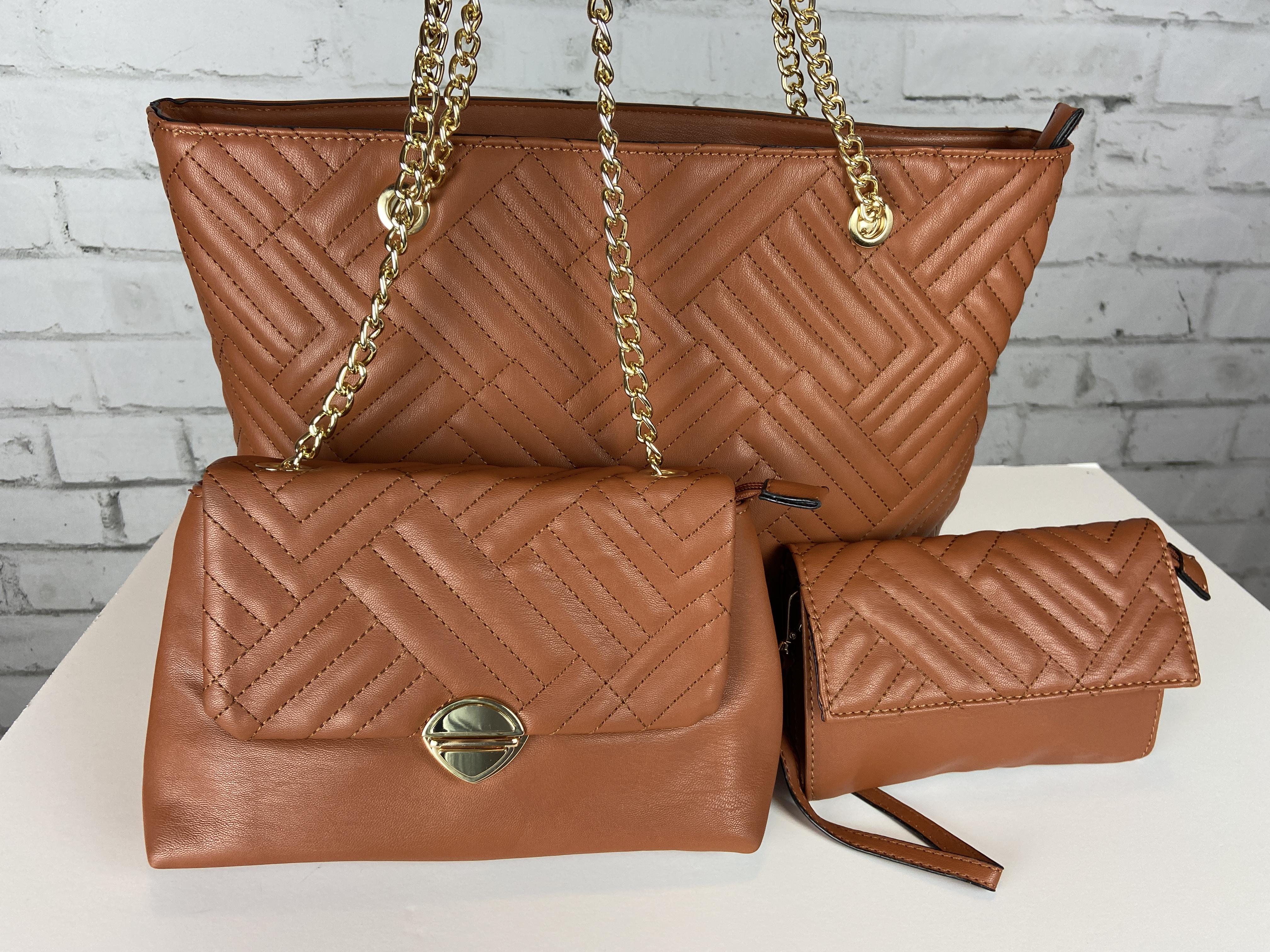 Saddle brown large quilted tote, cross body clutch slide, & wristlet. 3-in-1 fashion shopper bag set faux leather. Tote zipper top open, secure zipper entry. Cross body clutch slide in clasp closure 16.25 w x 5 d x 13 h comes with dust cover. Gold tone hardware, quality stiching, the look and feel of this bag is so luxurious. Gold feet. Inside is a fun stripe lining, media compartment and a inside zipper pocket. The saddle brown color is a staple color every one should have and can be used year round.