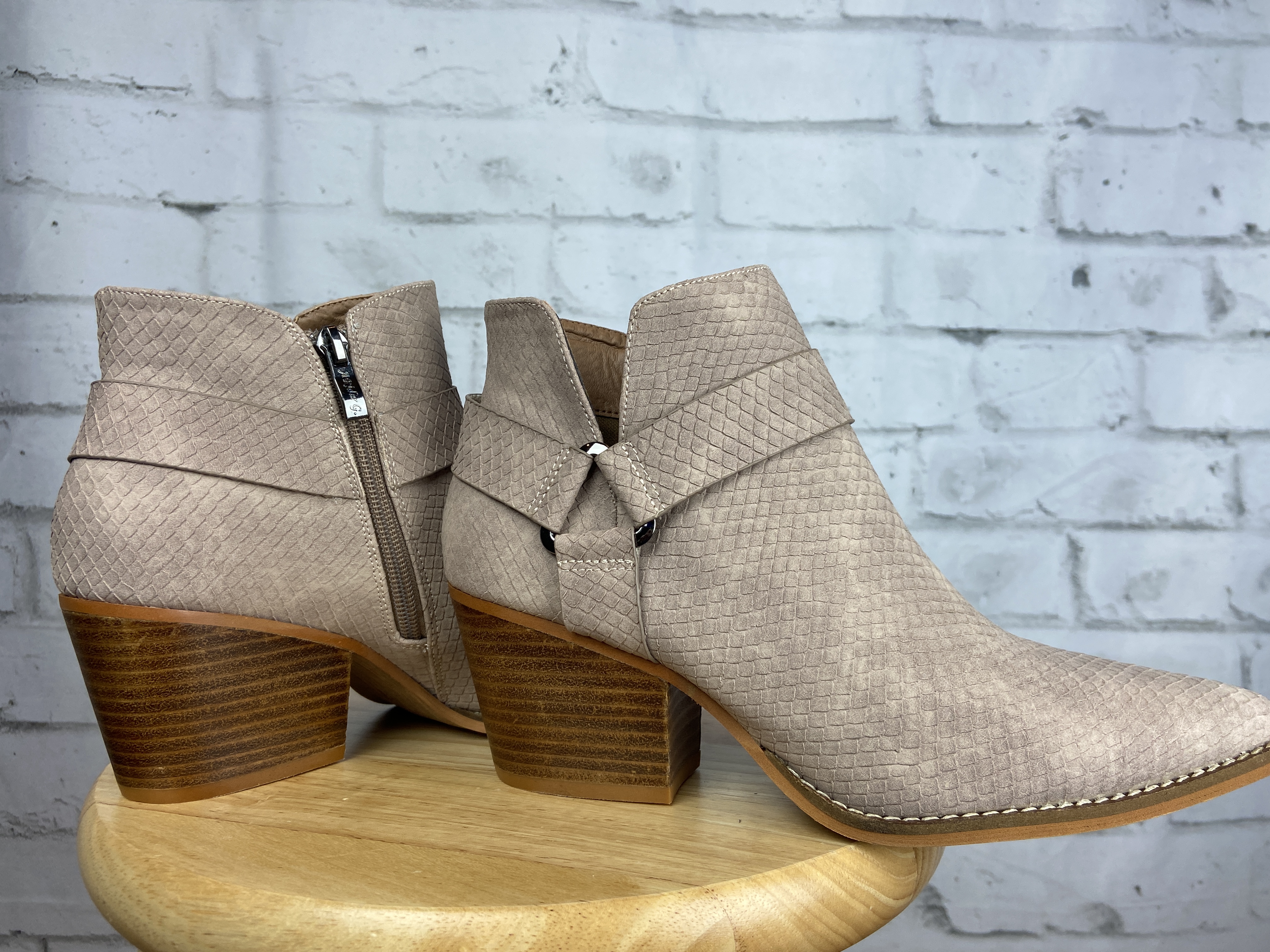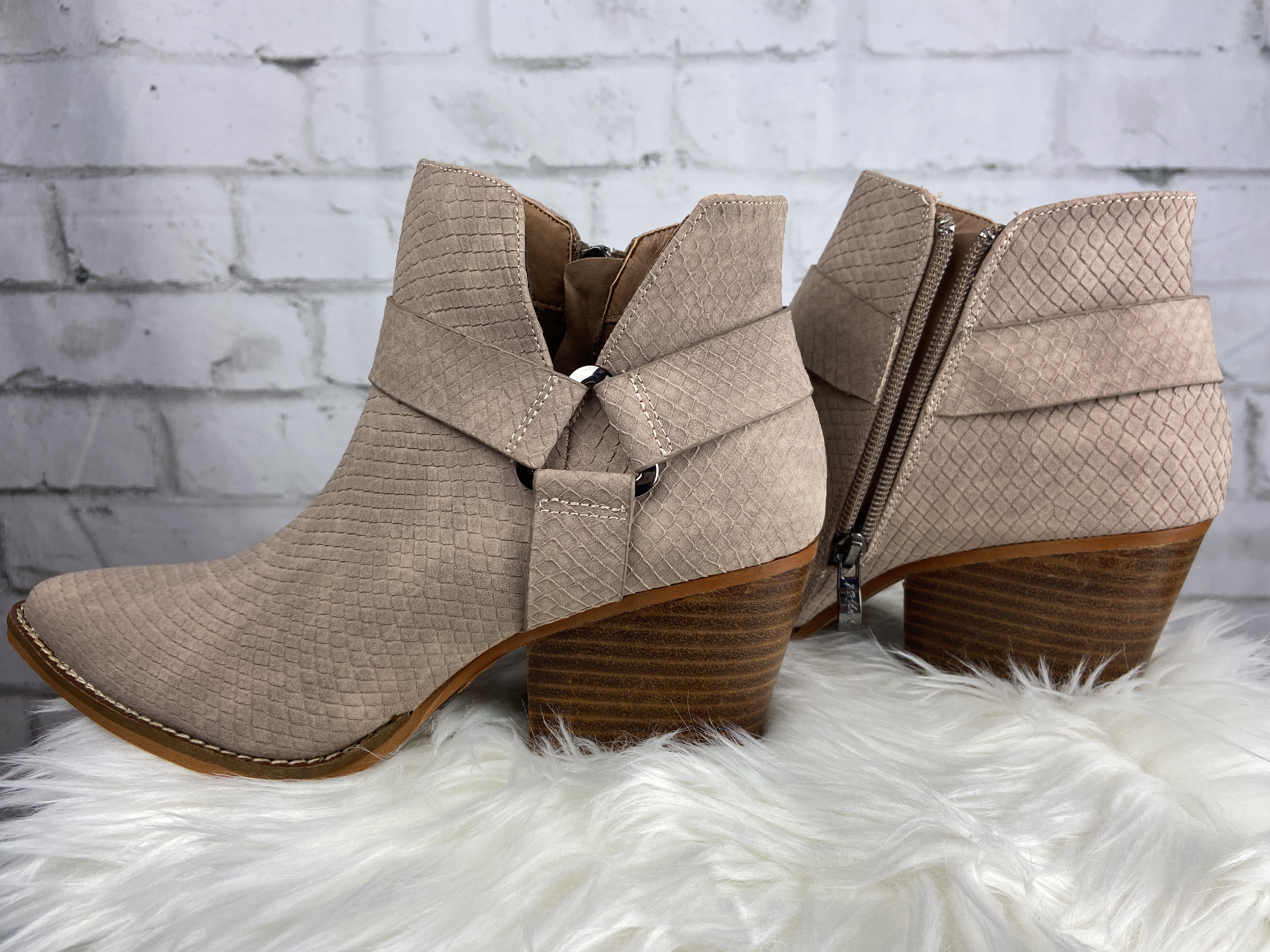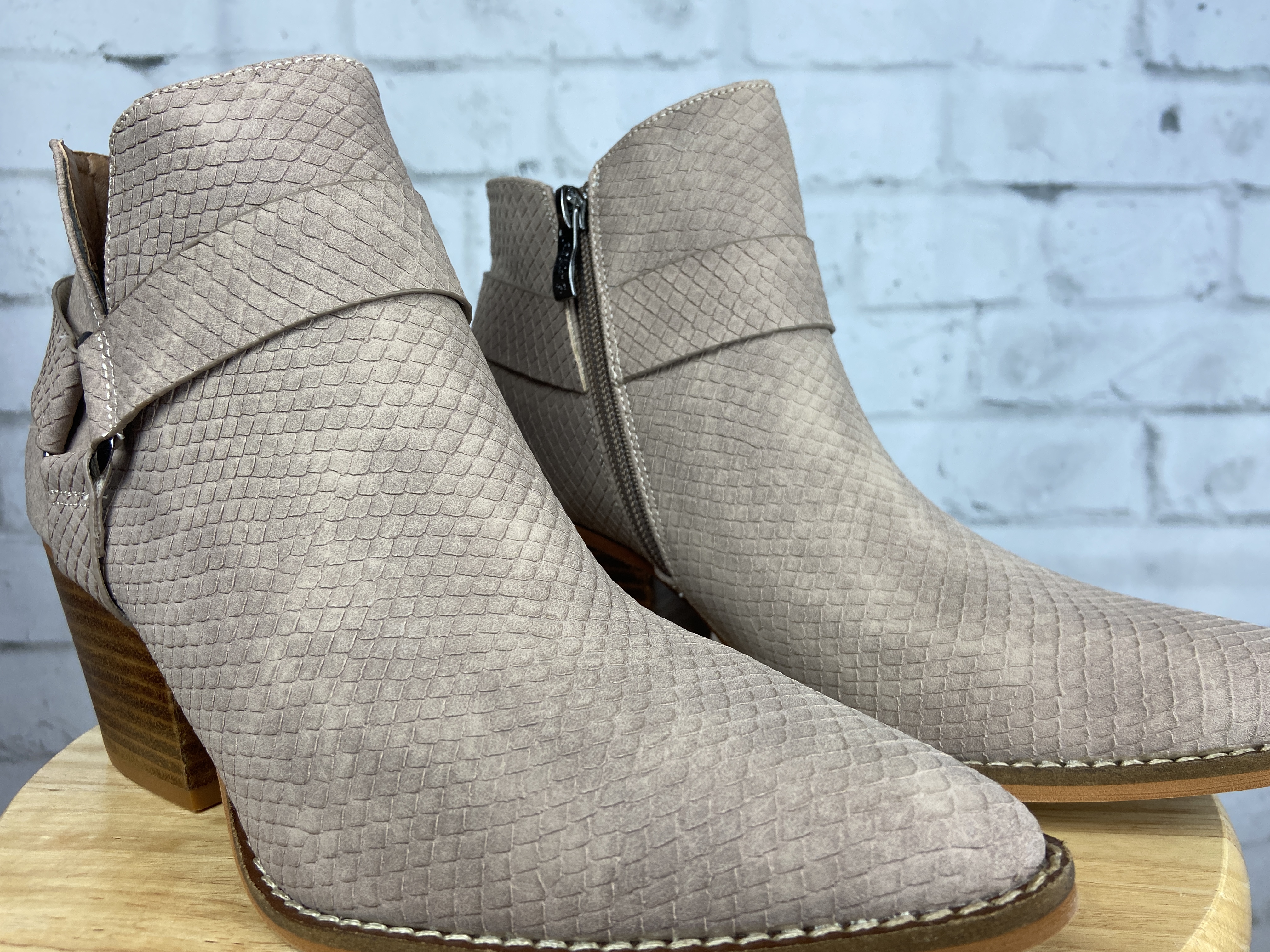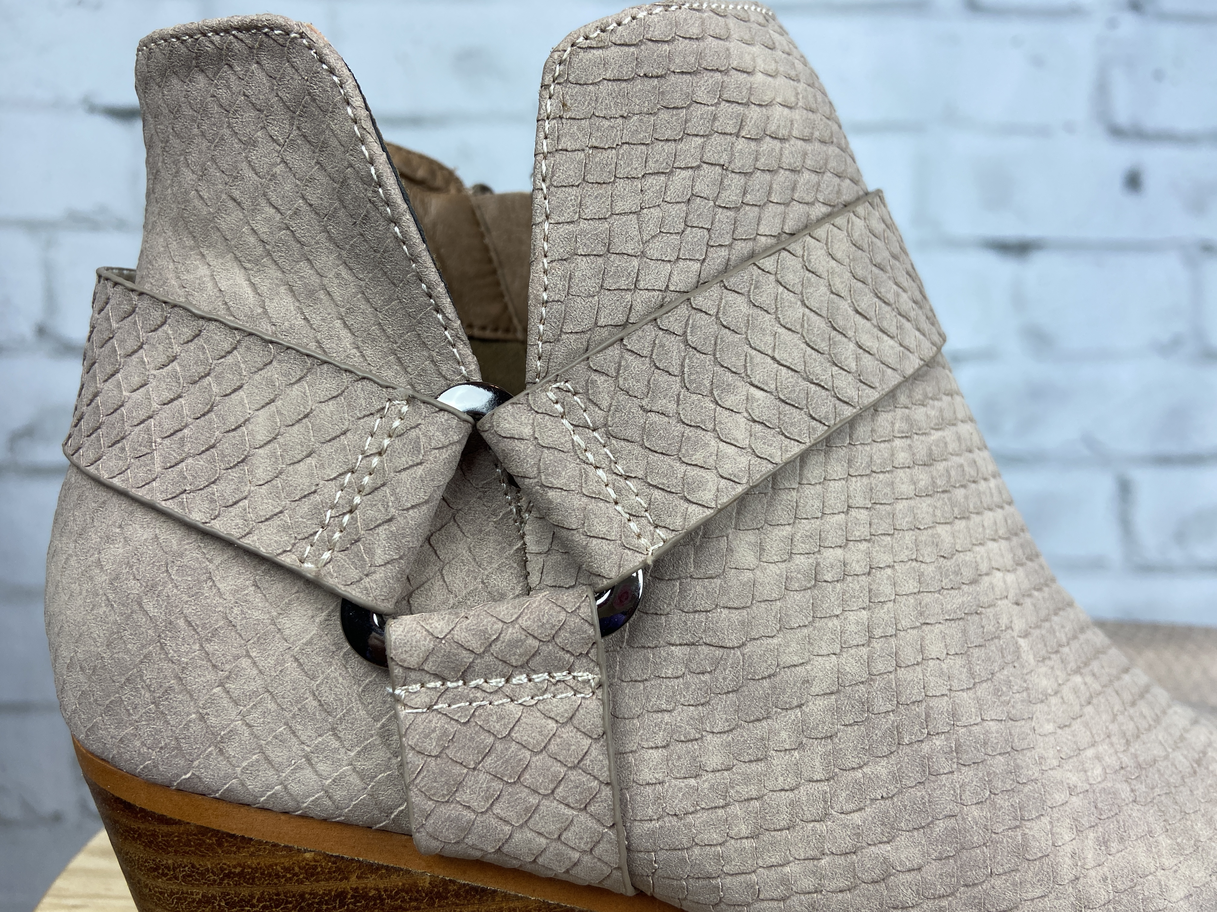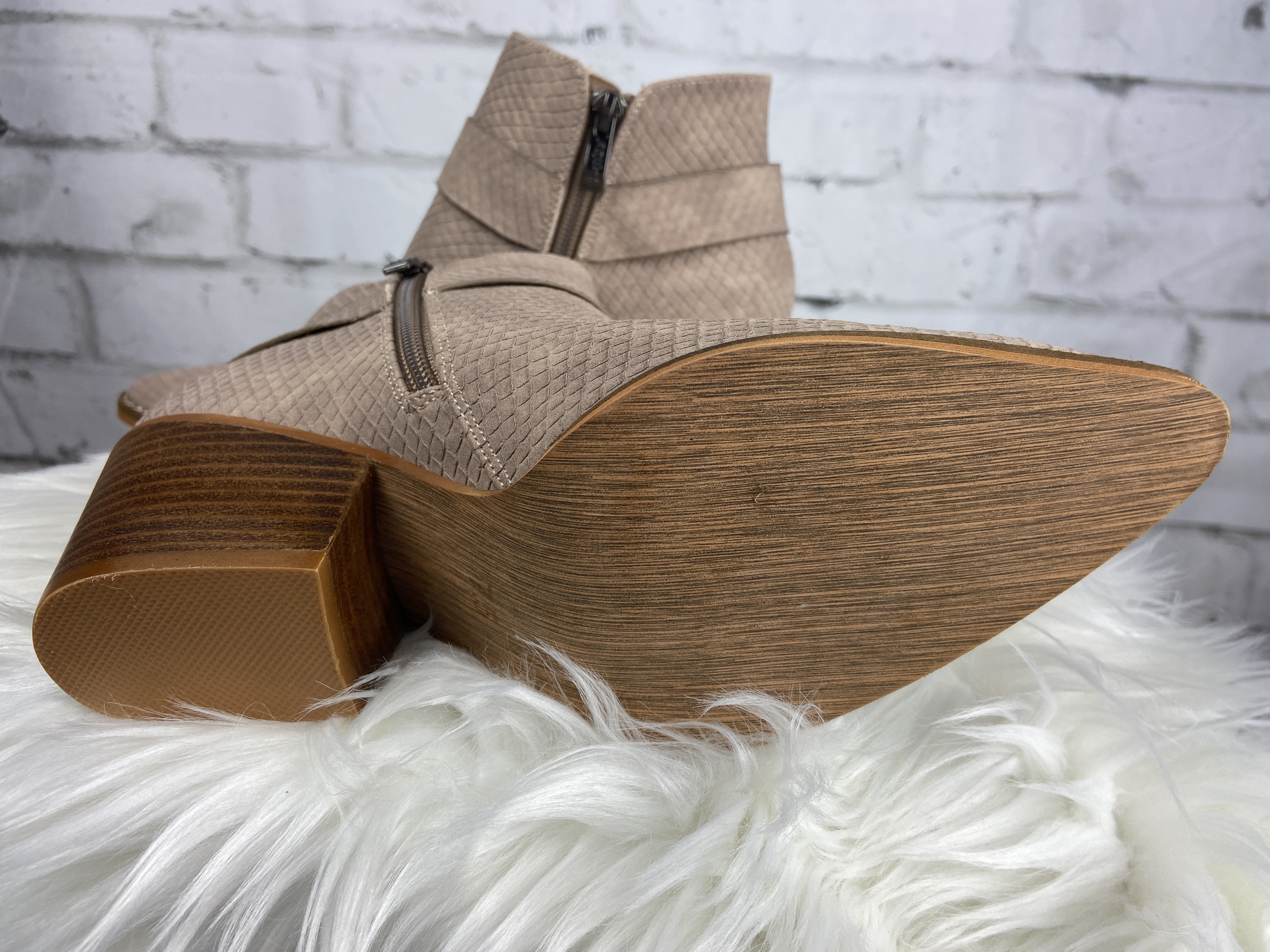Snake taupe bootie side zipper unique outside design medium heel very comfortable neutral color goes with everything. This taupe bootie snake design is an essential and wearable in all seasons.