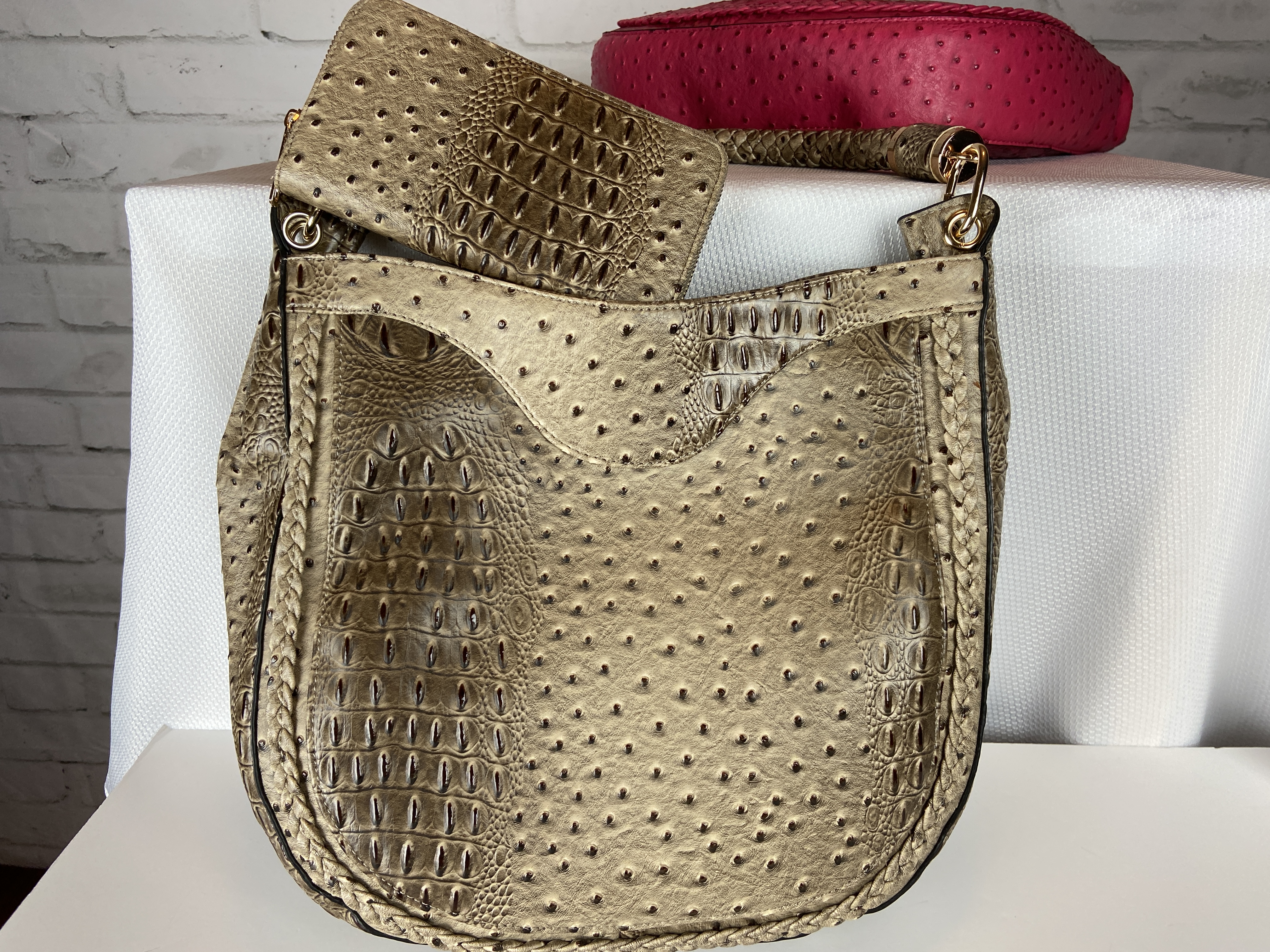 Stone color tone 2 in 1 ostrich hobo handbag and wallet set, gold hardware, multi zip 13.5 X 3 X 13 comes with dust cover. This is a very rich texted shoulder bag with a rounded strap so comfortable on your shoulder.