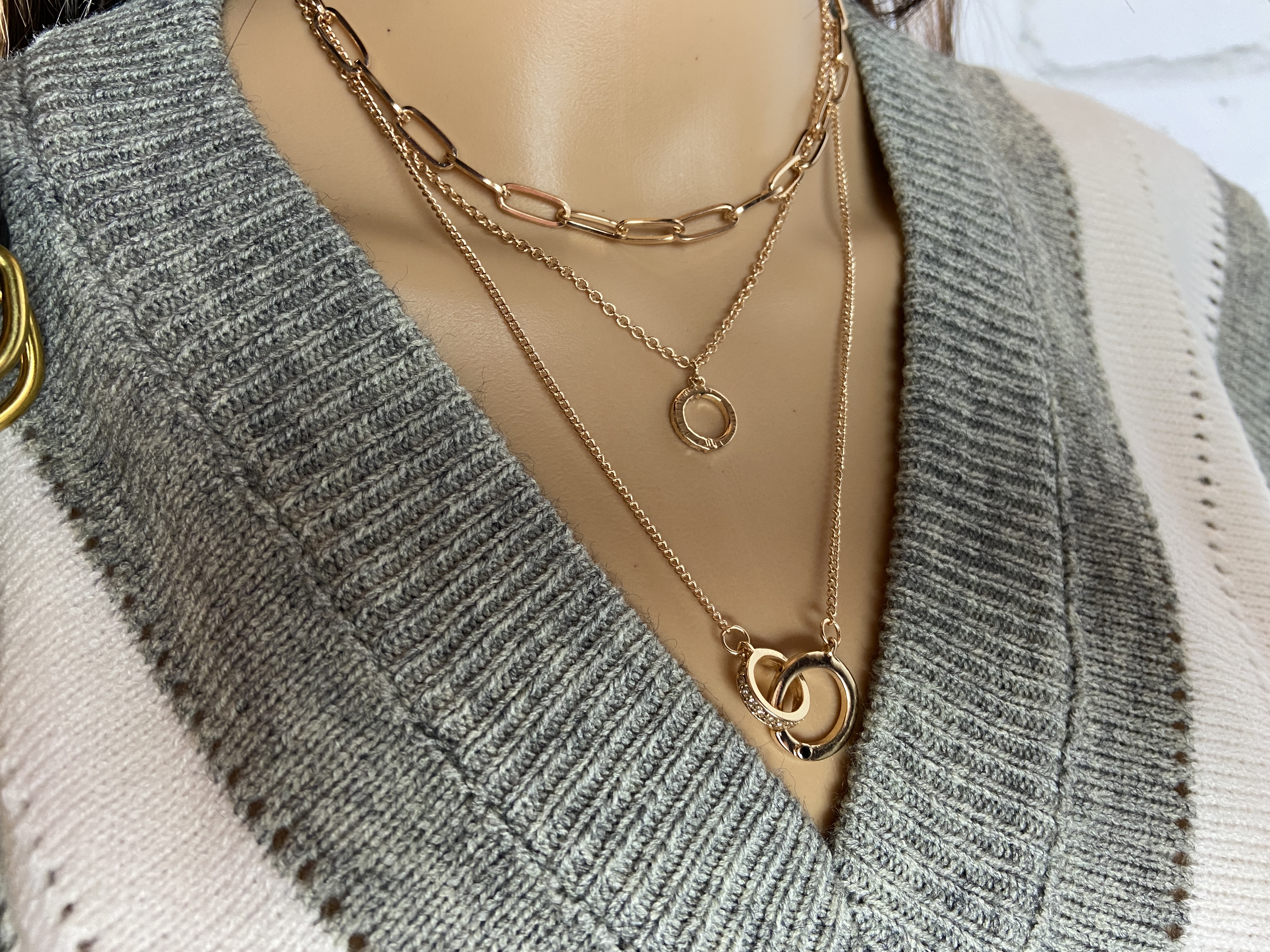 Here is a collection of highly polished that shine brilliantly, an excellent choice of traditional designs of a double "O" link DIMENSION length: 19", 16", 14" charm size: 1", .5" ext: 3" Ball Chain Ext clasp: Lobster Claw metal finish: Gold Plated product: Lead & Nickel Compliant anti-tarnish: Double E-coating