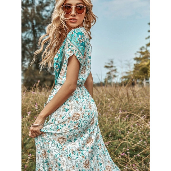 - The dress is detailed with cute tulip sleeves. Features a v neckline, multicolor print, flowy skirt, and floor-length.