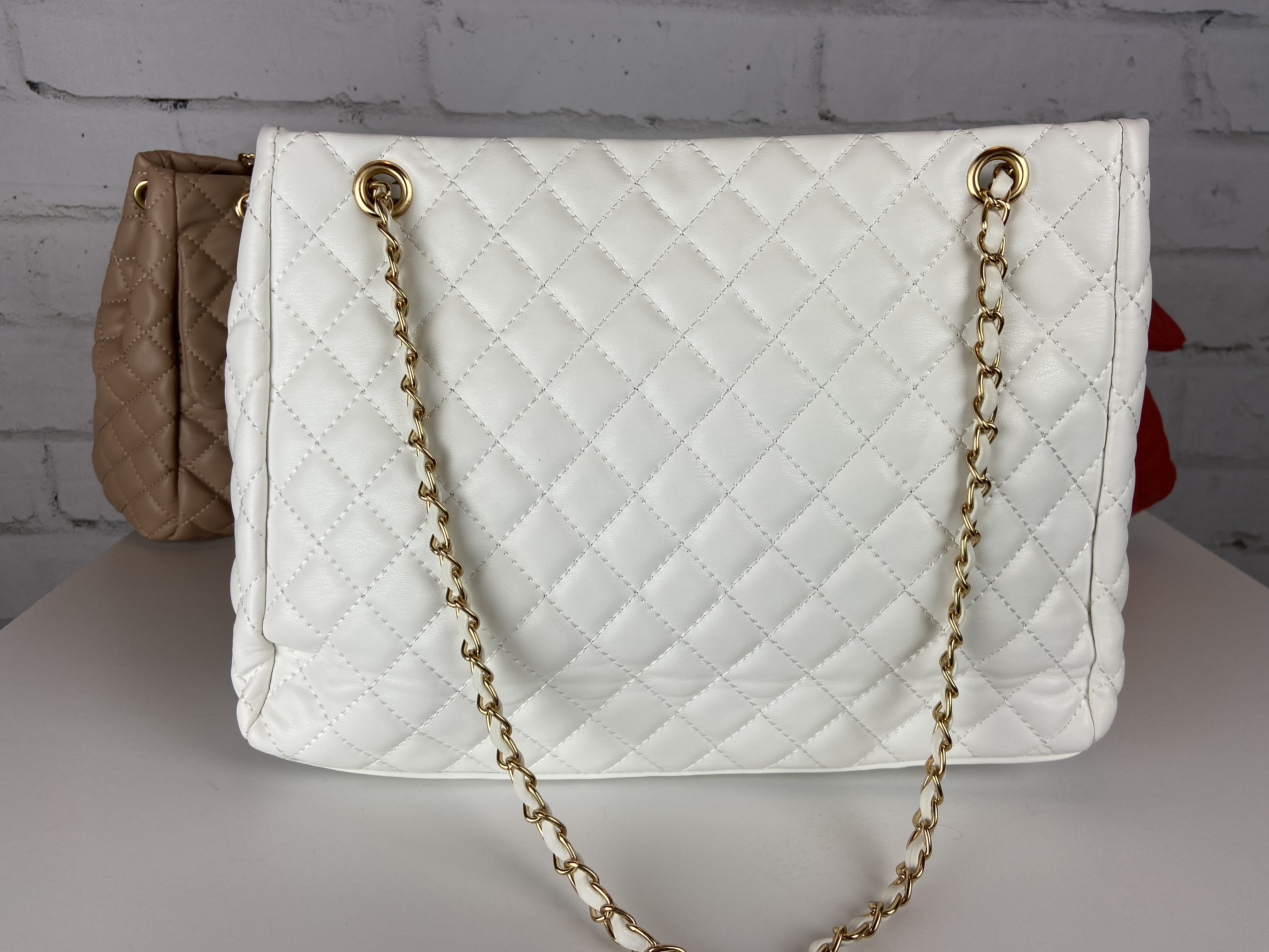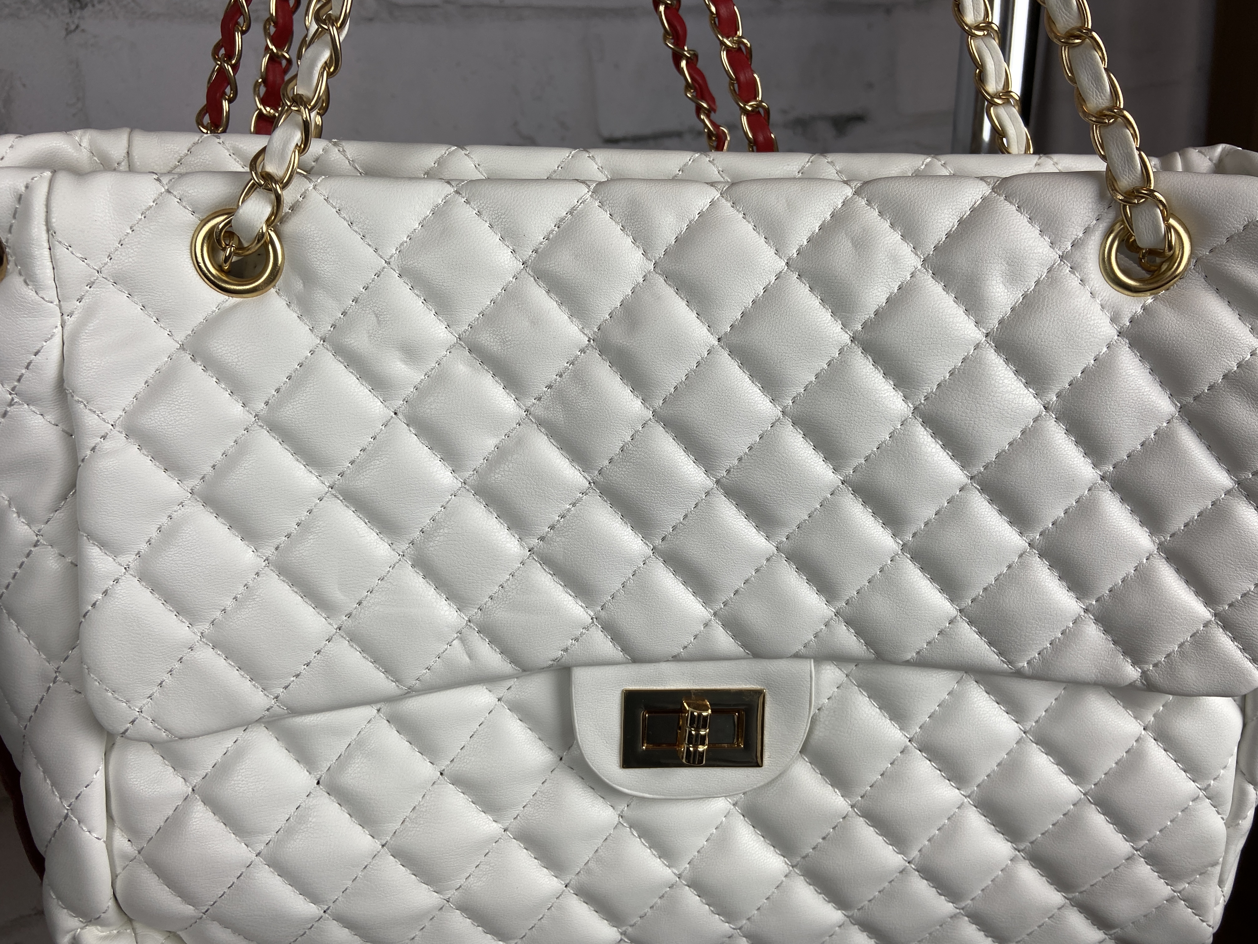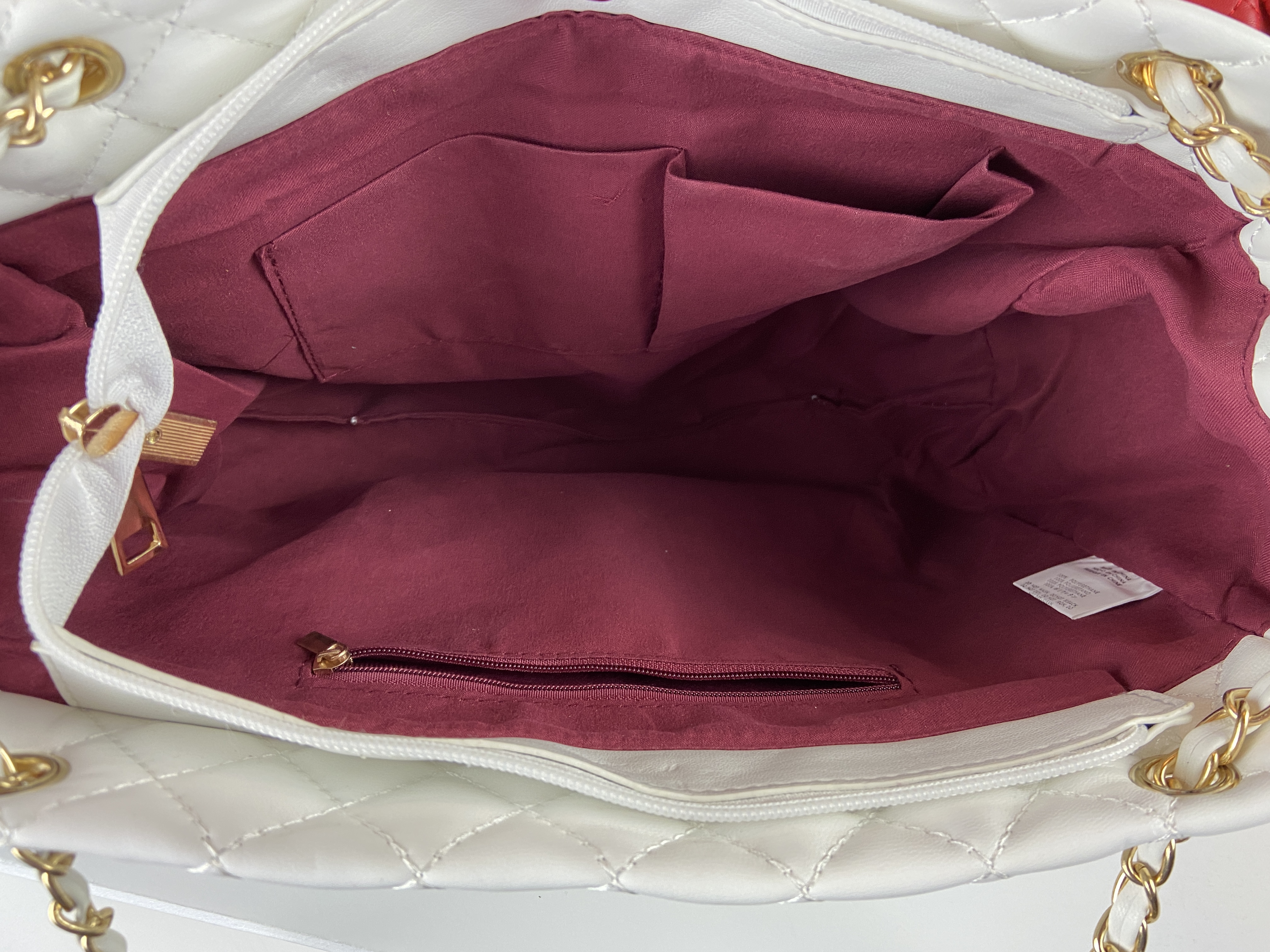 White Quilted Chain Handbag Front Pocket Zipper Closure Very Large Bag, Exquisite Luxurious Head Turning Handbag