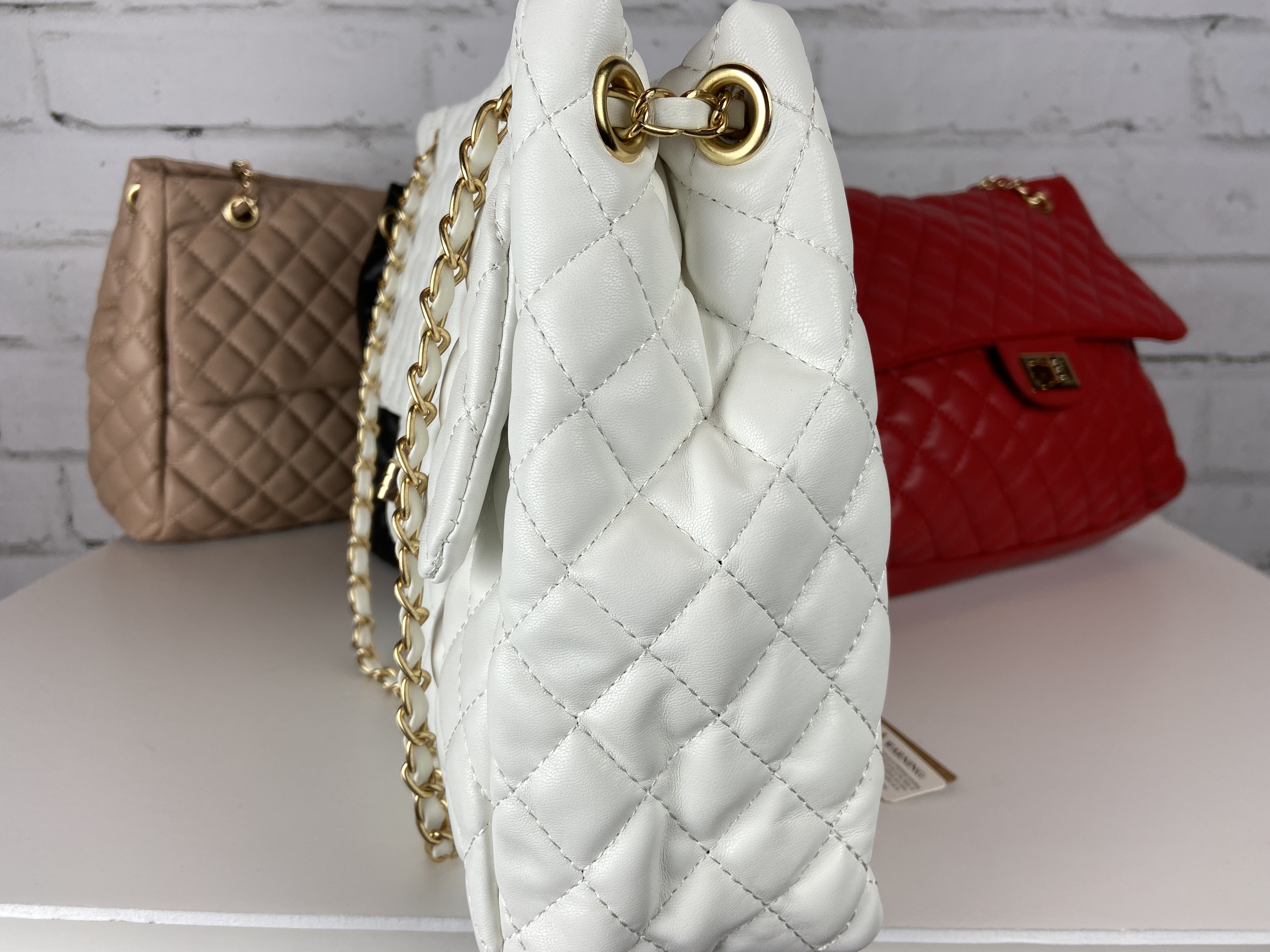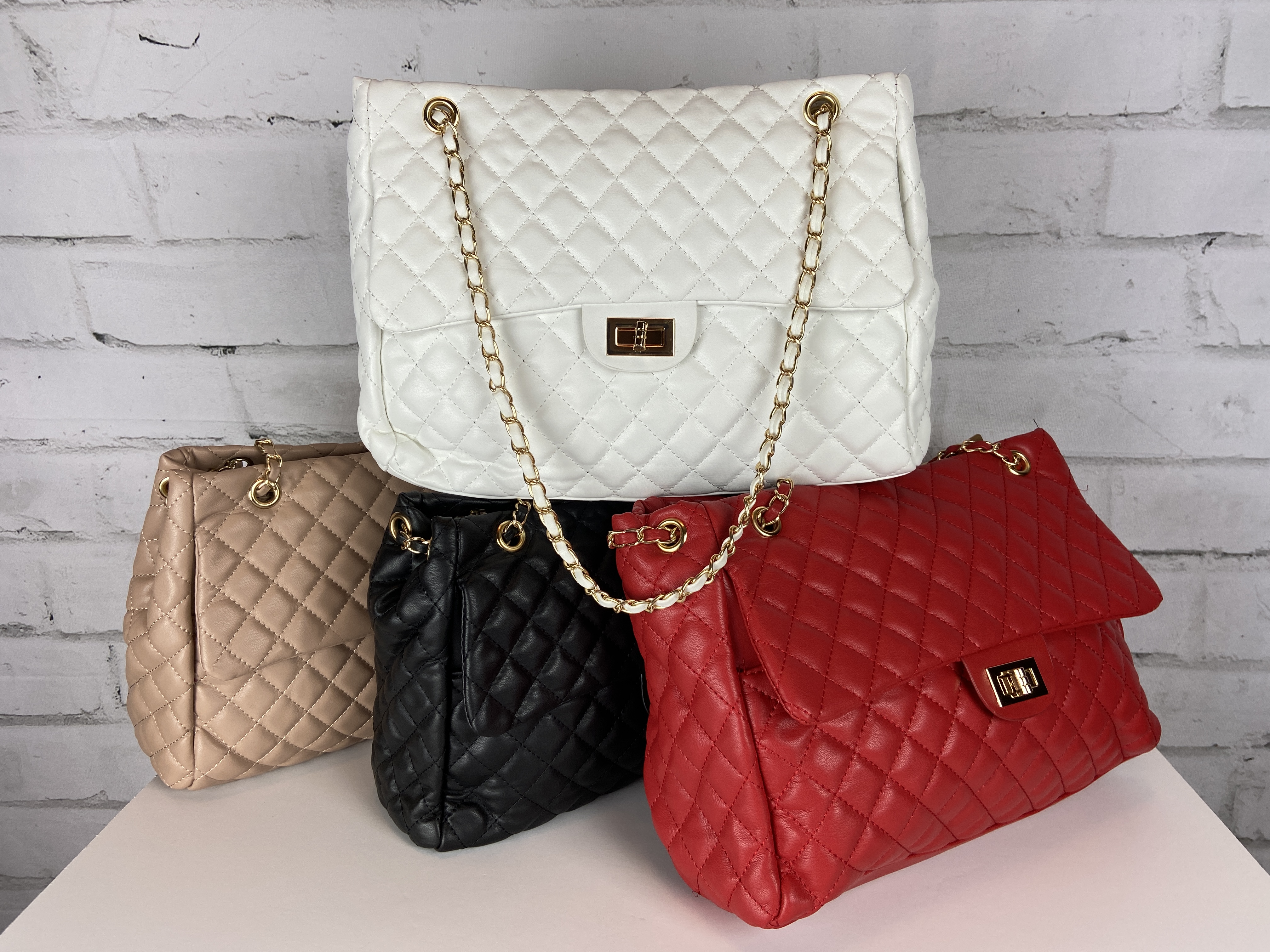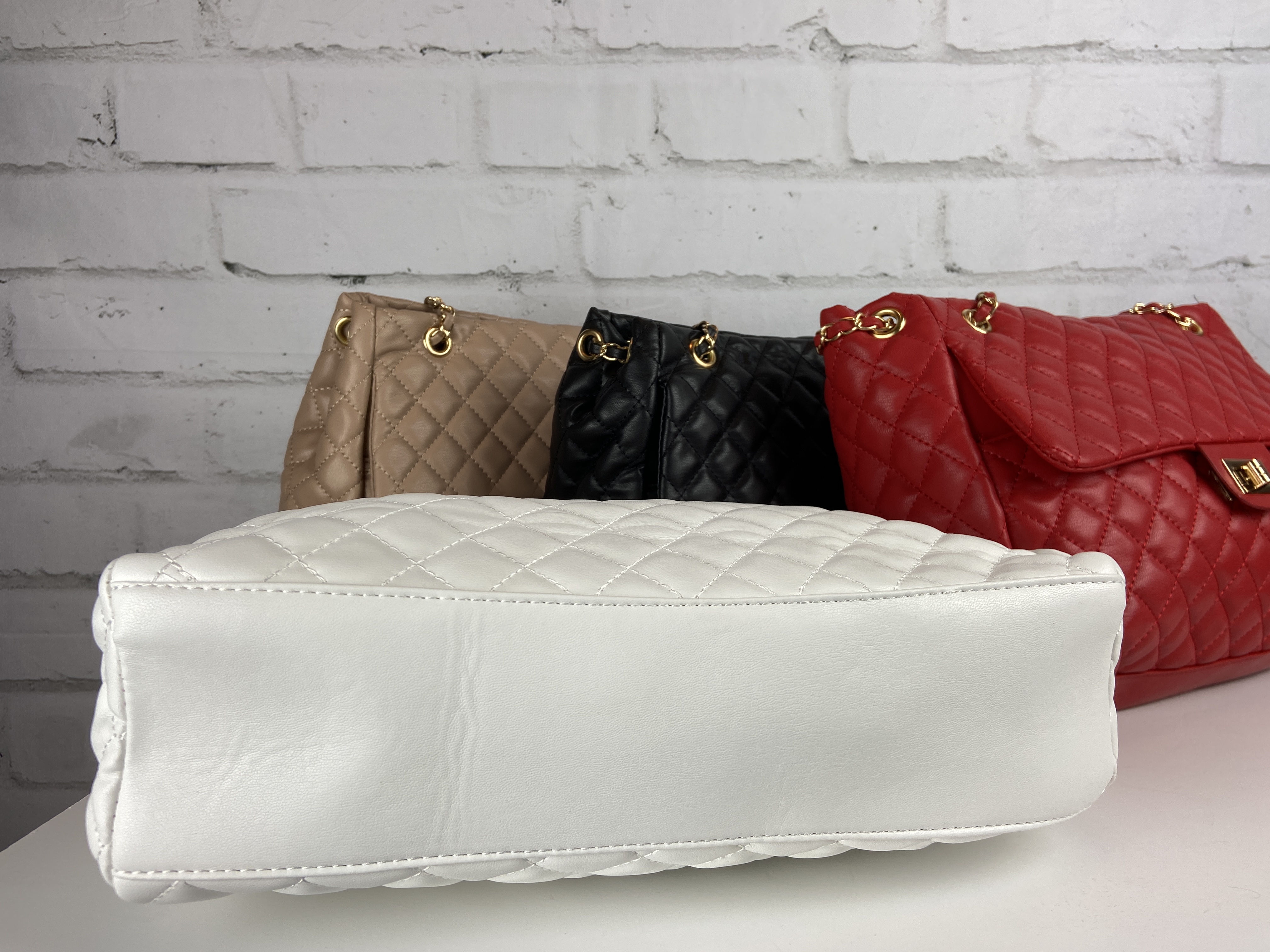 White Quilted Chain Handbag Front Pocket Zipper Closure Very Large Bag, Exquisite Luxurious Head Turning Handbag