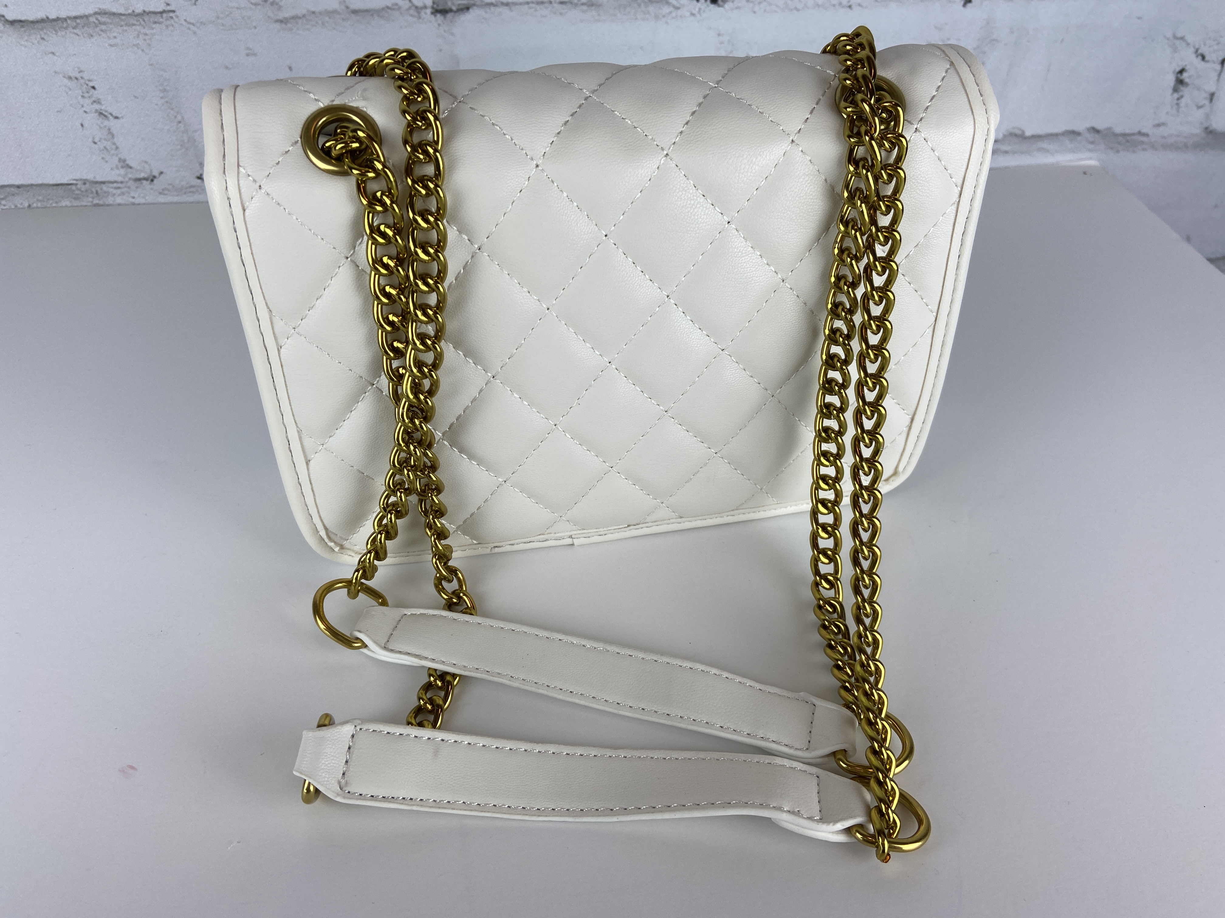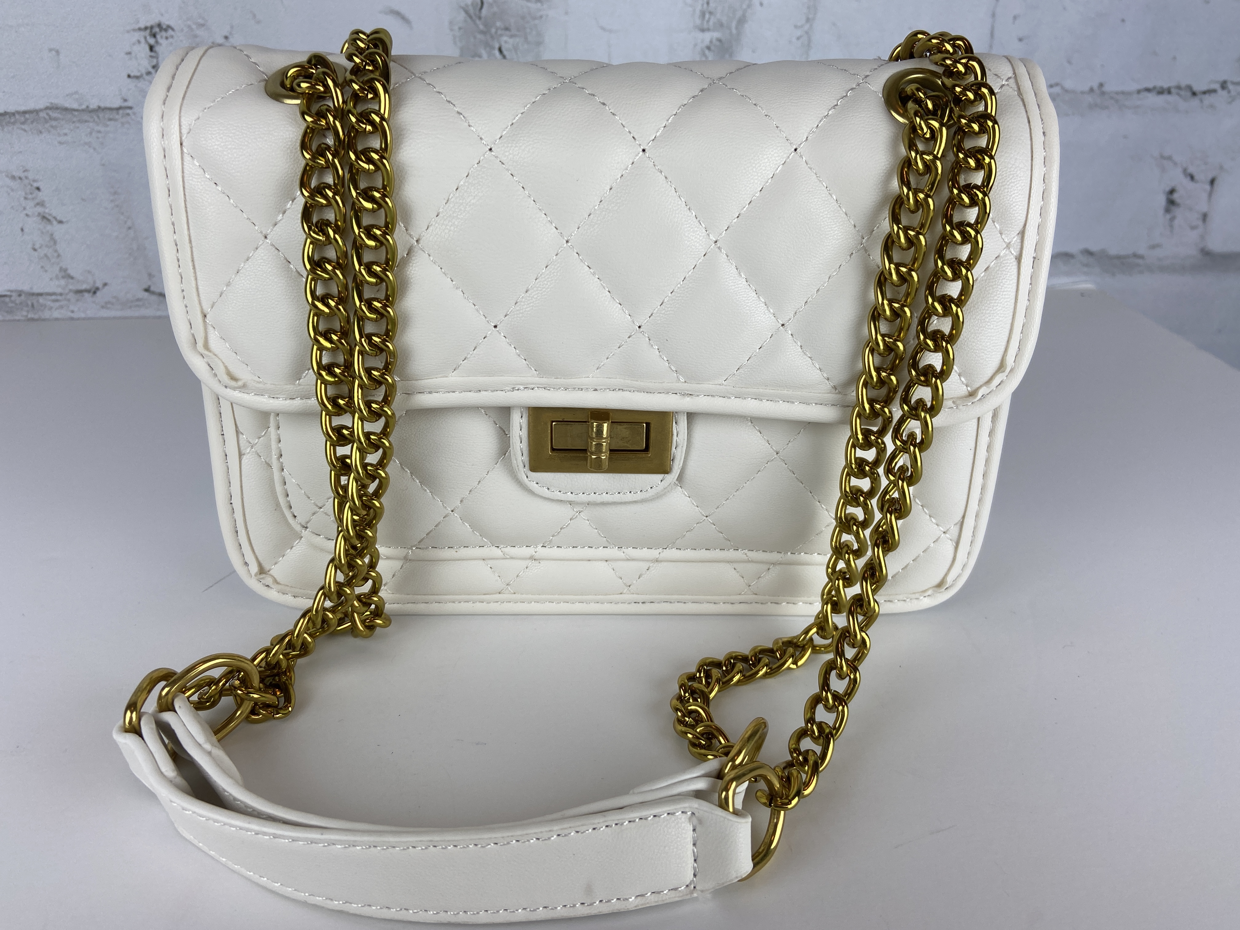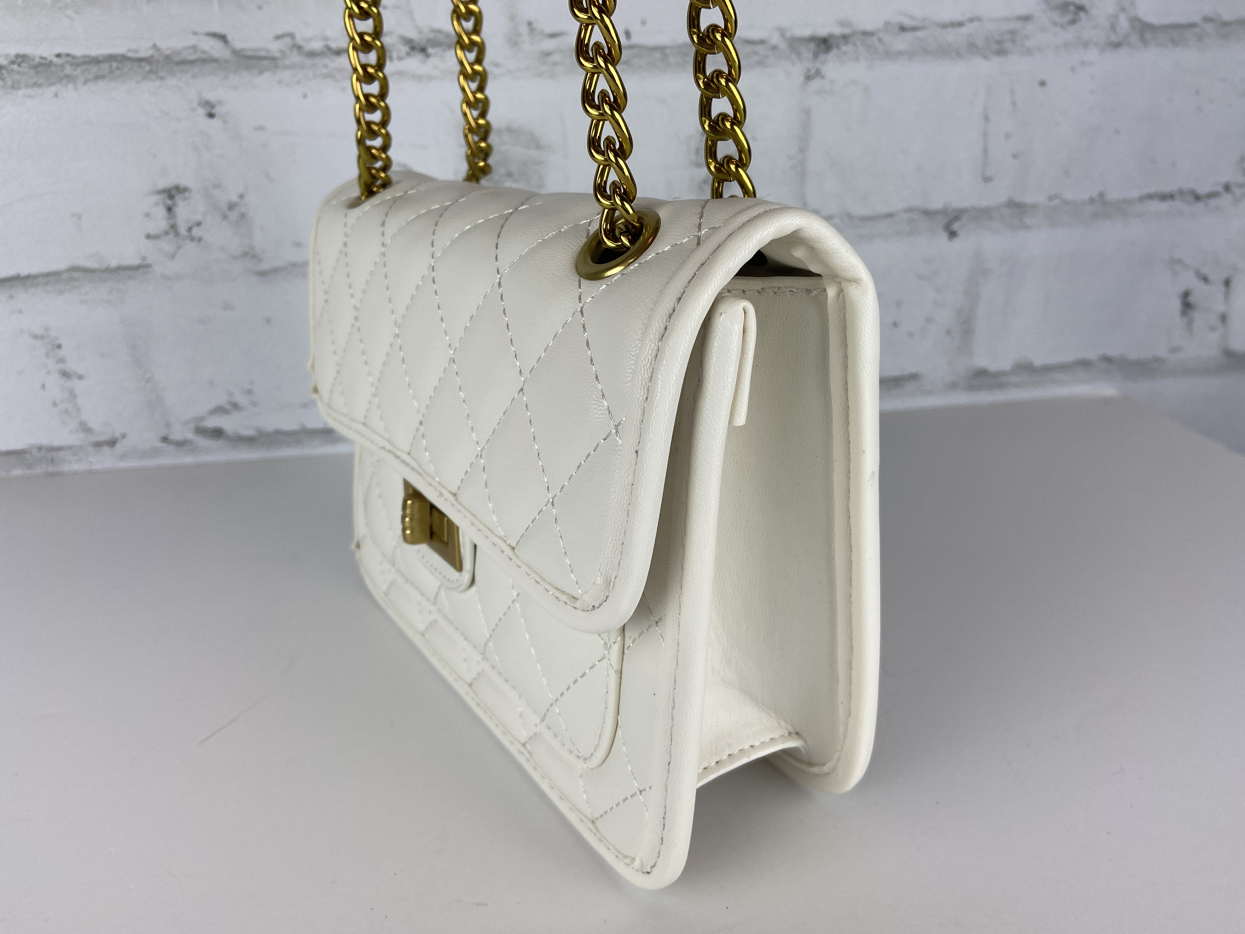 White quilted shoulder bag gold chain lozenge pattern embossed shoulder bag. Size 8.7 X 5.9 X 2.8 in. Premium vegan leather. Carefully crafted handbag with subtle details that give off its luxurious look for any occasion.